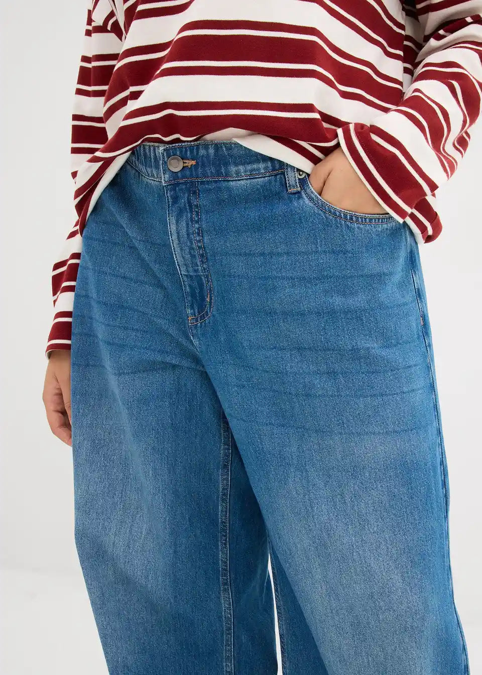 Široke kavbojke s 5 žepi z elastičnim udobnim pasom iz kompaktnega denima, ki je na začetku nekoliko tog, a postane z nošenjem mehkejši in bolj sproščen