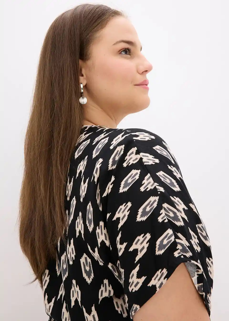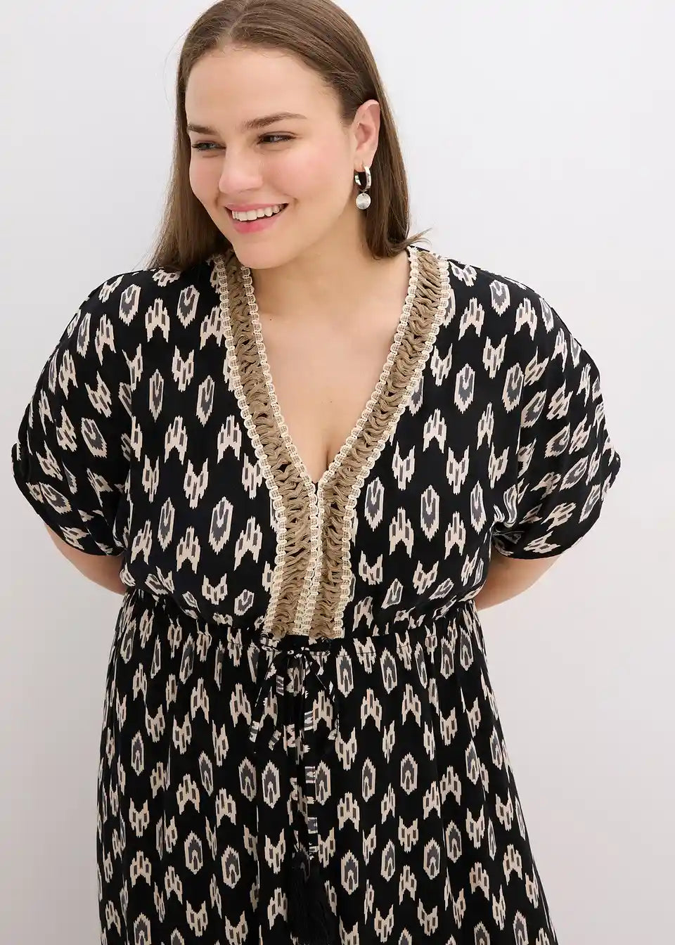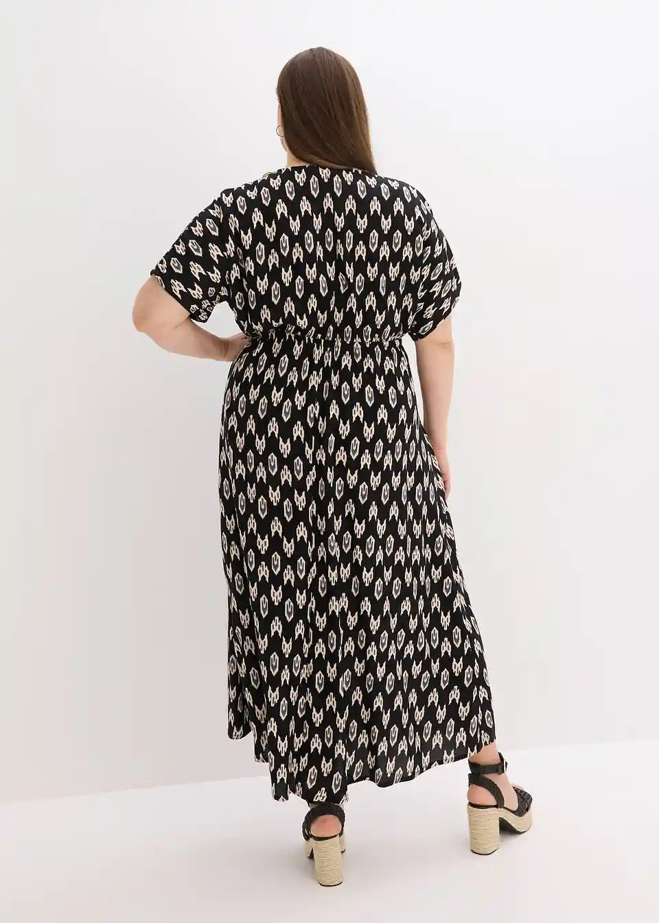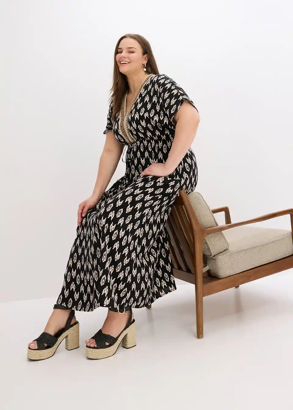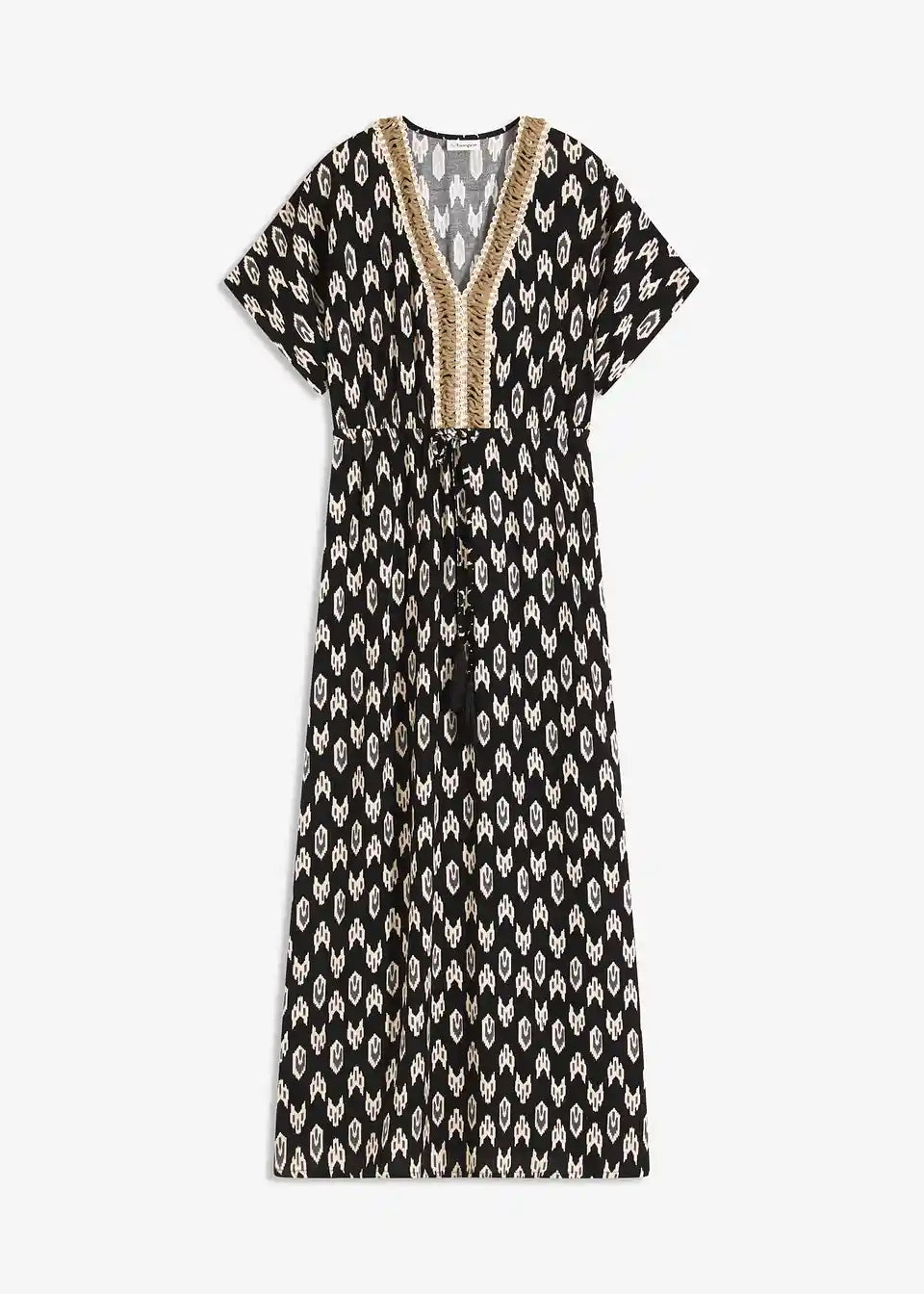 Potiskana dolga obleka iz padajoče viskoze z okrasno aplikacijo spredaj na izrezu