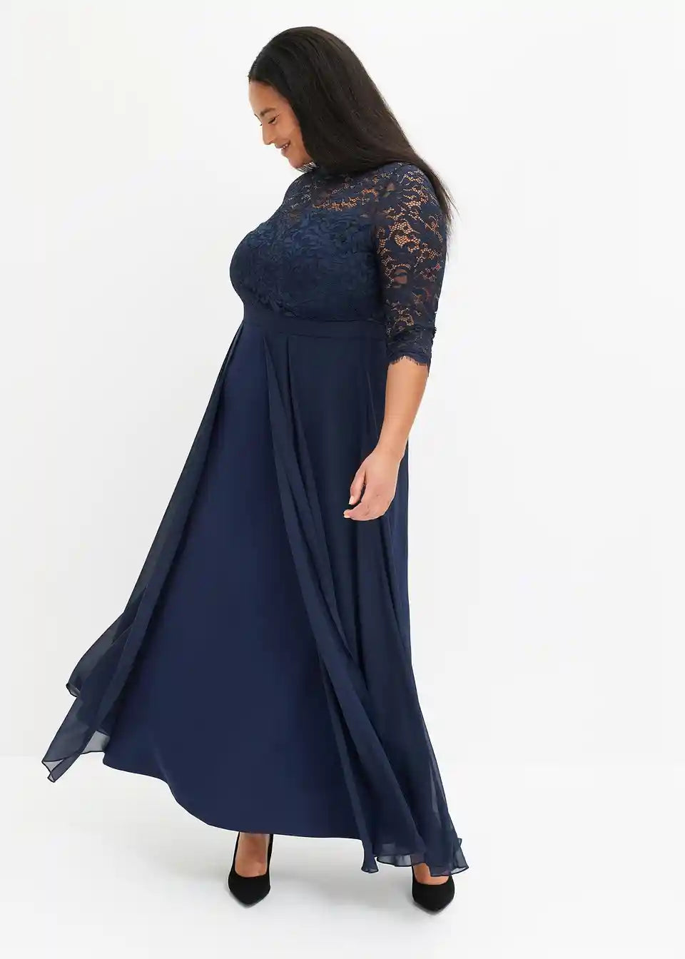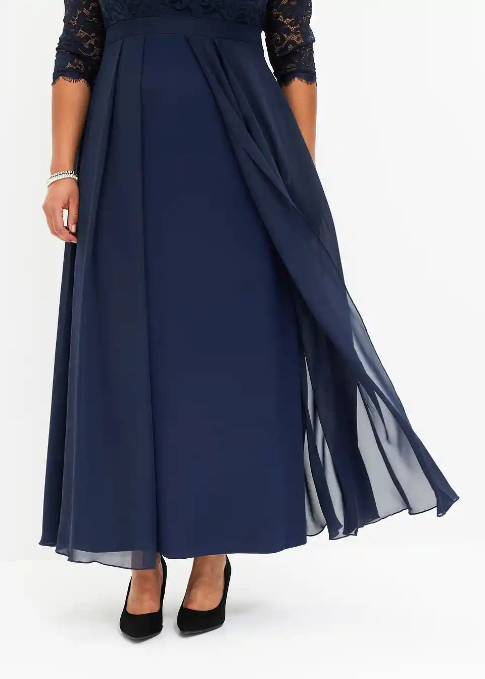 Očarljiva svečana obleka s čipko v zgornjem delu in krilom iz strukturiranega krepa ter nadkrilom iz finega šifona.