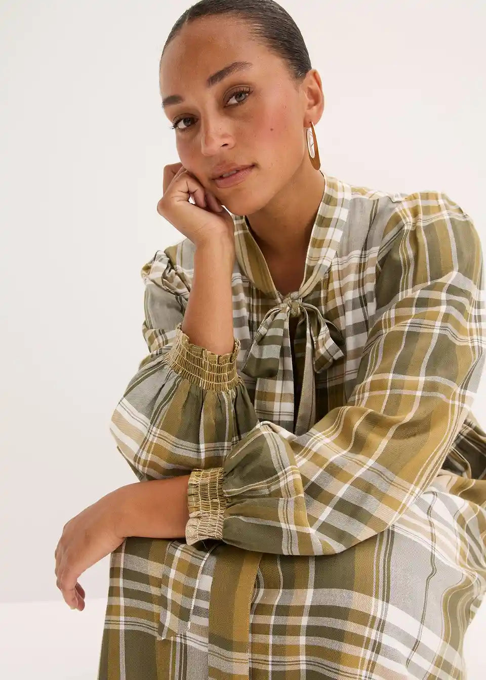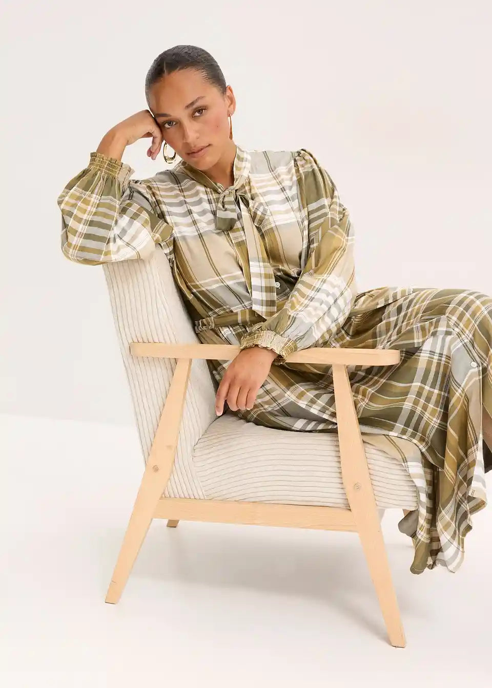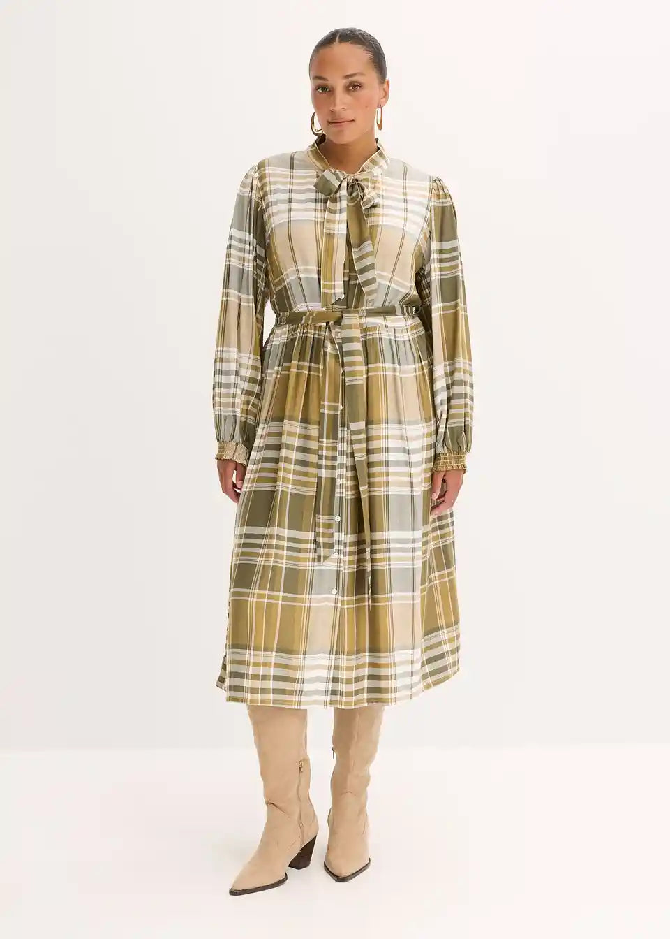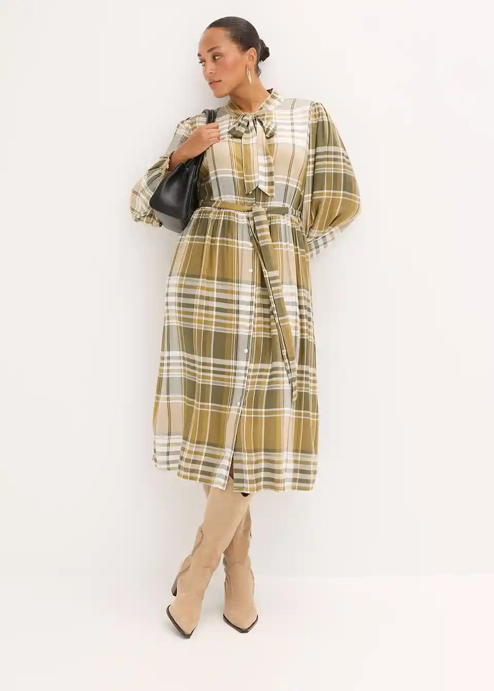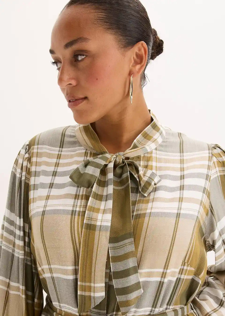 Ženstvena srajčna obleka v midi dolžini s pentljo na izrezu in modnim karirastim vzorcem