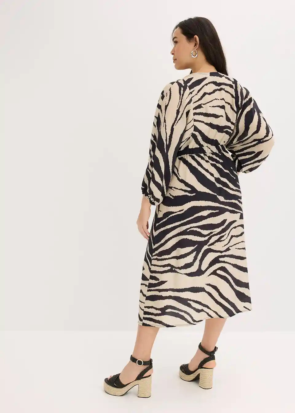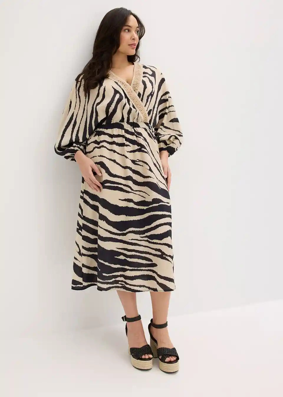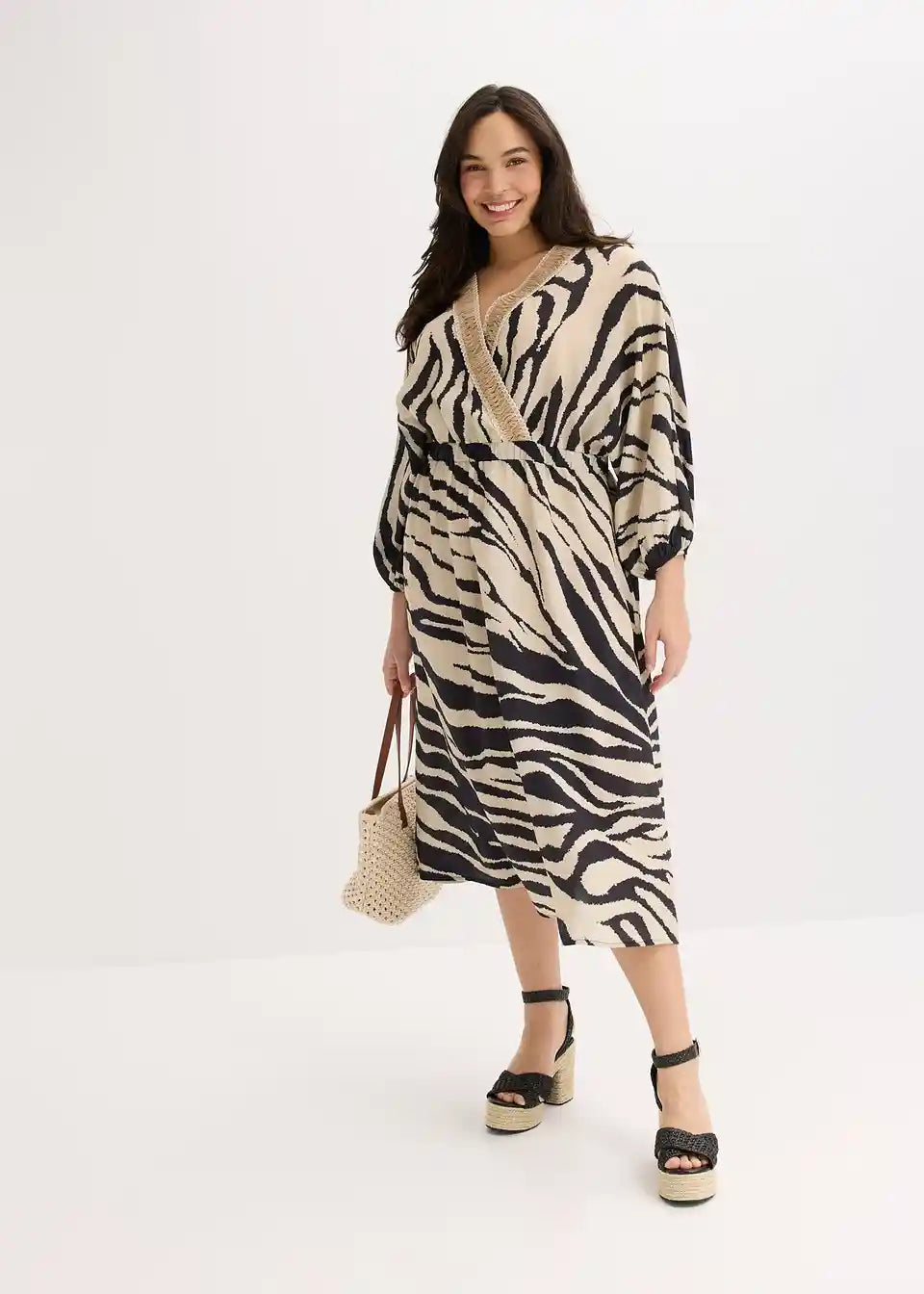 modno potiskan midikleid iz tekoče mešanice viskoze z dekorativno aplikacijo vzdolž izreza spredaj