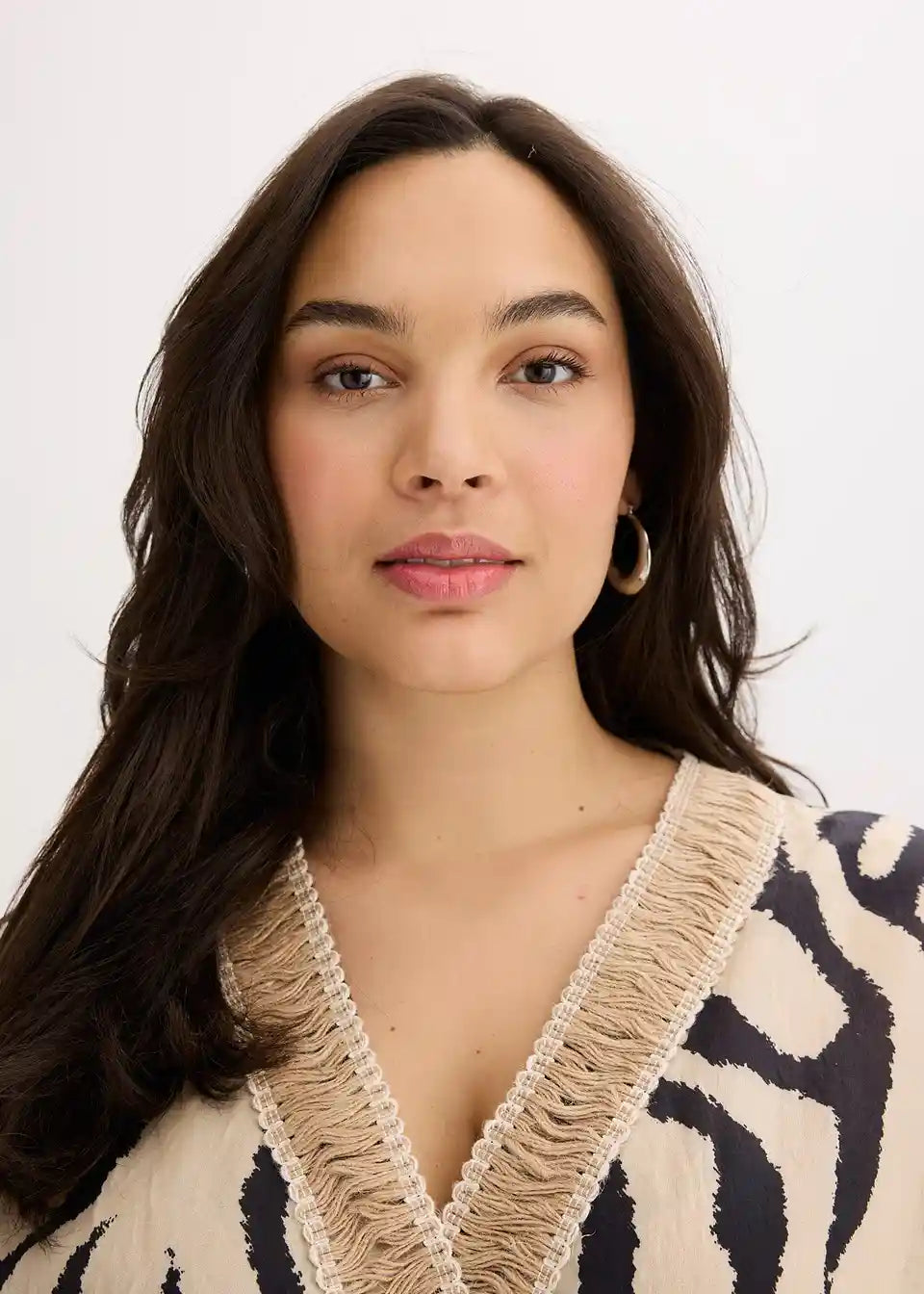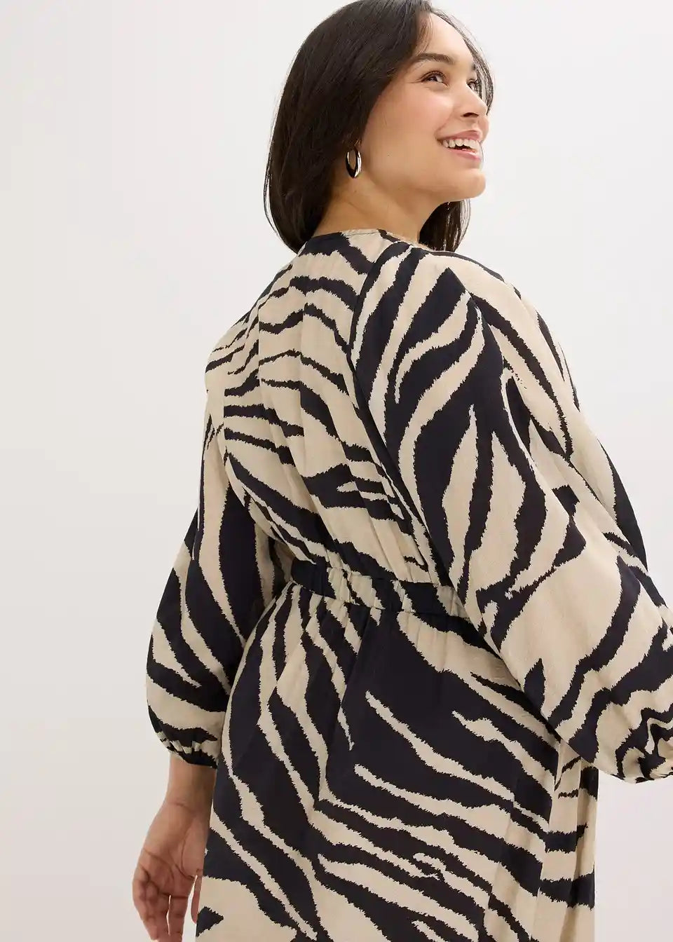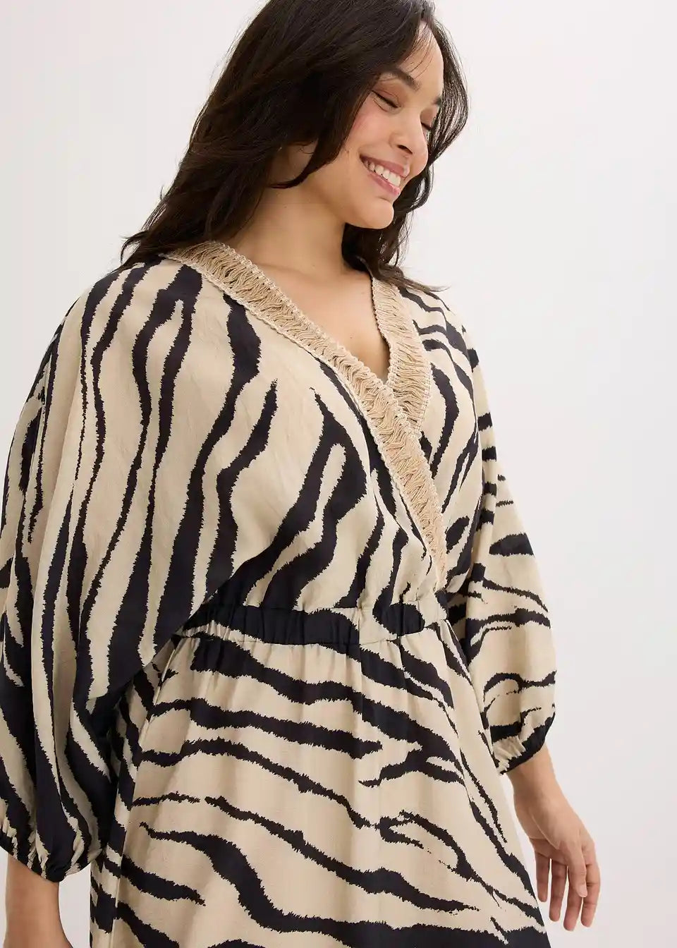 modno potiskan midikleid iz tekoče mešanice viskoze z dekorativno aplikacijo vzdolž izreza spredaj