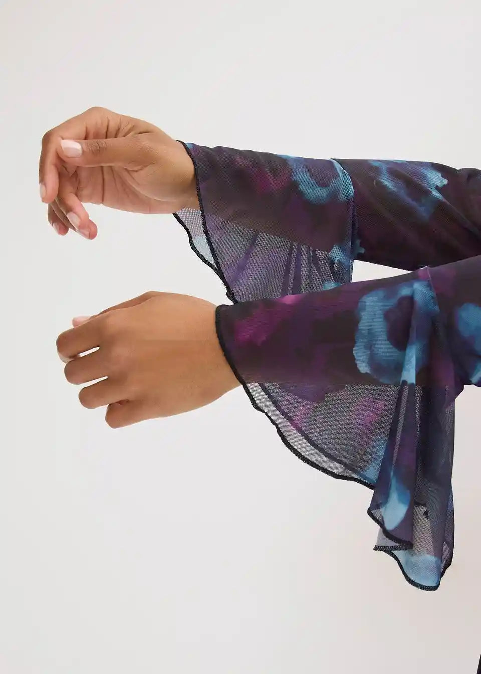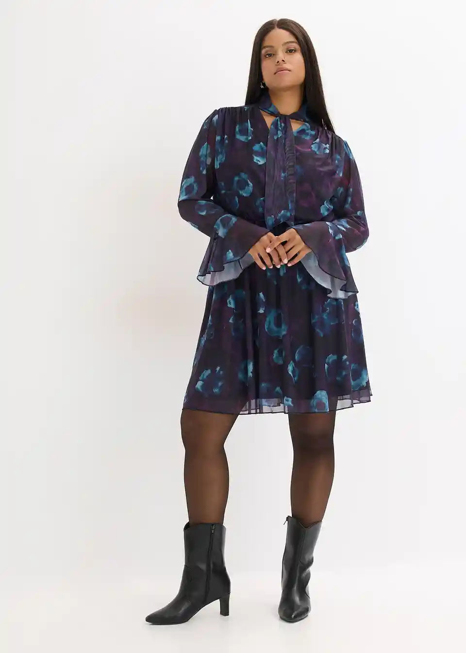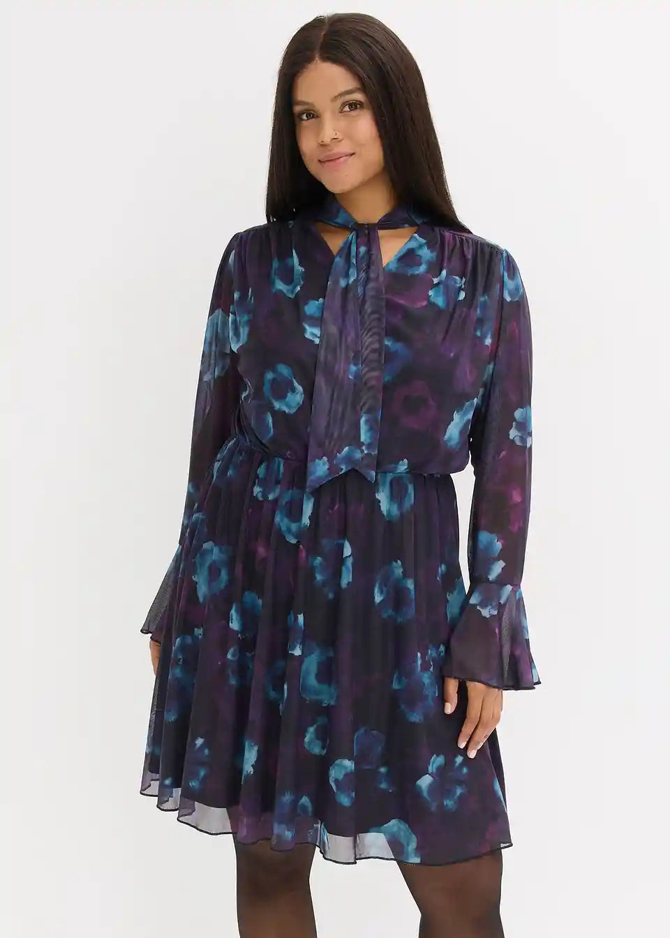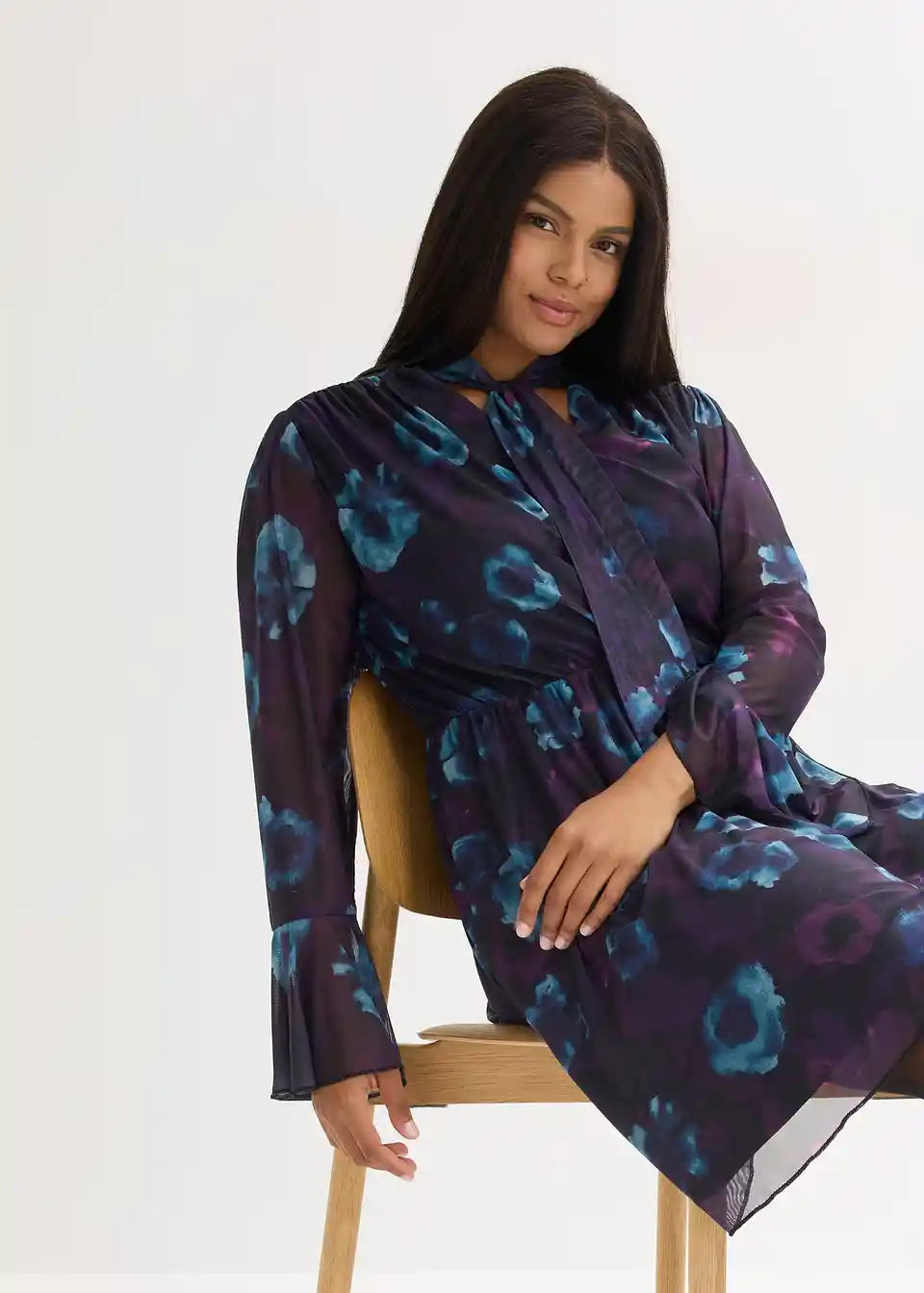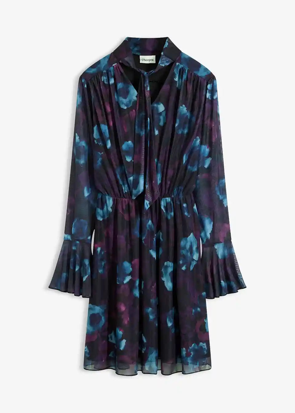 Potiskana obleka iz mehke mreže s pentljo na izrezu spredaj in volani na robu rokavov