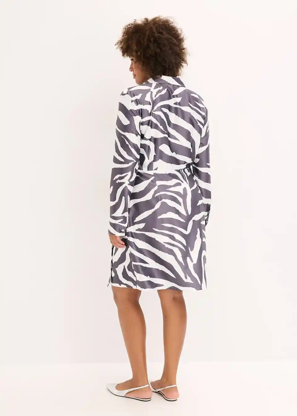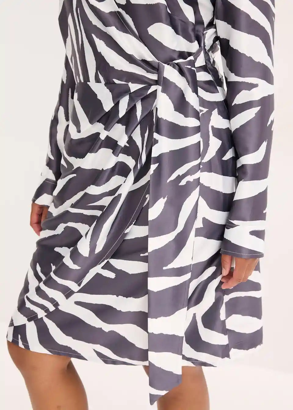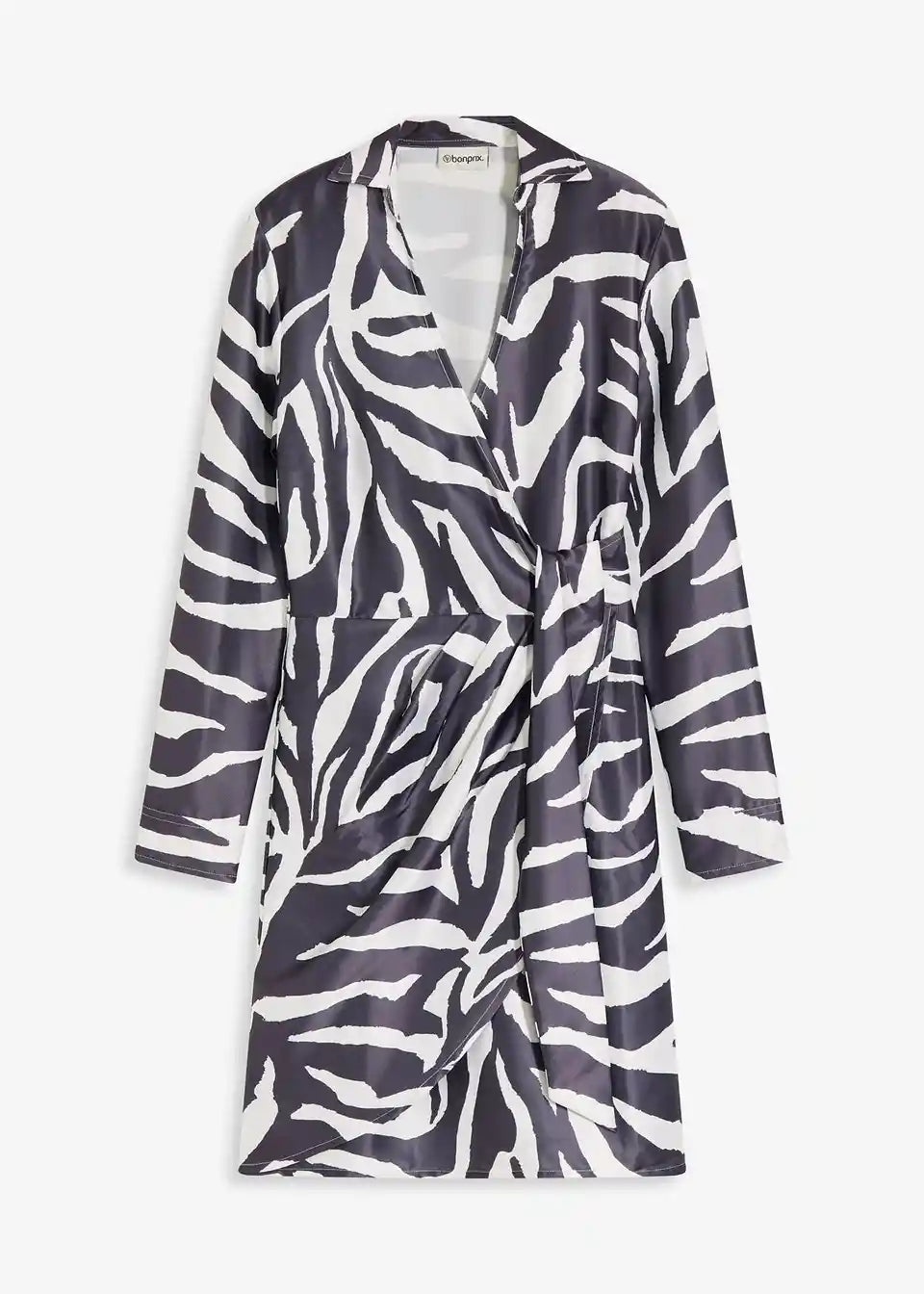 Ženstvena ovita obleka iz padajočega satena z modnim živalskim potiskom
