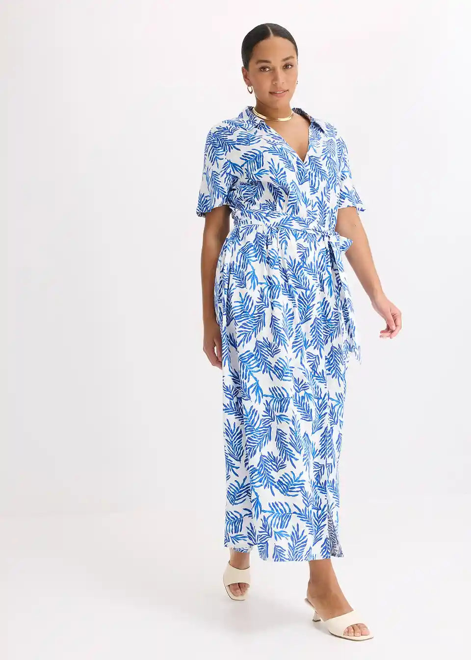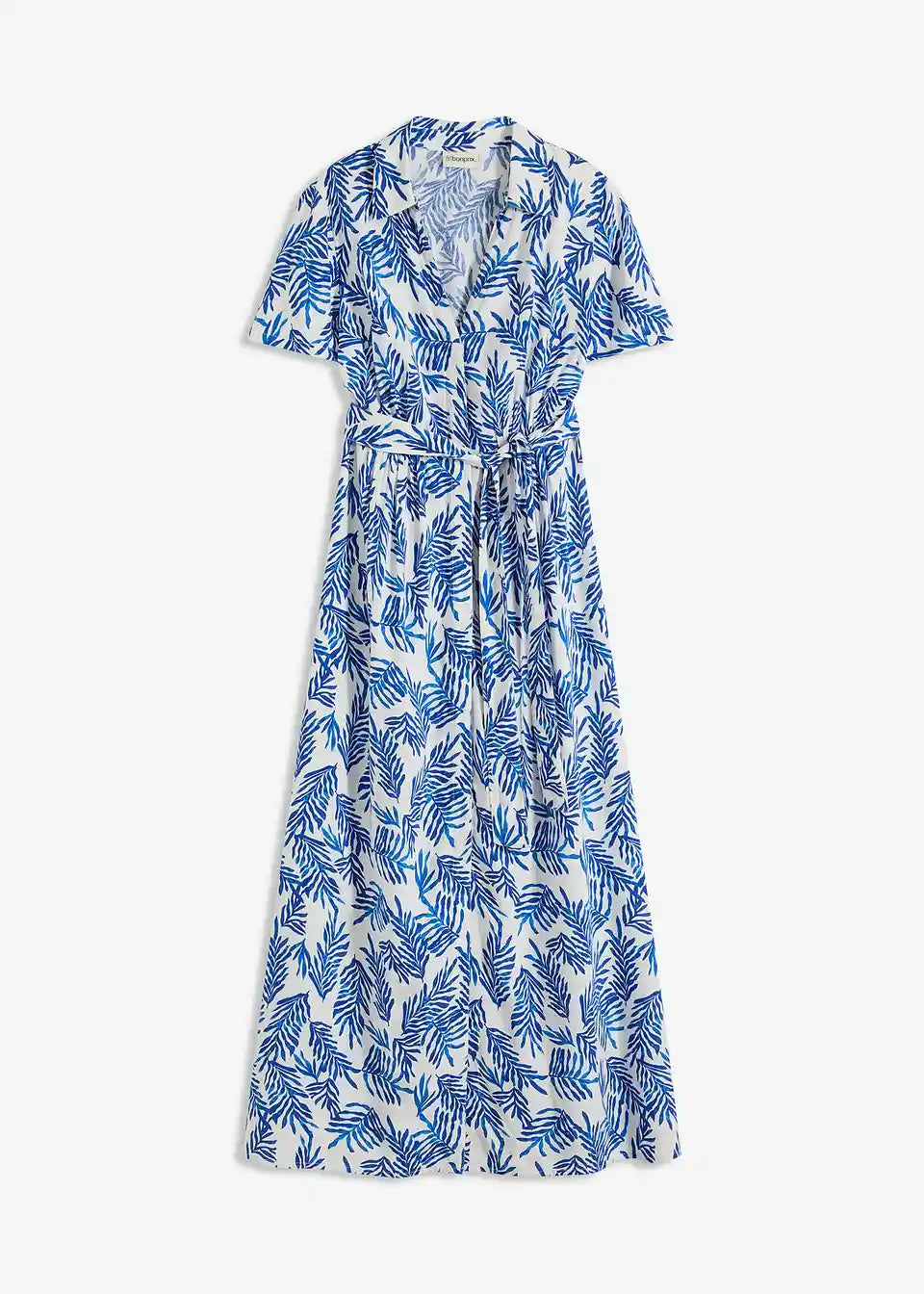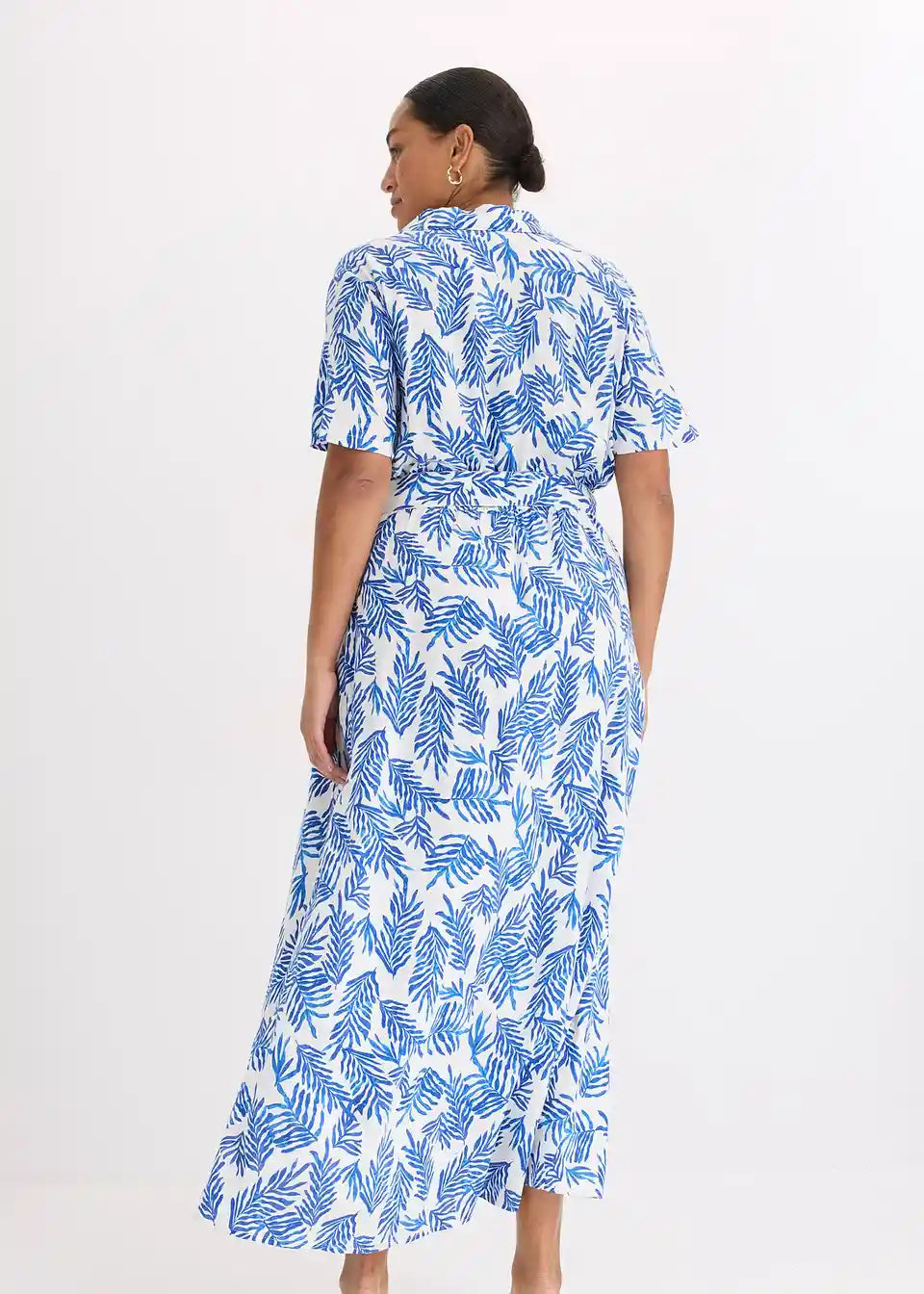 Modno potiskana dolga obleka z letvijo za zapenjanje spredaj in trakom za zavezovanje v pasu