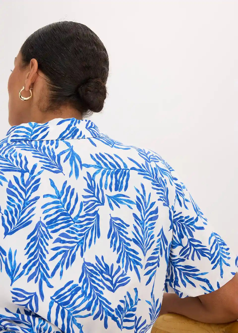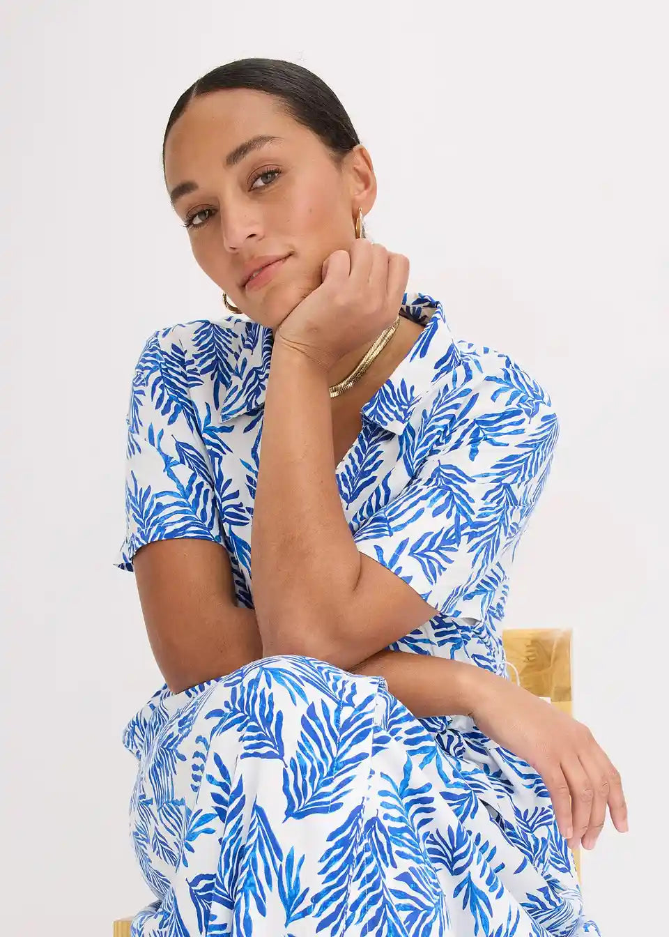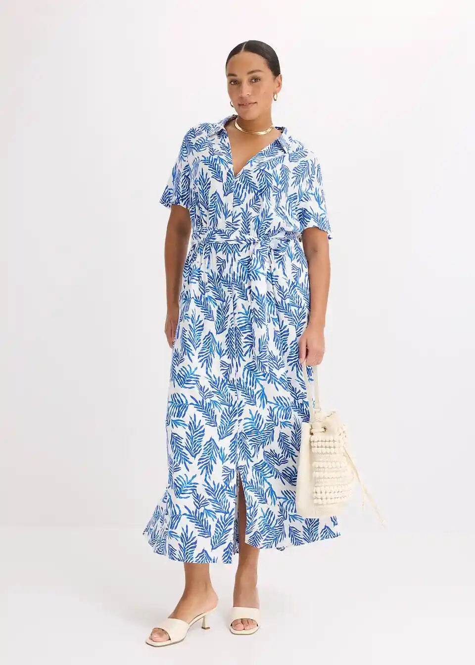 Modno potiskana dolga obleka z letvijo za zapenjanje spredaj in trakom za zavezovanje v pasu