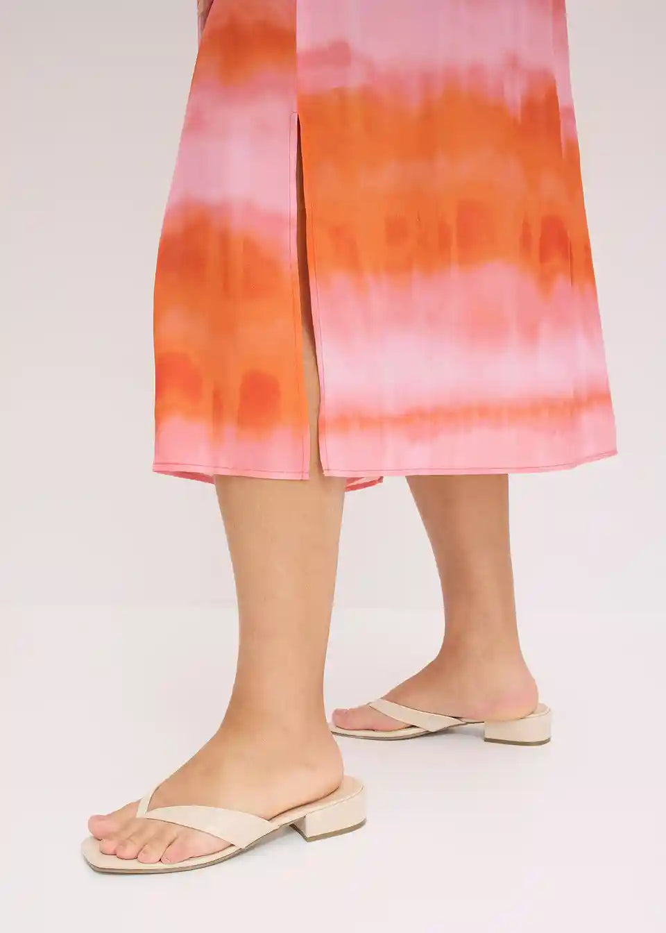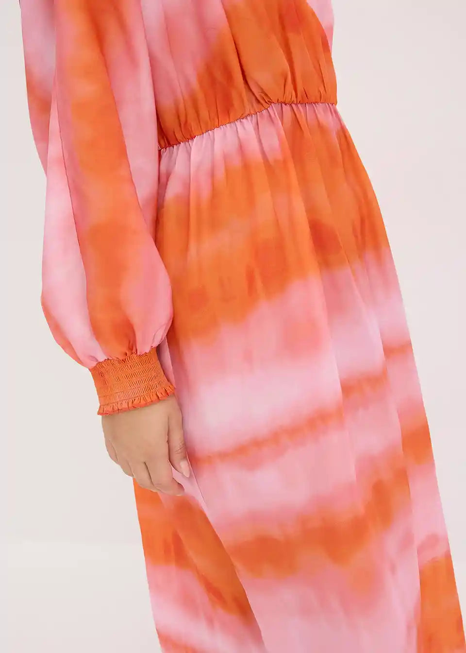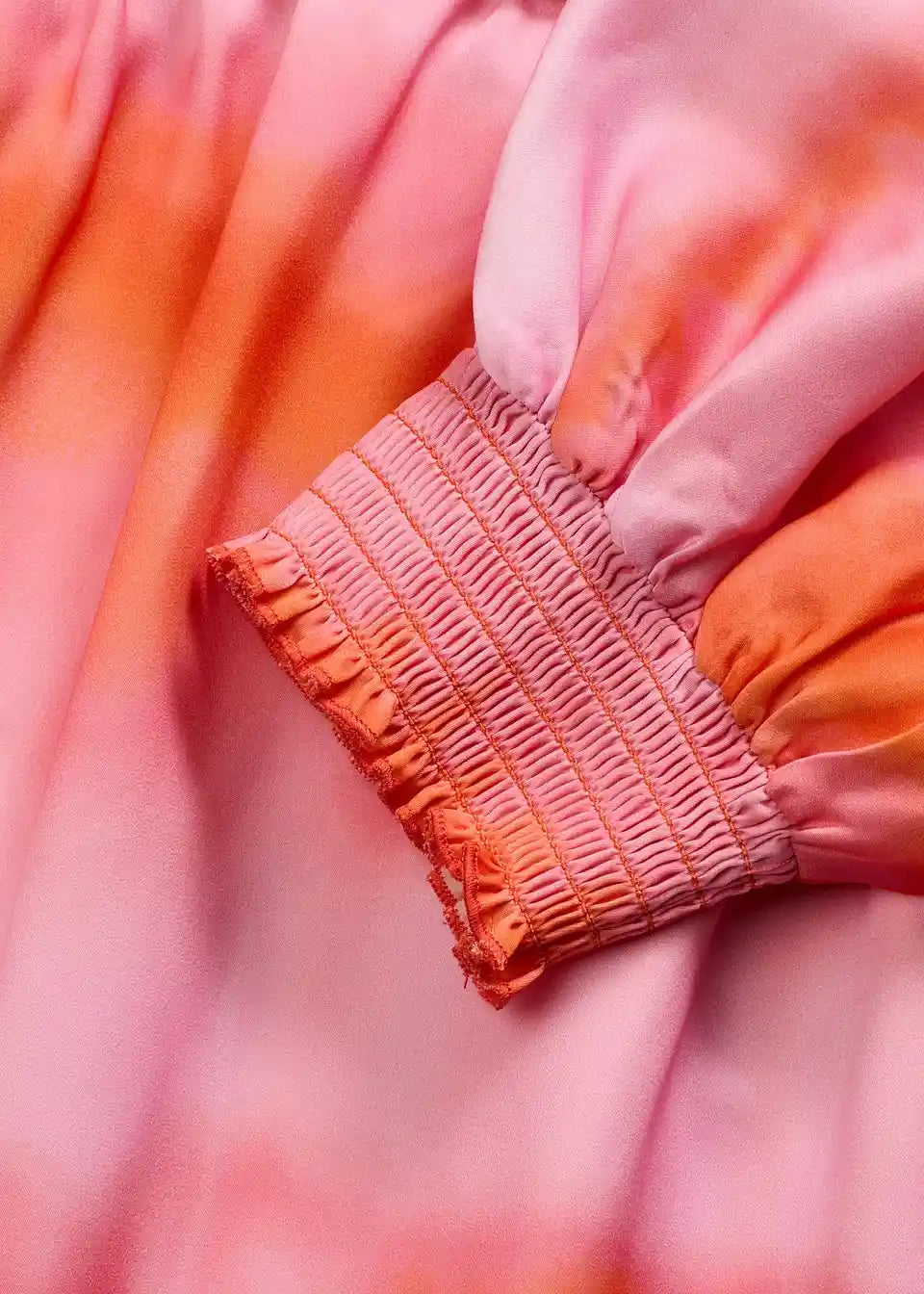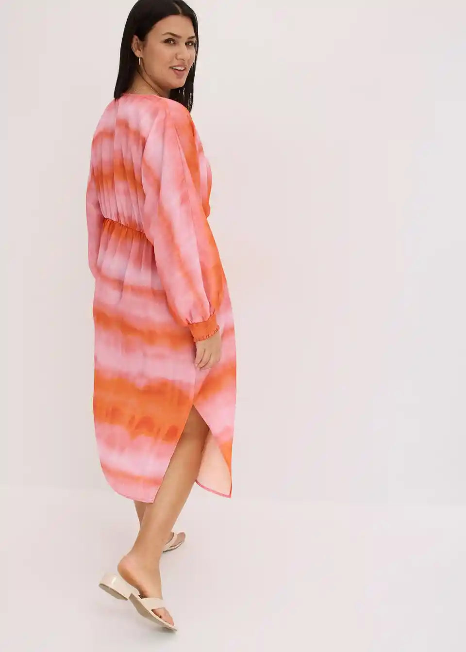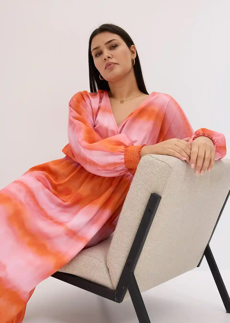 Potiskano midi krilo iz tekočega satena s poletnim batik potiskom in širokimi rokavi