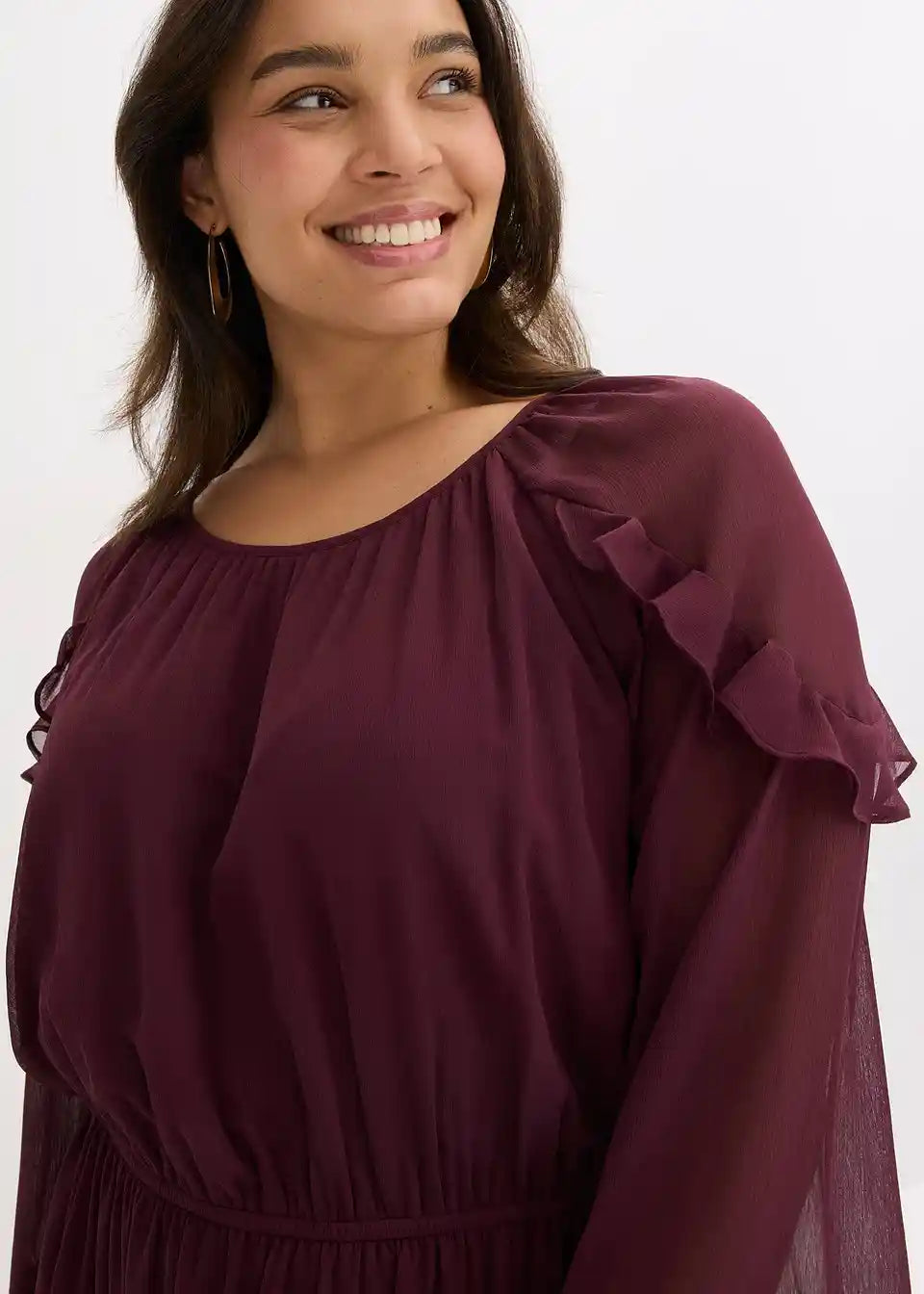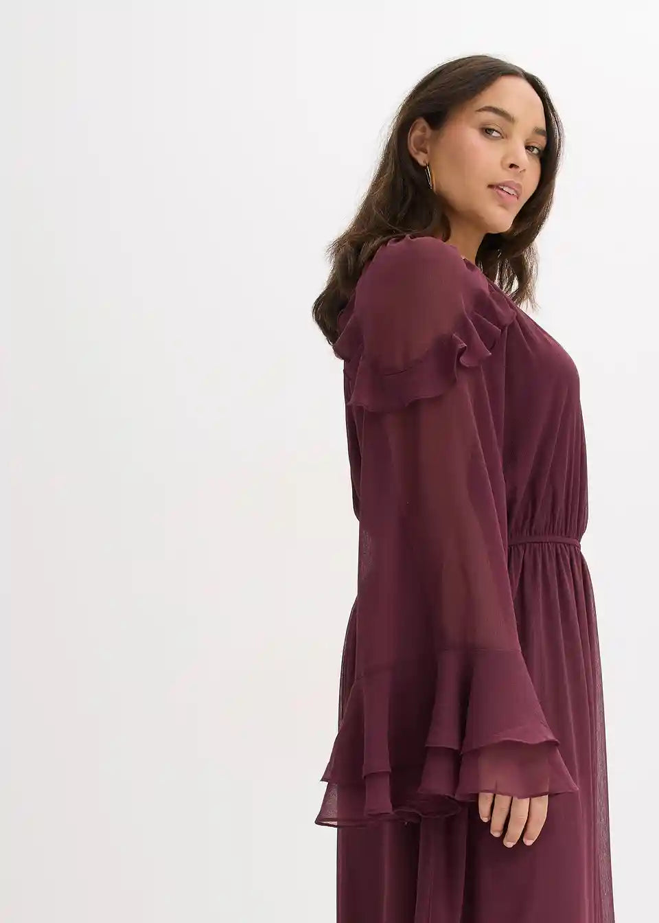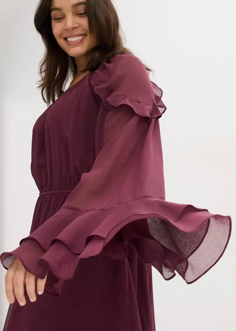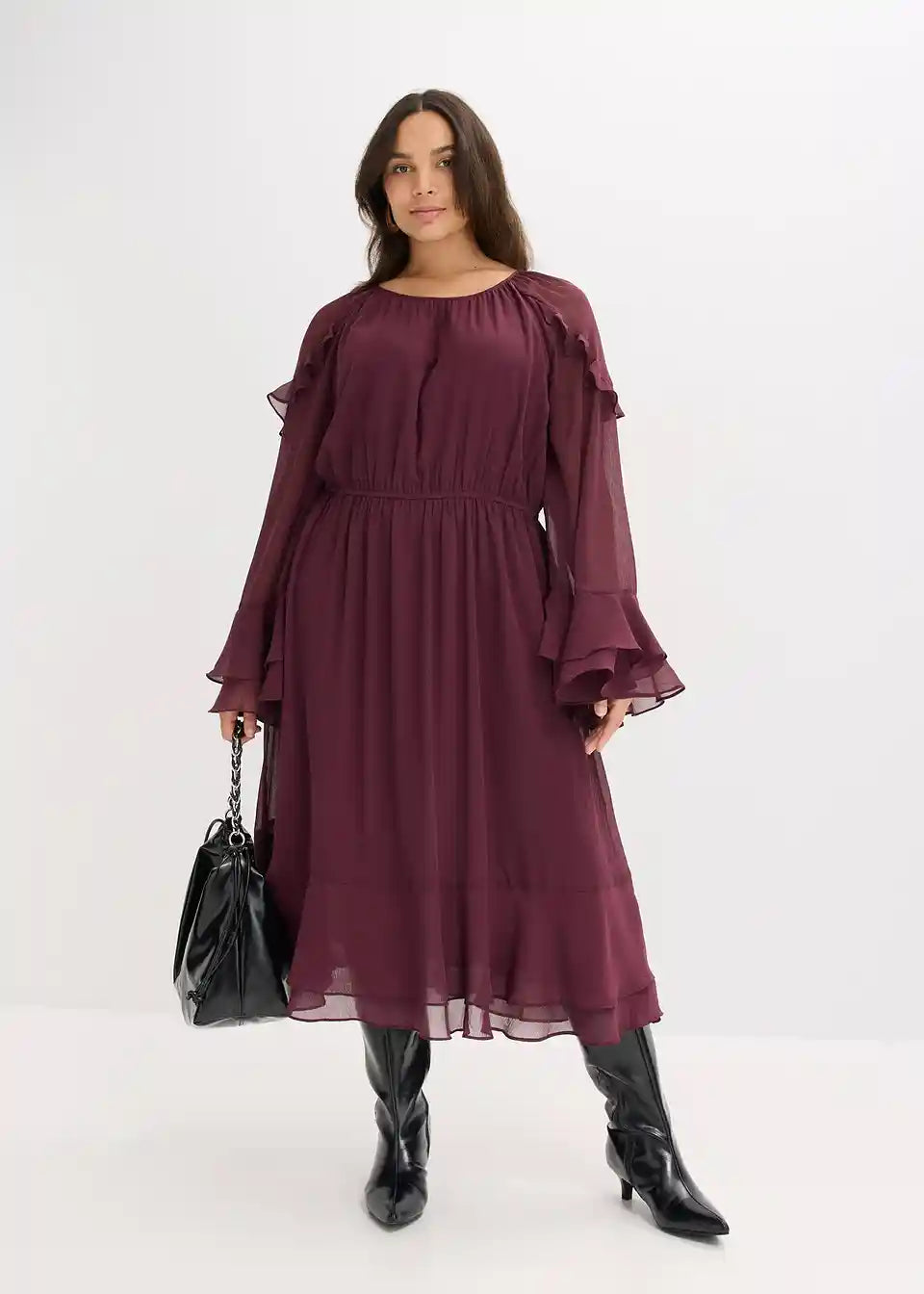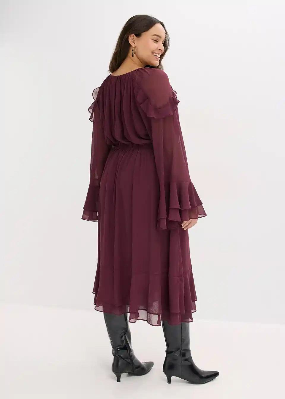 Moderna obleka iz šifona v midi dolžini z volani na rokavih in na robu krila