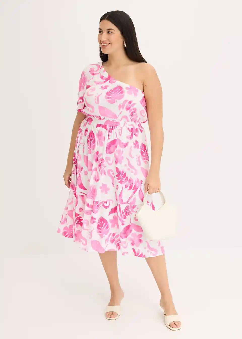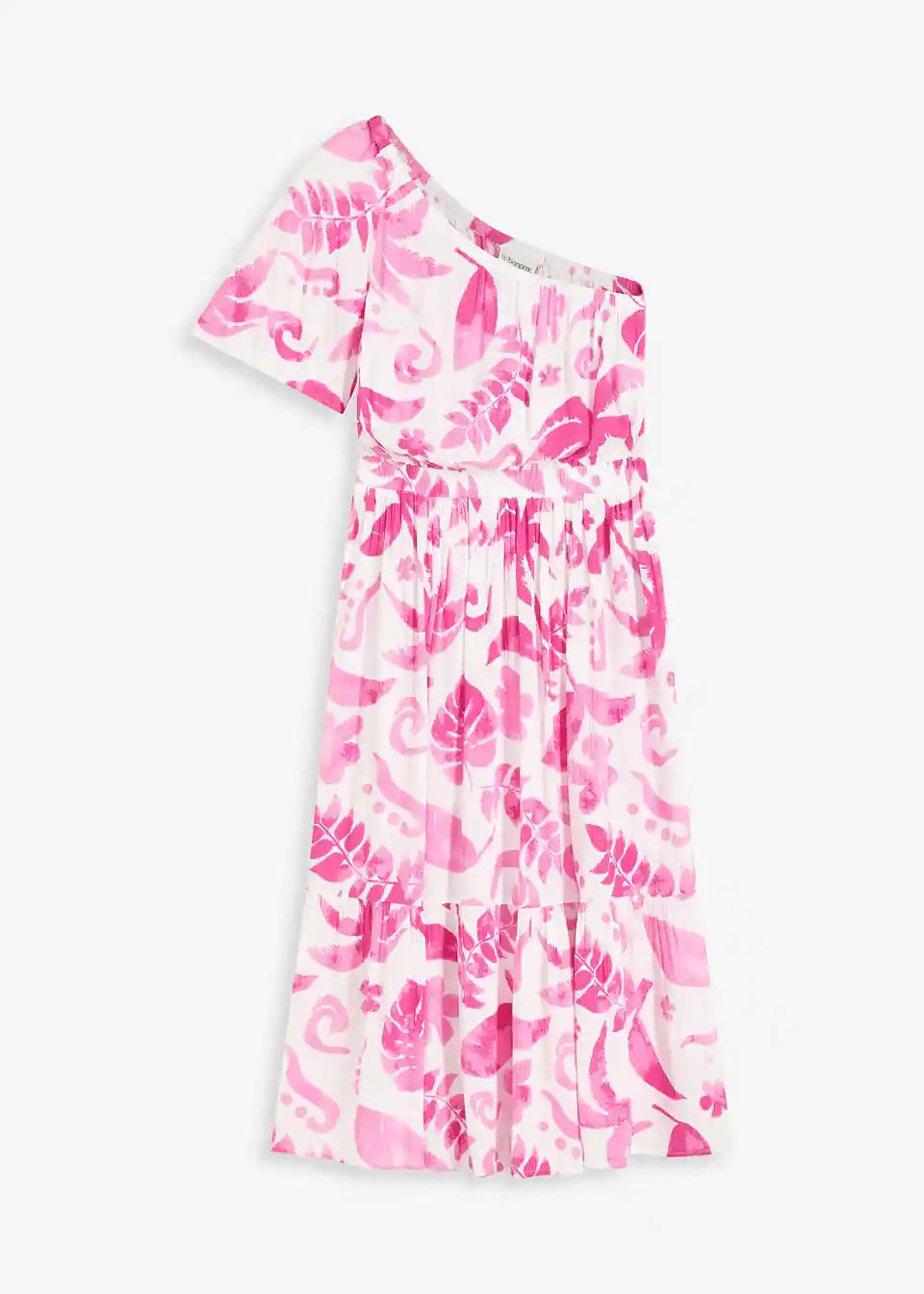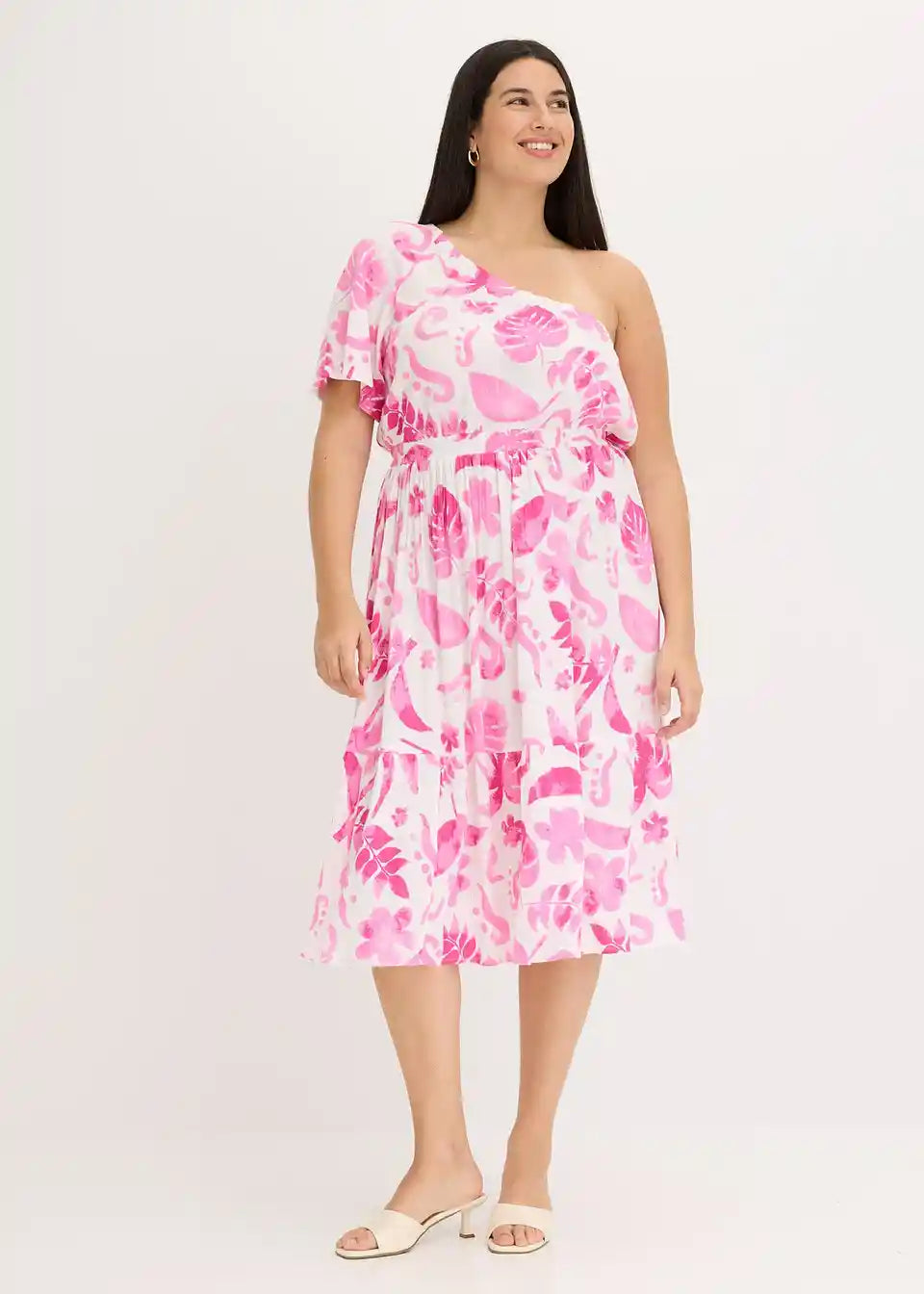 cvetlično tiskana One-Shoulder obleka srednje dolžine iz strukturirane viskoze s širokim krilnim rokavom in volančkom na robu krila