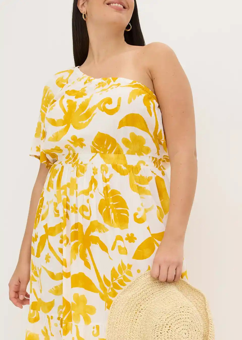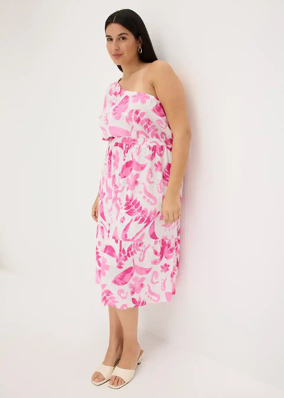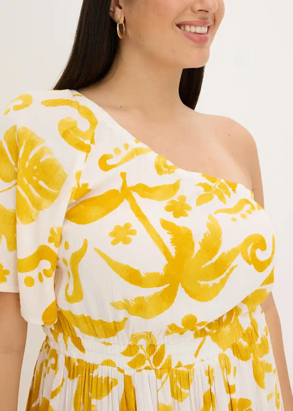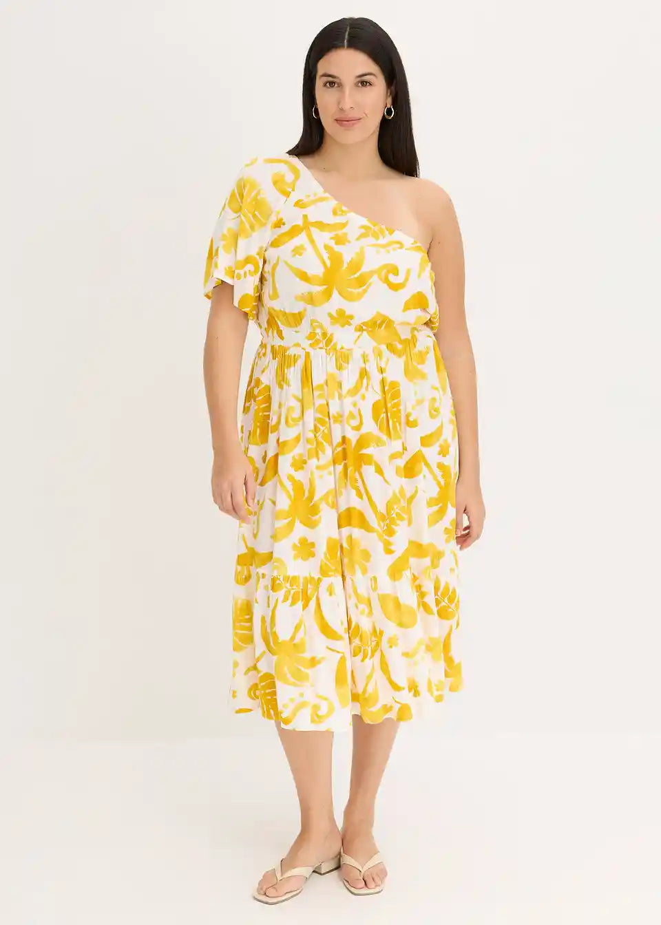cvetlično tiskana One-Shoulder obleka srednje dolžine iz strukturirane viskoze s širokim krilnim rokavom in volančkom na robu krila
