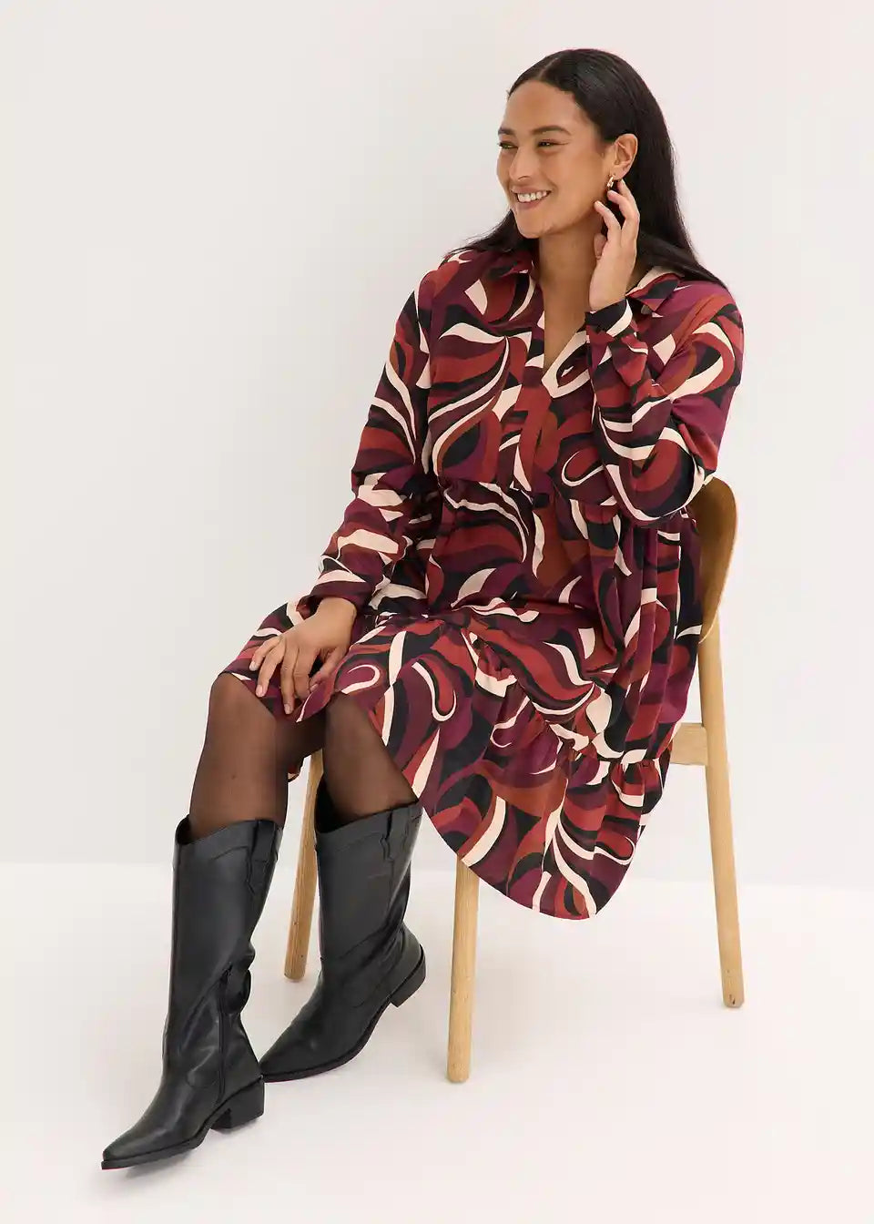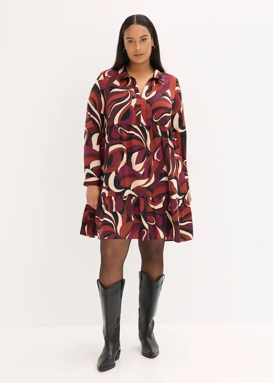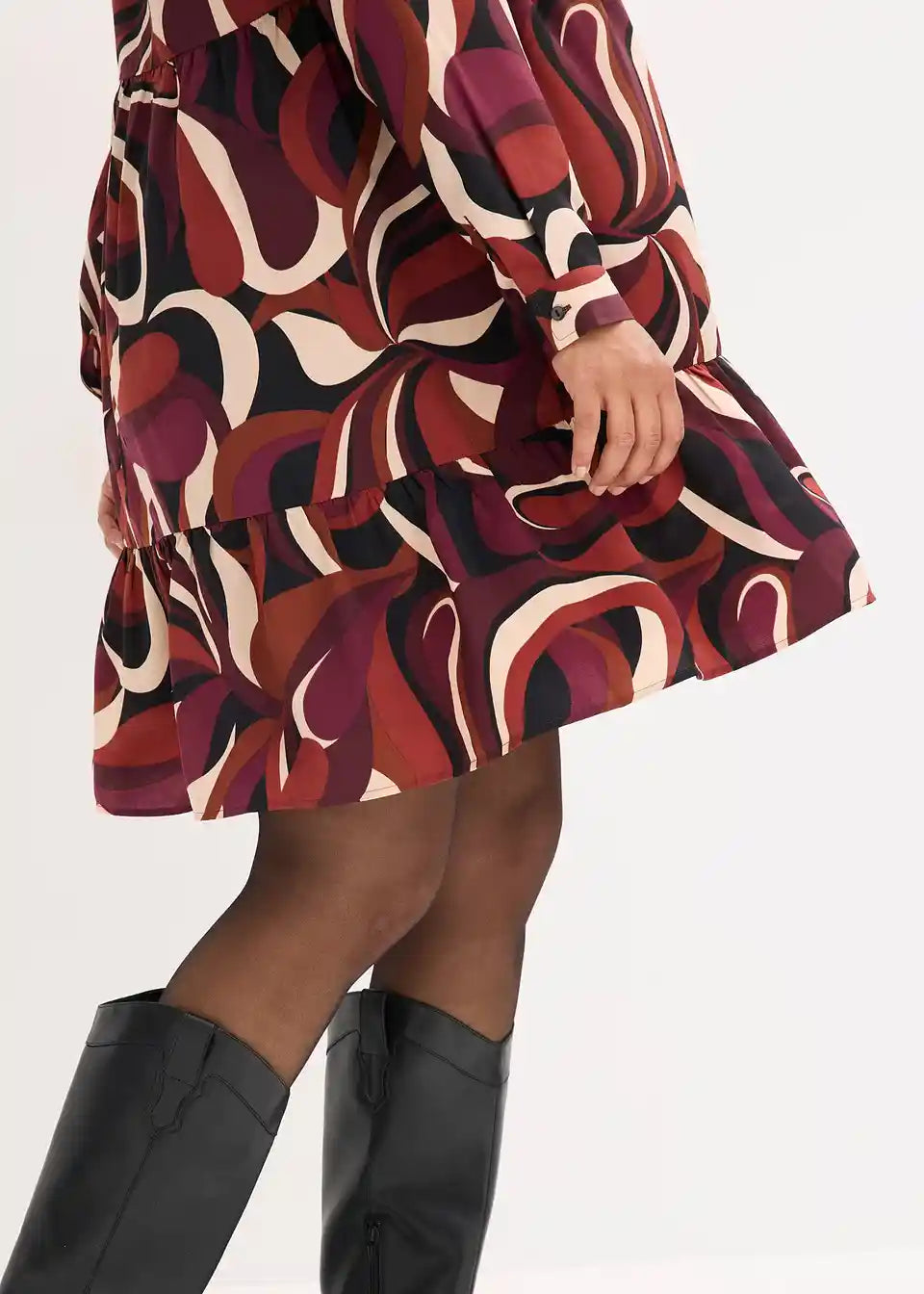 Obleka v kroju tunike iz padajočega satena z modnim potiskom