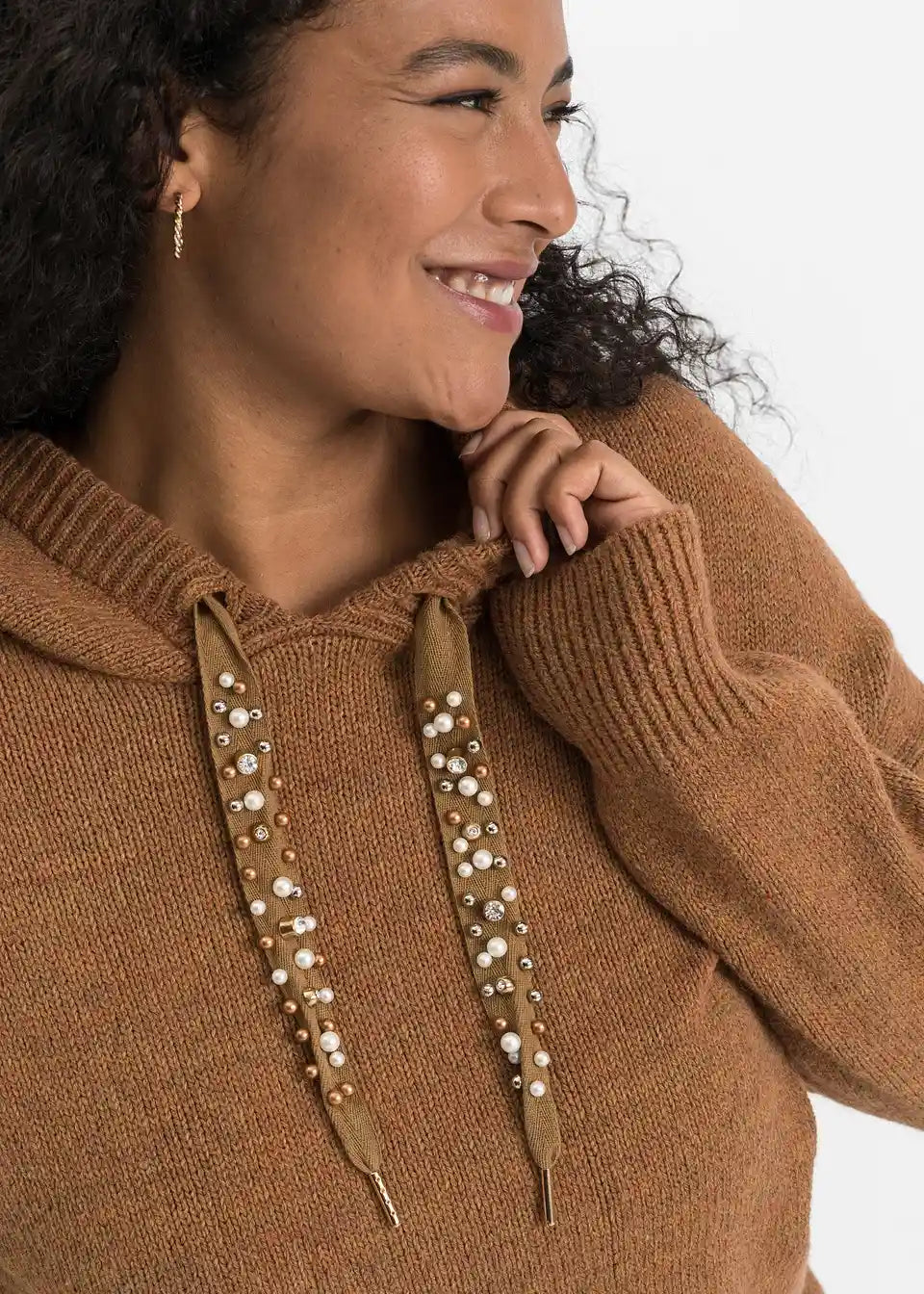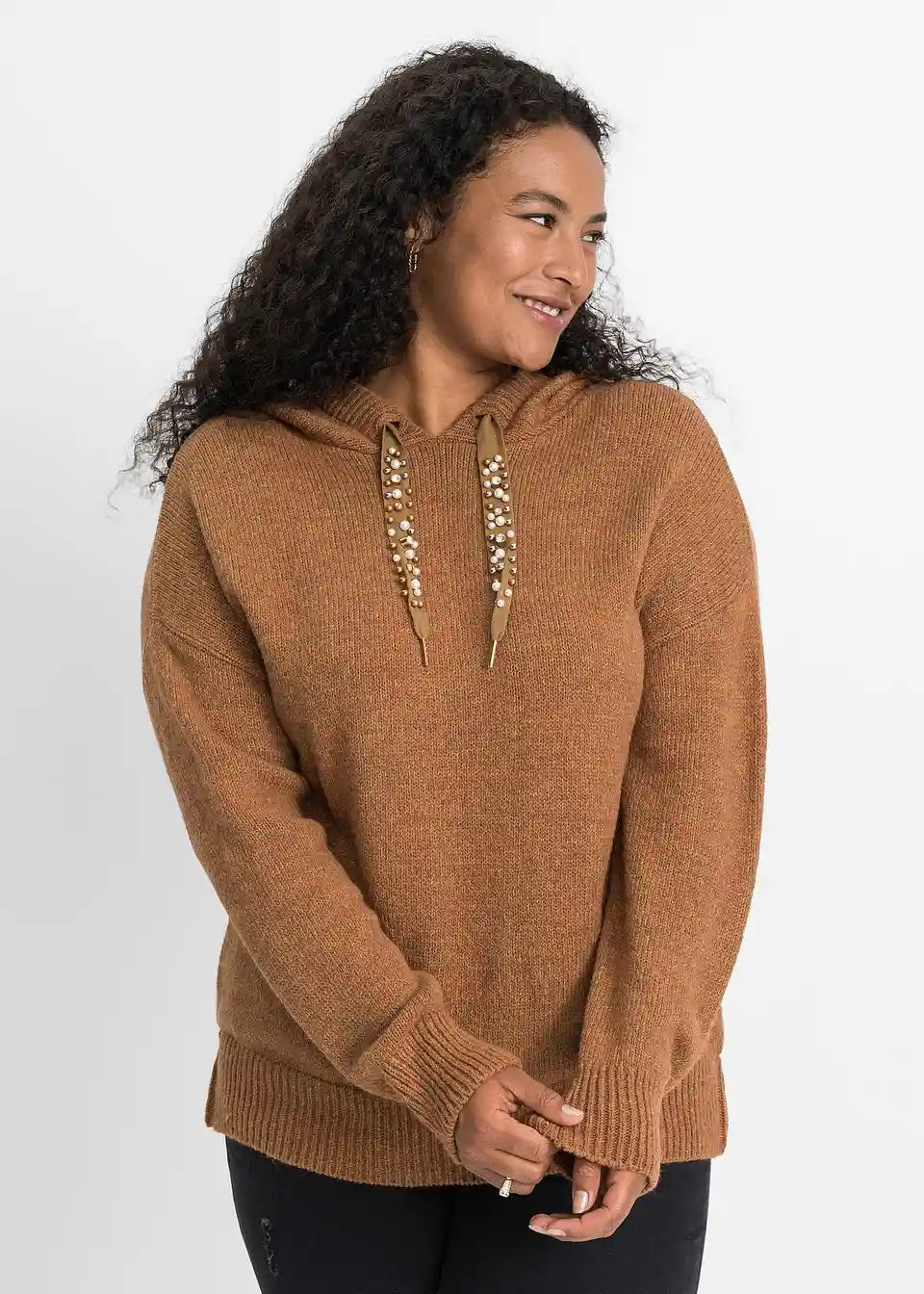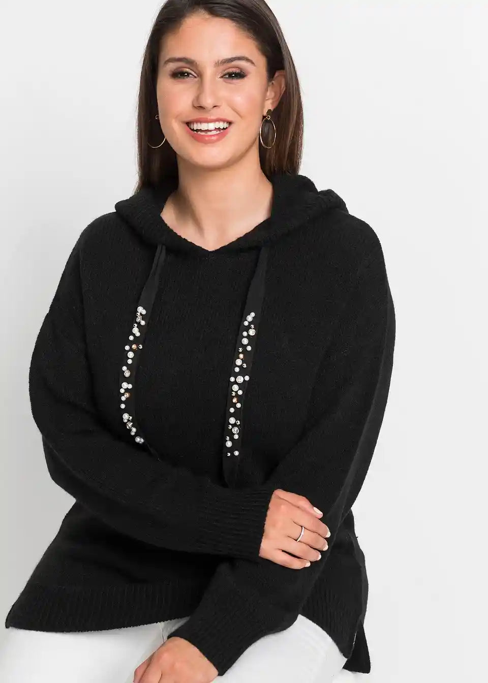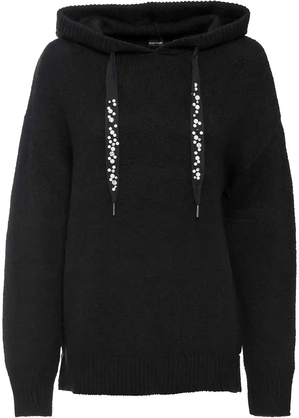 Stilski mali detajli dajejo temu sproščenemu puloverju s kapuco poseben videz. Model znamke BODYFLIRT očara z lahkotnim krojem z dolgimi rokavi, ki sega do bokov. Posebnost so trakovi na kapuci, okrašeni z okrasnimi kamenčki, ki videzu dodajo kanček glamurja.