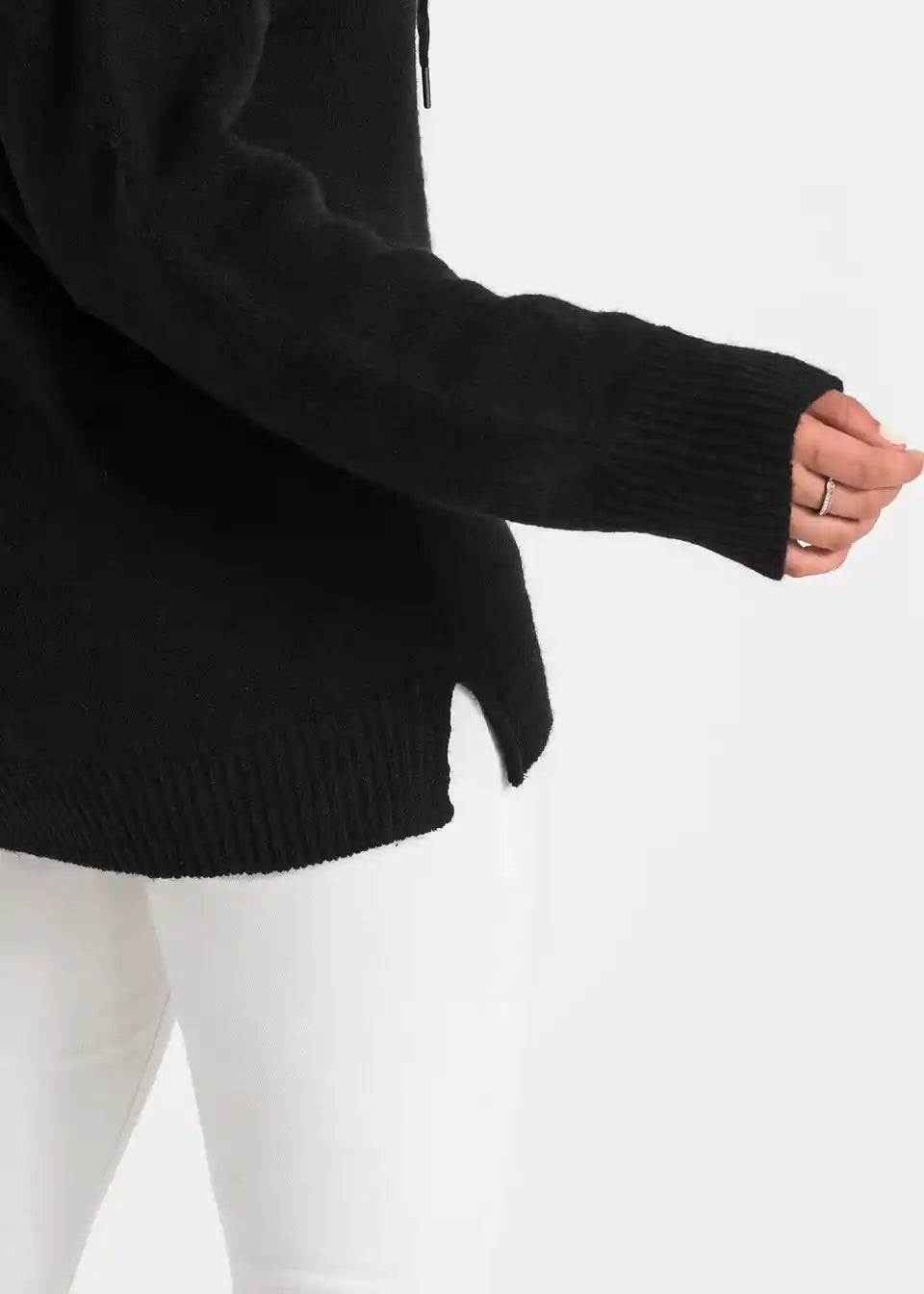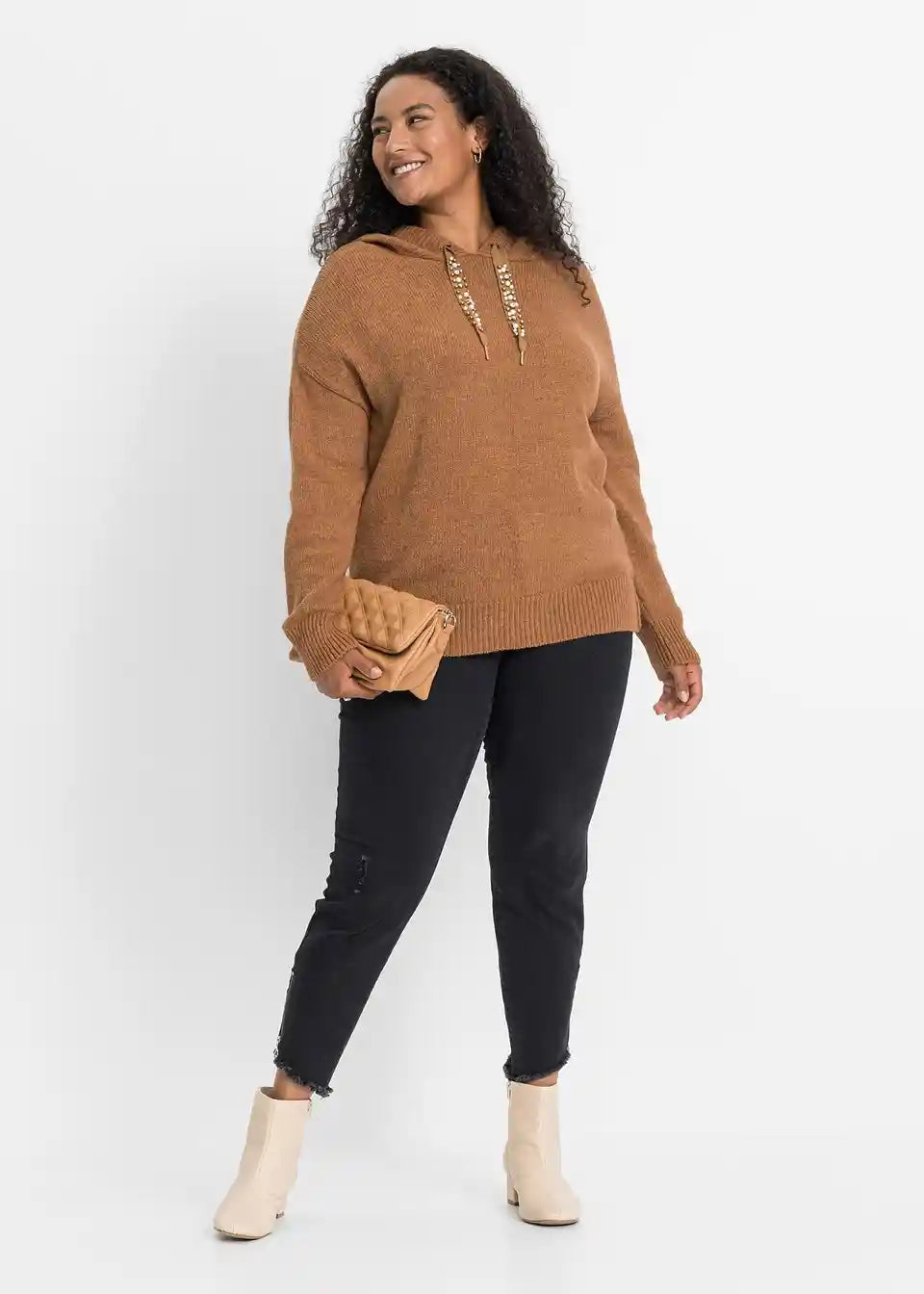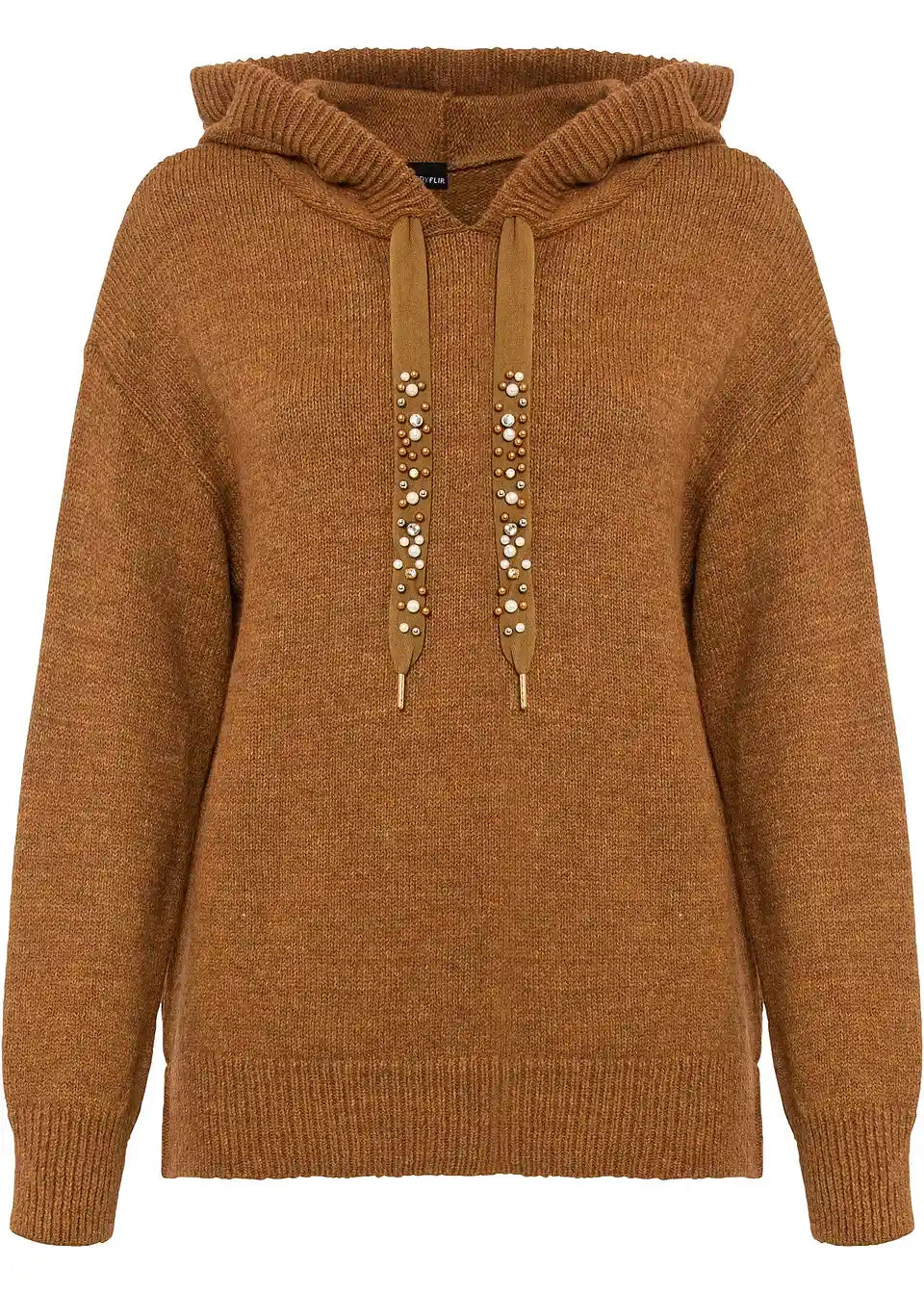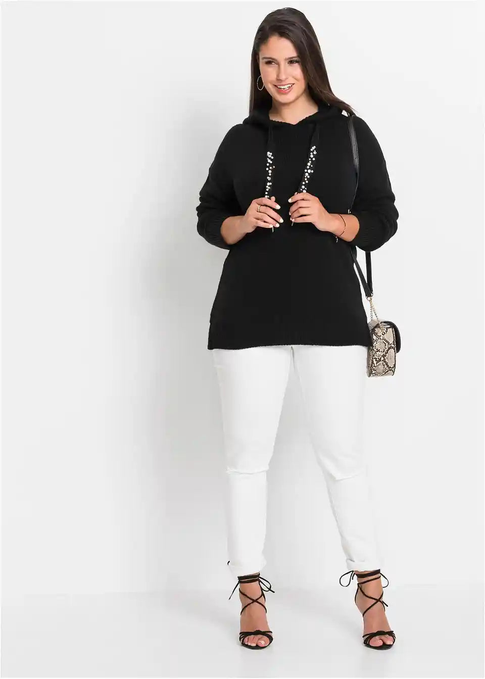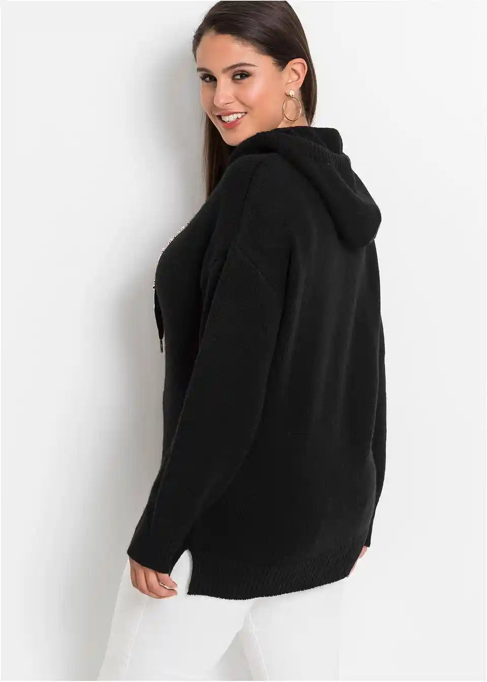 Stilski mali detajli dajejo temu sproščenemu puloverju s kapuco poseben videz. Model znamke BODYFLIRT očara z lahkotnim krojem z dolgimi rokavi, ki sega do bokov. Posebnost so trakovi na kapuci, okrašeni z okrasnimi kamenčki, ki videzu dodajo kanček glamurja.