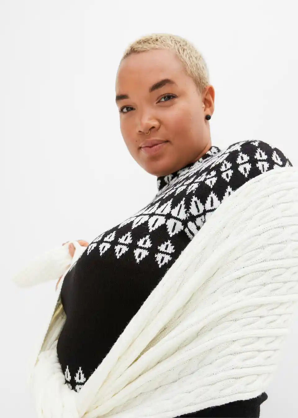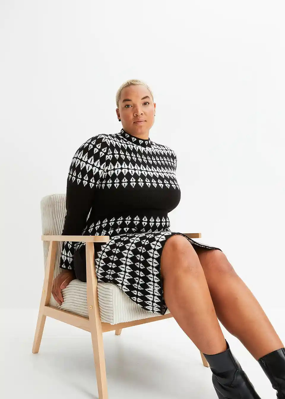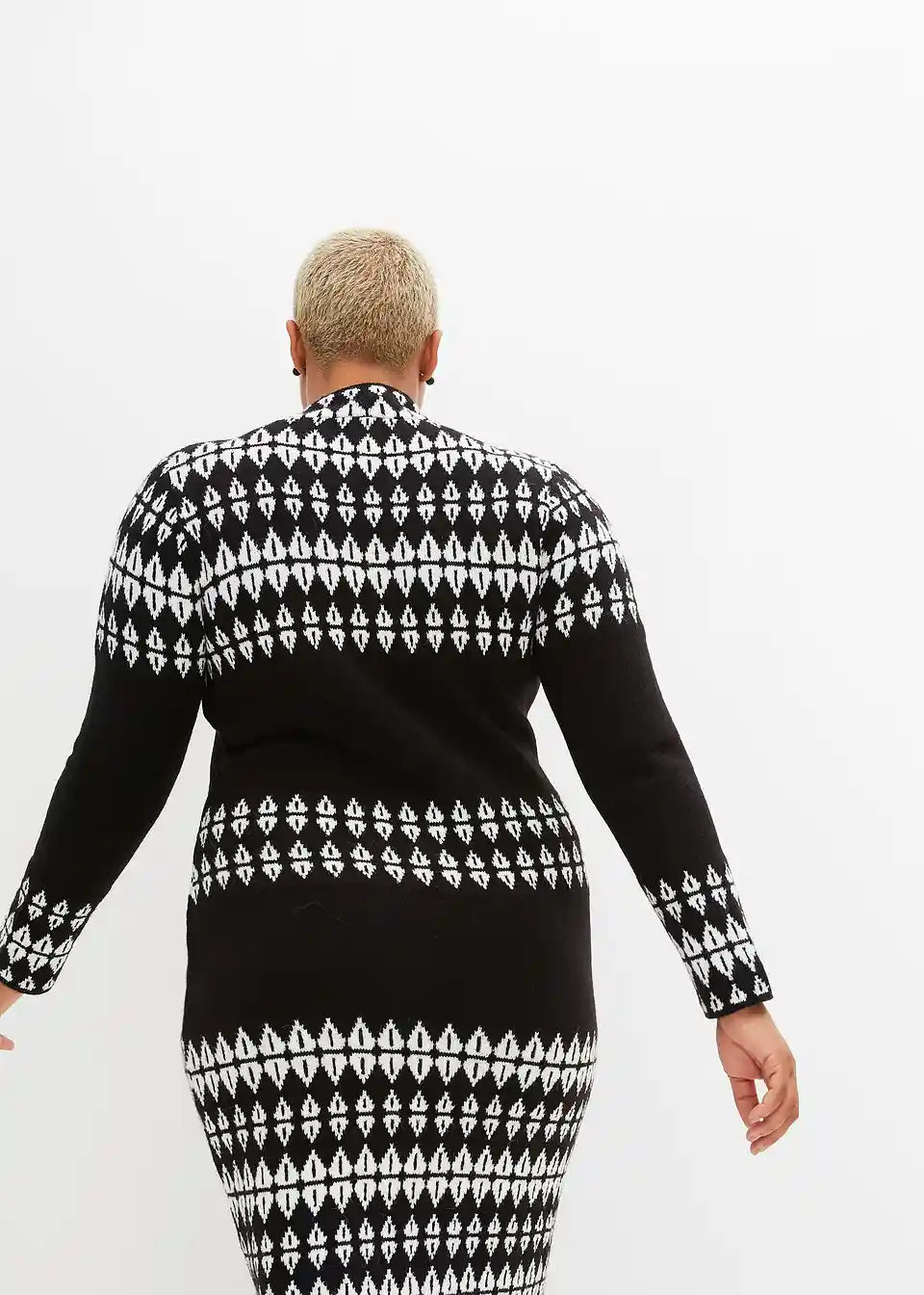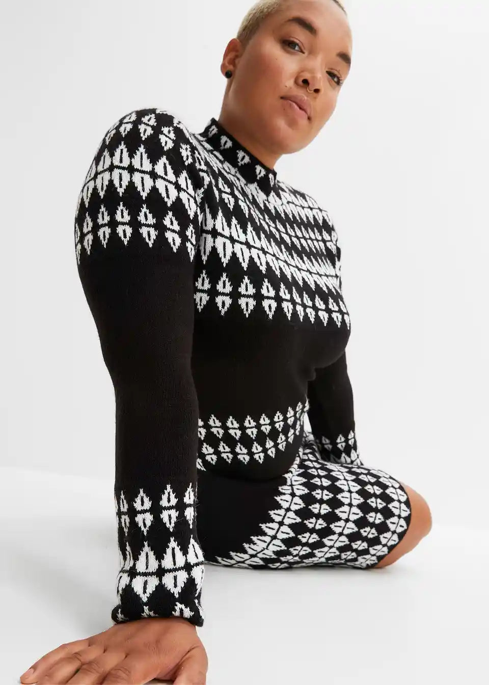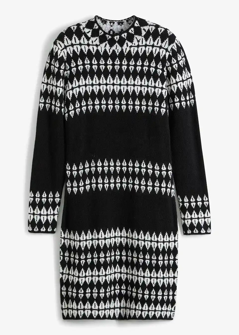 Stilska pletena obleka z modernim grafičnim vzorcem