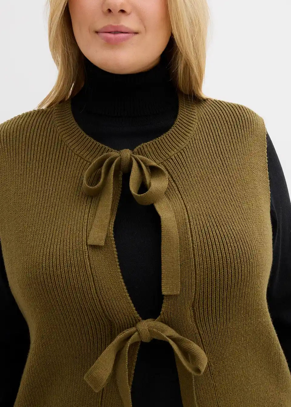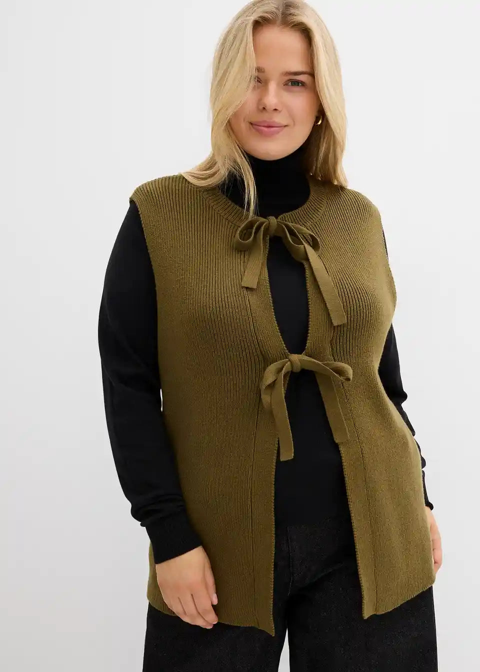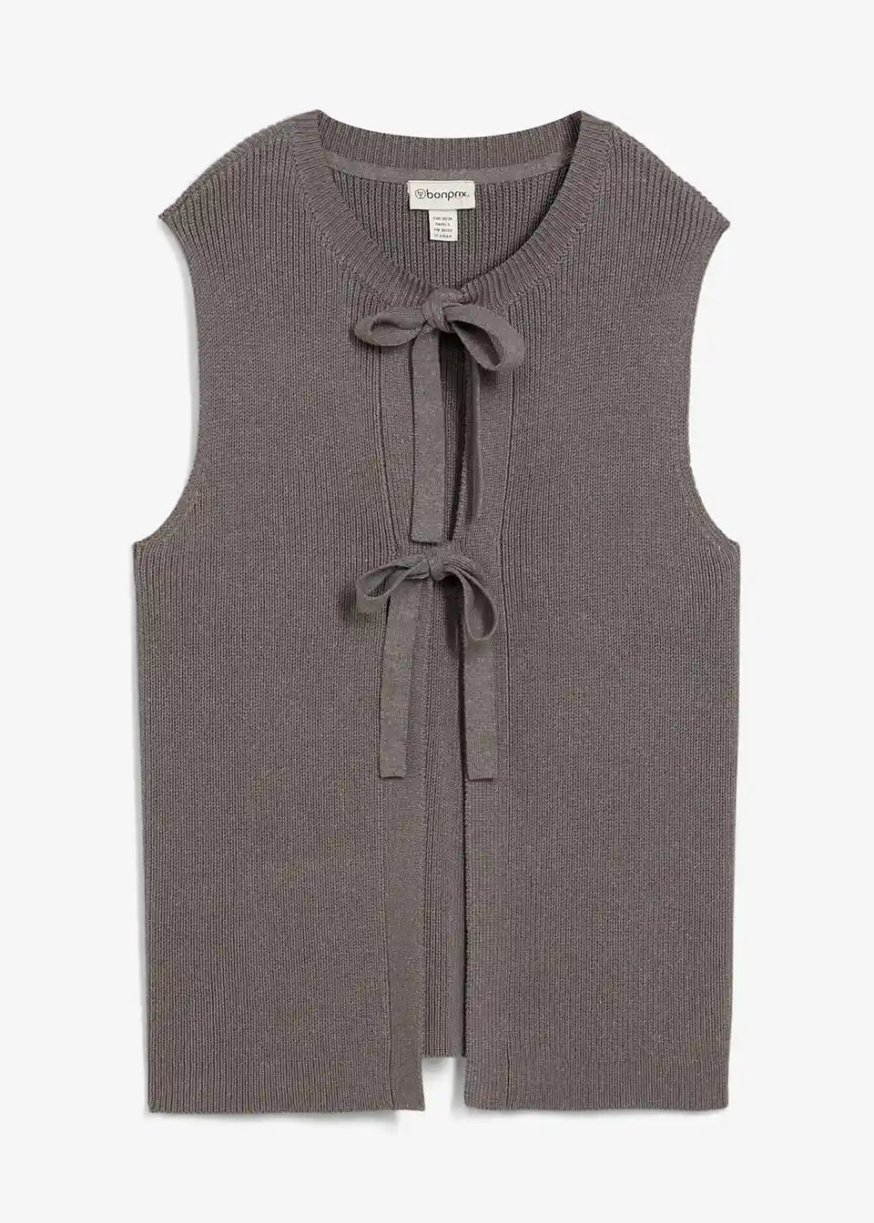 Pleten telovnik z okroglim izrezom, dvema paroma ozkih trakov in ravnim robom.