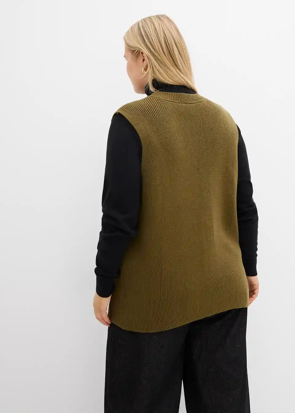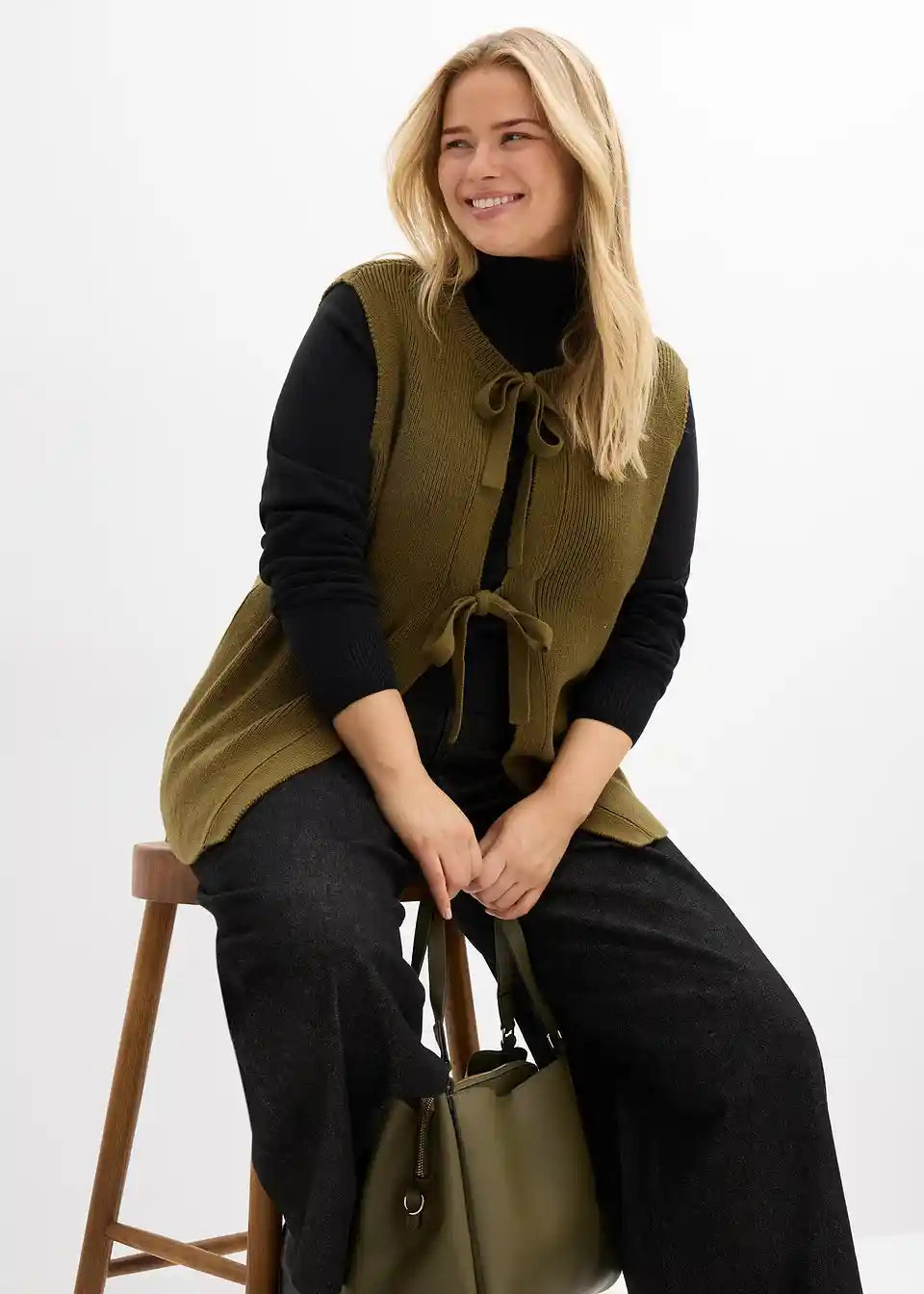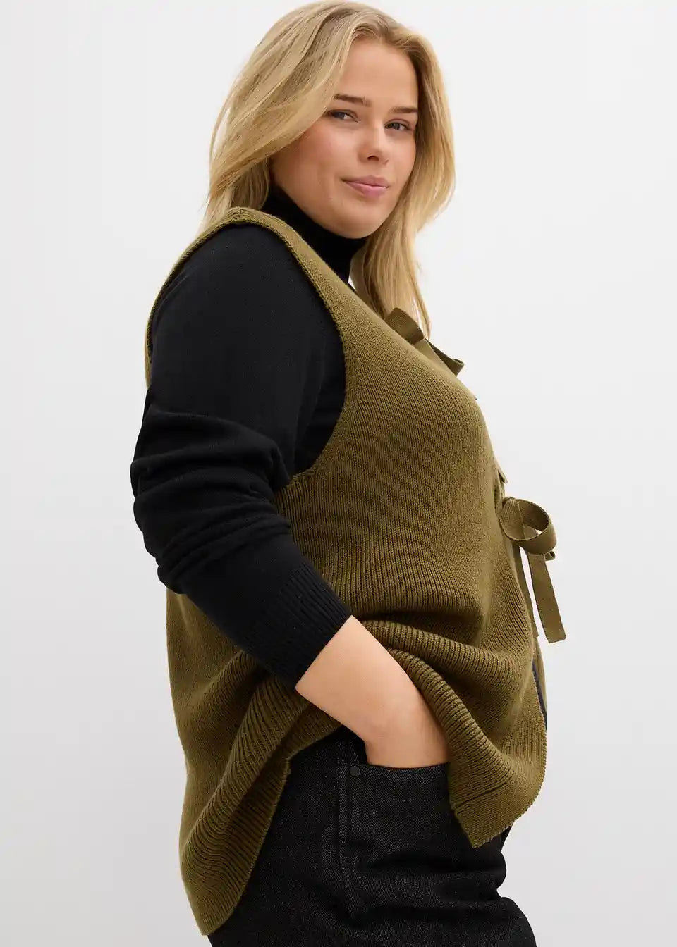 Pleten telovnik z okroglim izrezom, dvema paroma ozkih trakov in ravnim robom.