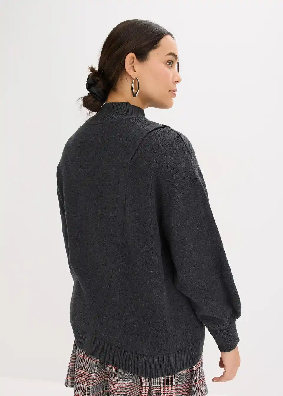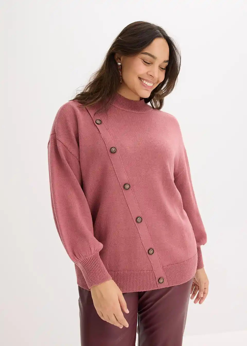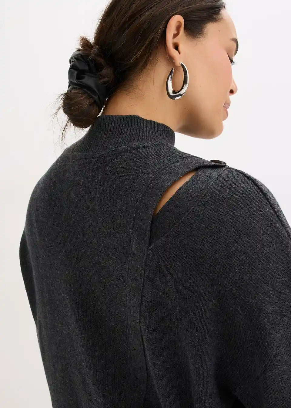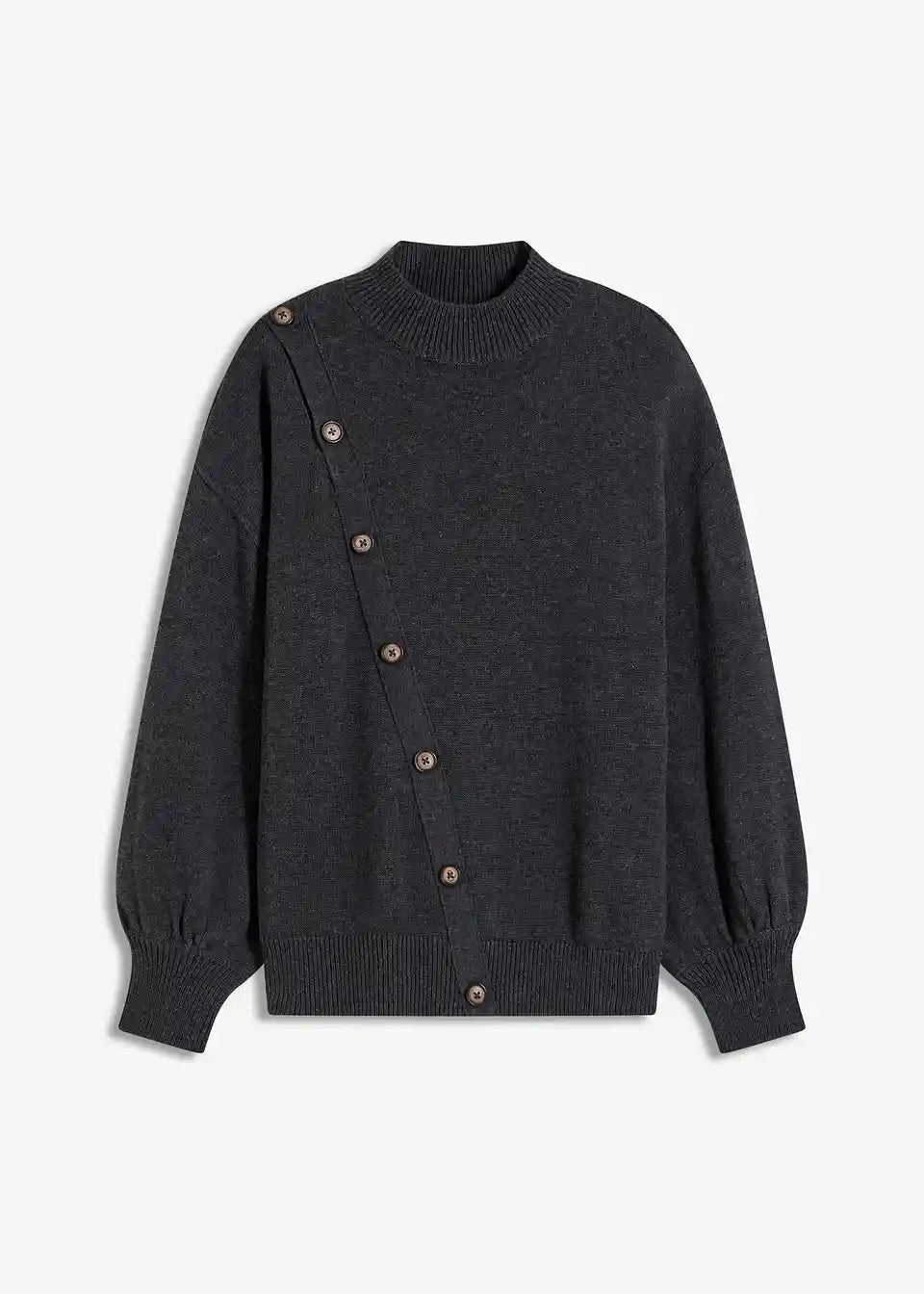 Pulover v rahlo ohlapnem kroju z diagonalno letvijo za zapenjanje z gumbi ki se na ramah lahko odpre