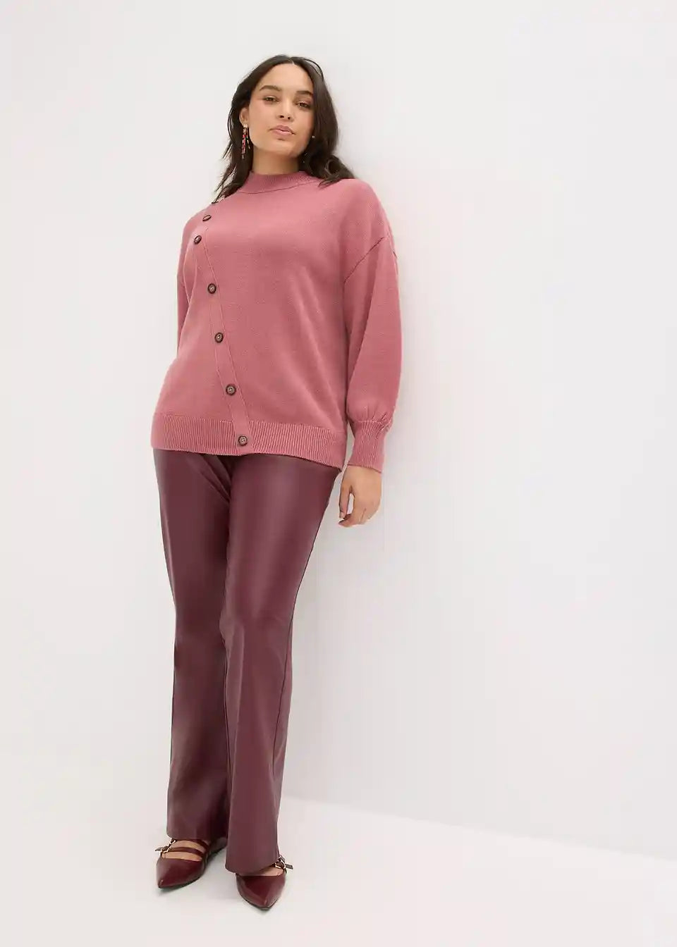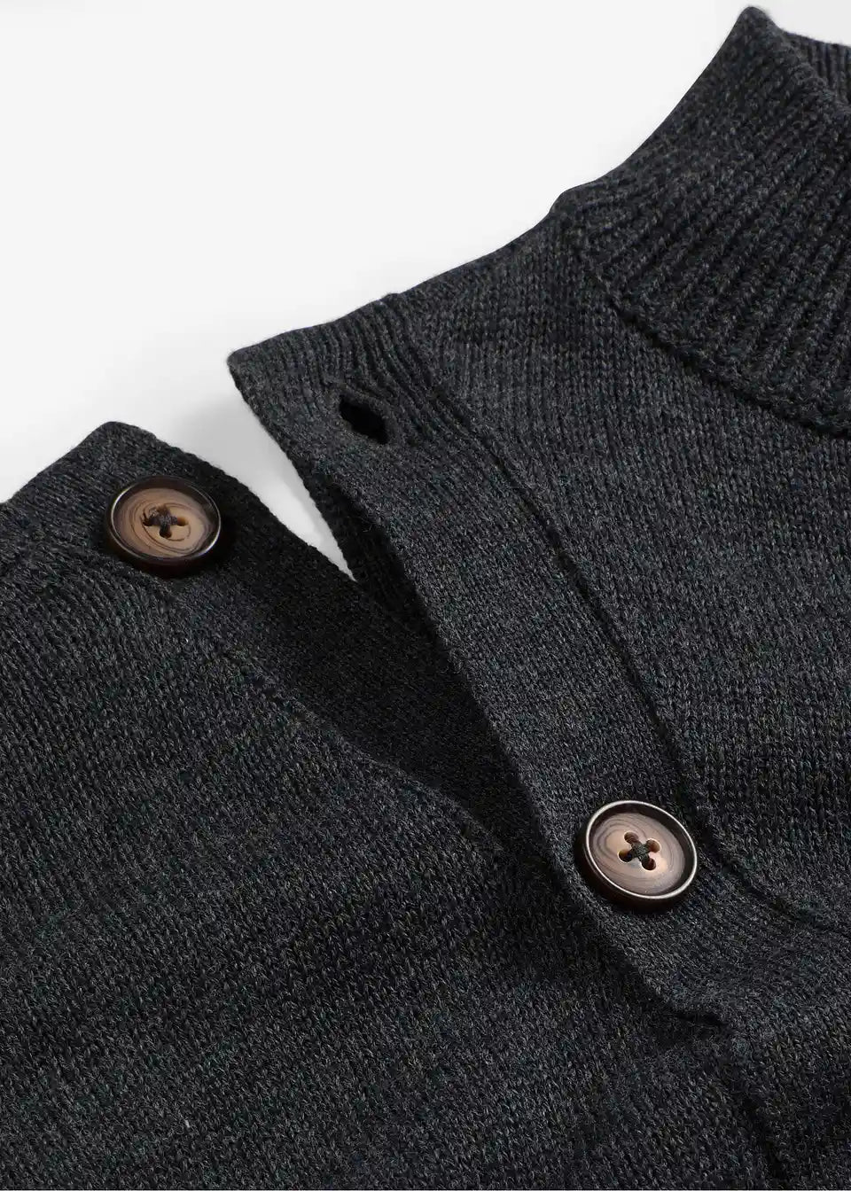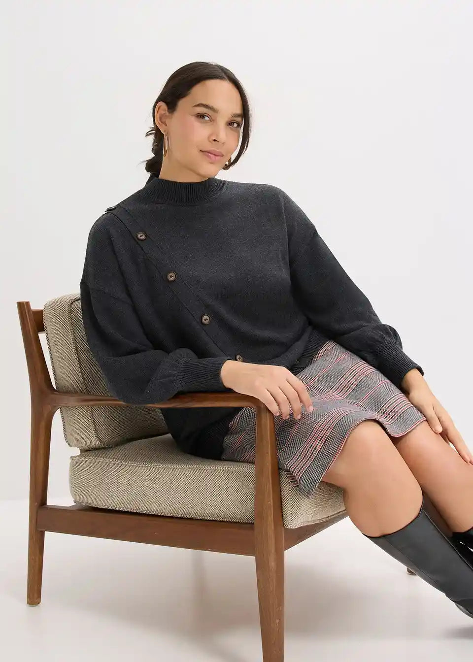 Pulover v rahlo ohlapnem kroju z diagonalno letvijo za zapenjanje z gumbi ki se na ramah lahko odpre