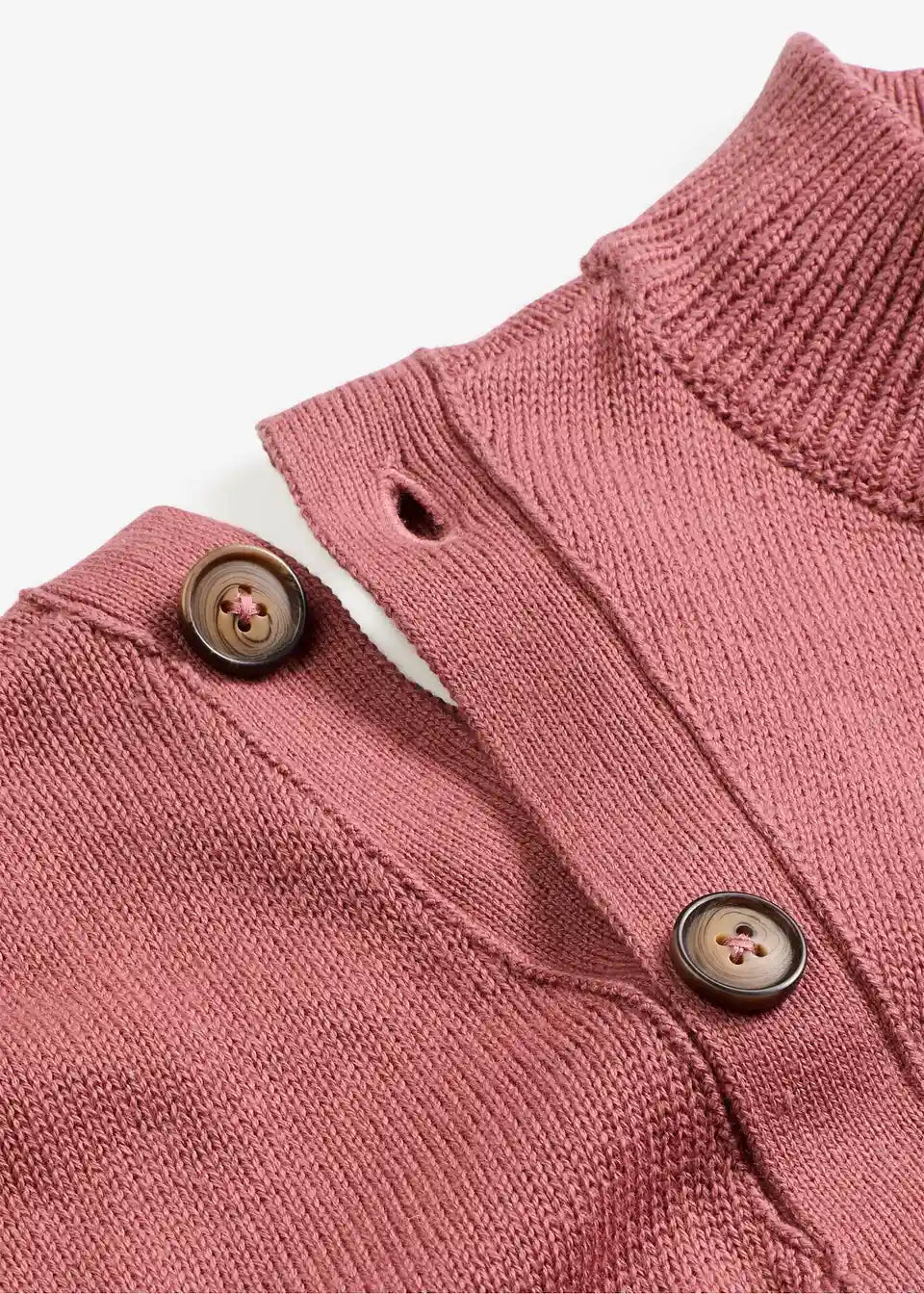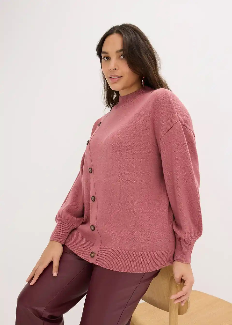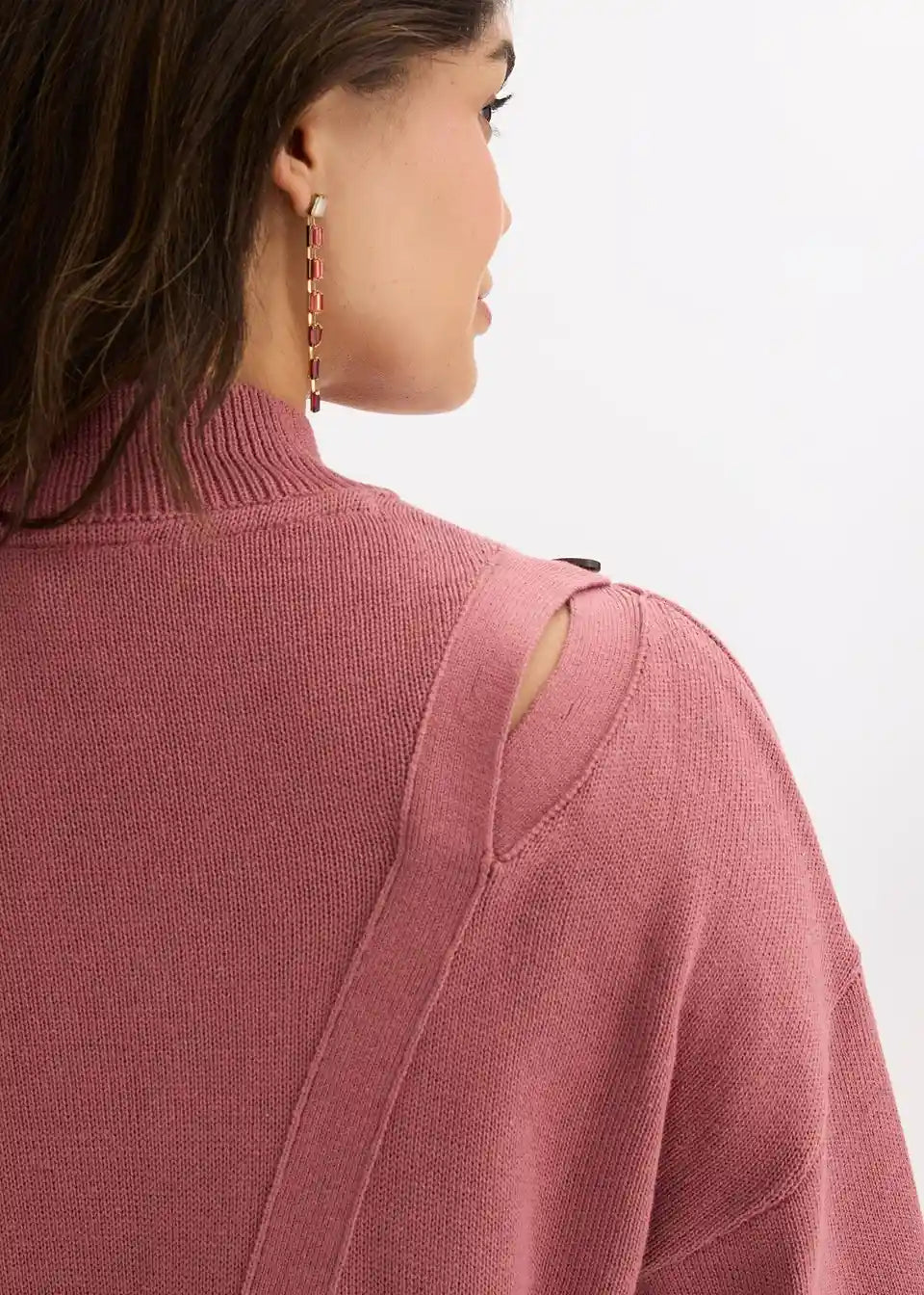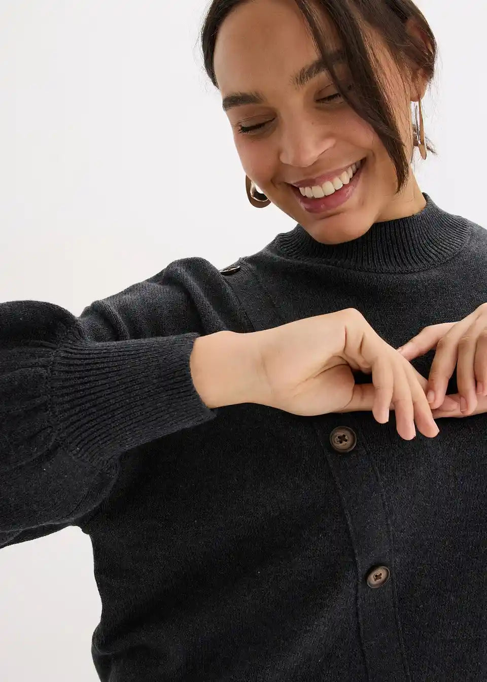 Pulover v rahlo ohlapnem kroju z diagonalno letvijo za zapenjanje z gumbi ki se na ramah lahko odpre