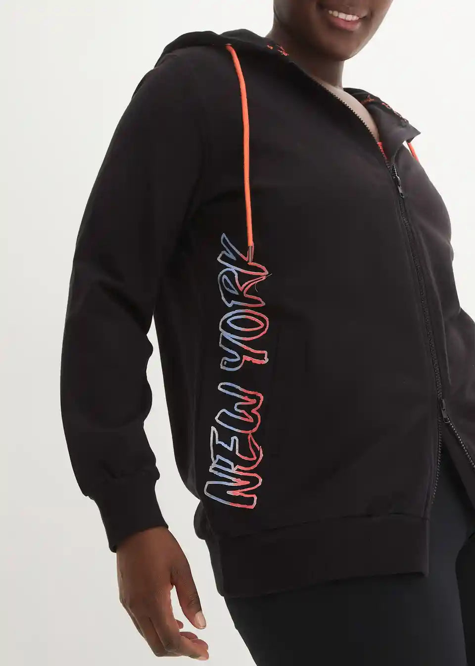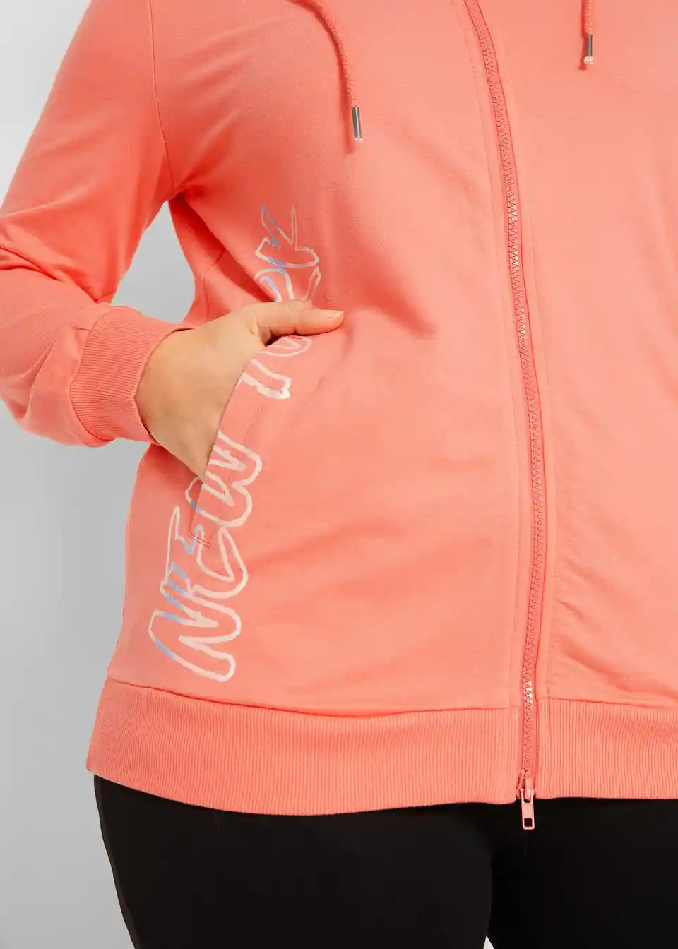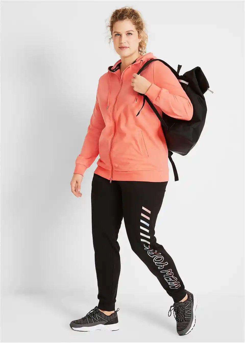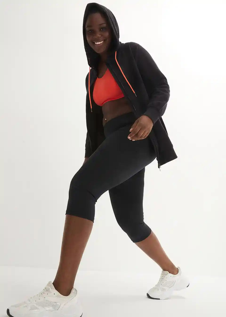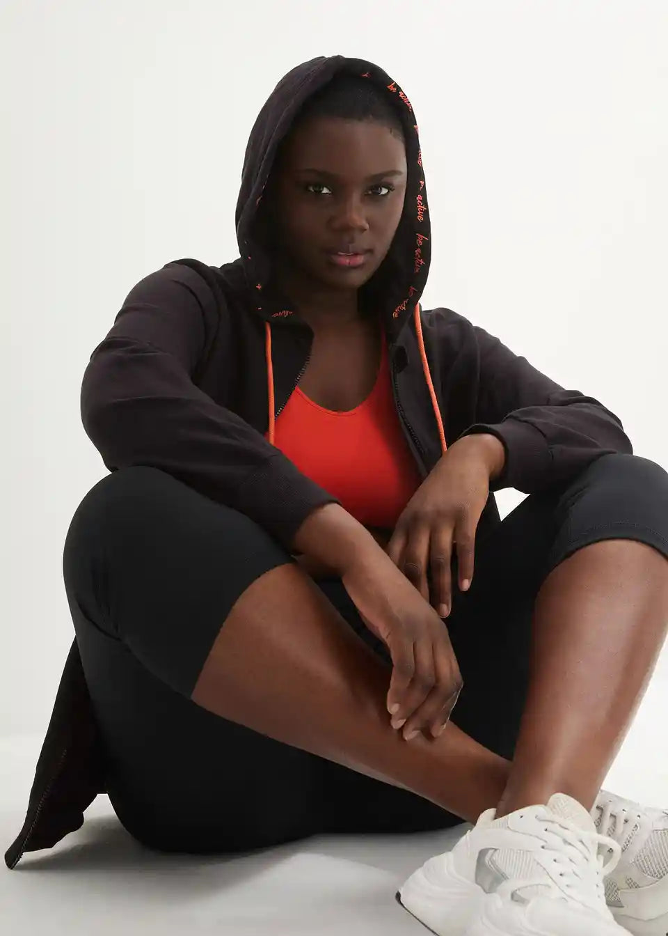 Jopa iz trikoja s kapuco se lahko s skladnimi hlačami nosi tudi kot trenirka. Z všitimi žepi in dvosmerno zadrgo. Dolžina pri velikosti 40/42 ca. 70 cm. Strojno pranje.