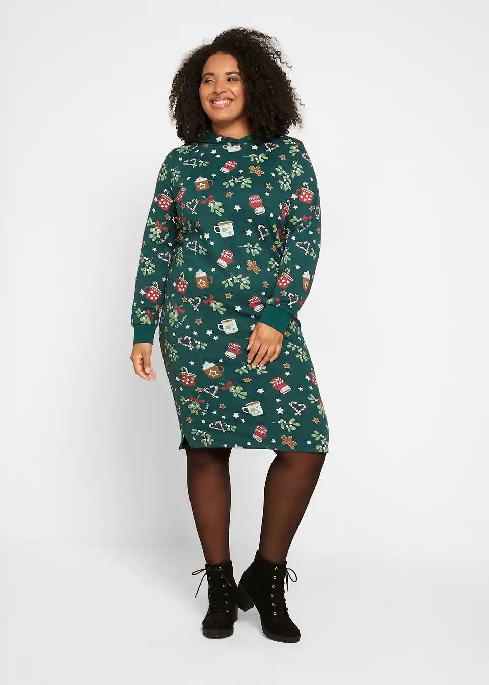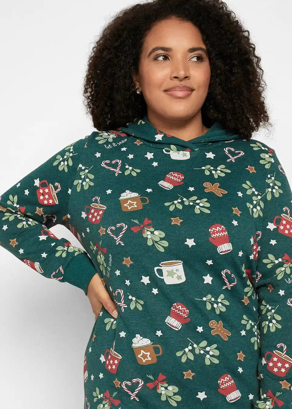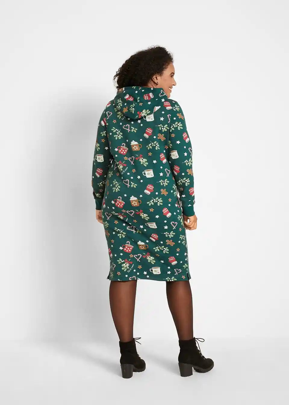 Božično potiskana sweat obleka s kapuco in stranskimi režami