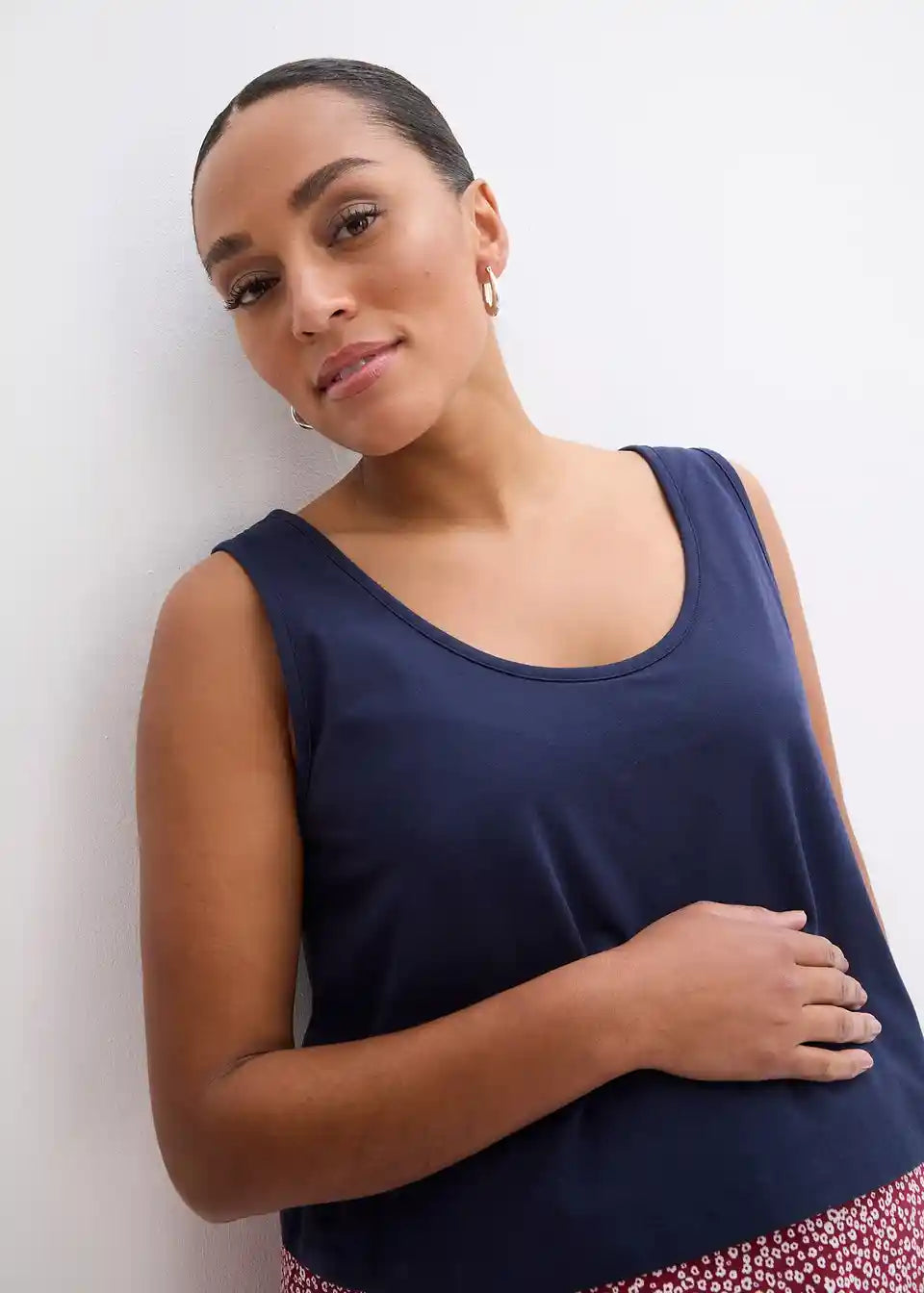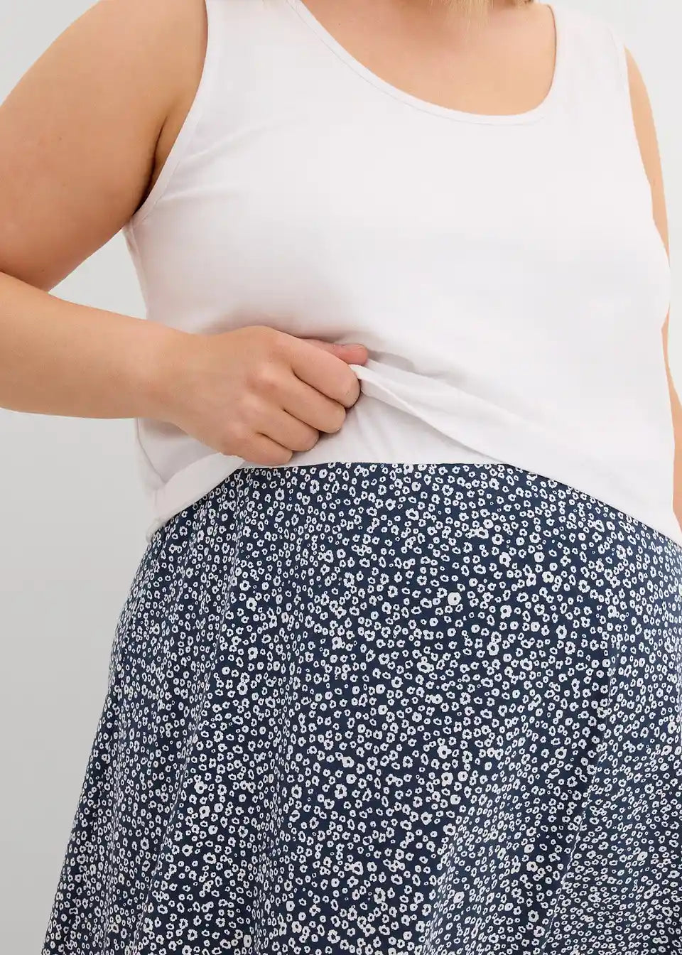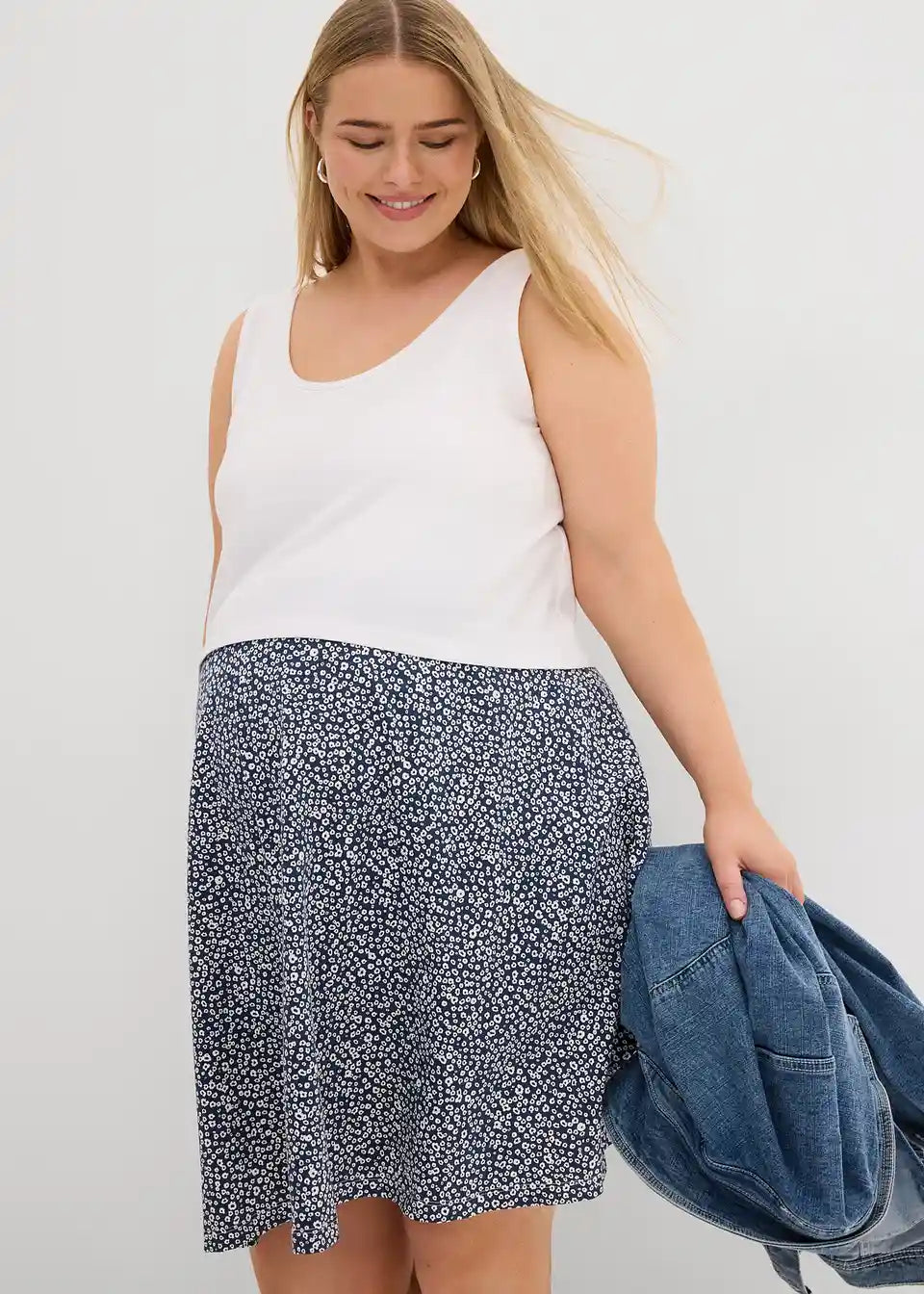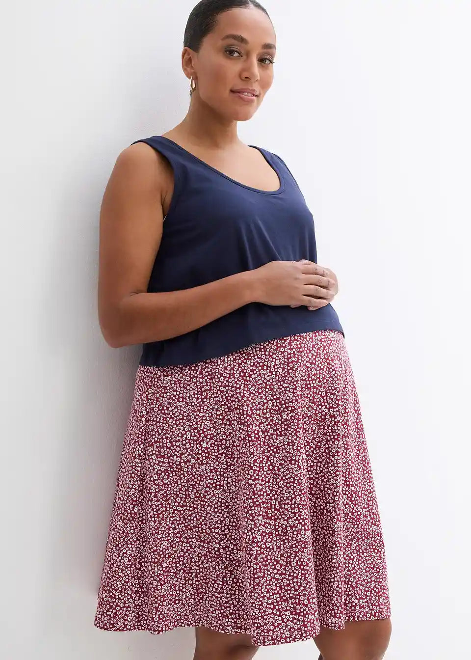 Mehka džersi obleka iz bio bombaža z dodatkom raztegljivega materiala za visoko udobje pri nošenju. Z globokim okroglim izrezom in udobnimi naramnicami v slogu tank topa. Zgornji del je dvoslojen in skriva praktično funkcijo za dojenje. Dizajn z dvojnimi sloji pomaga preprečiti izgubo toplote ter omogoča udobno in diskretno dojenje za mater in otroka. Udobna poletna obleka segajoča do kolen ima potiskan A-linijski kroj, ki ustvari laskavo silhueto.