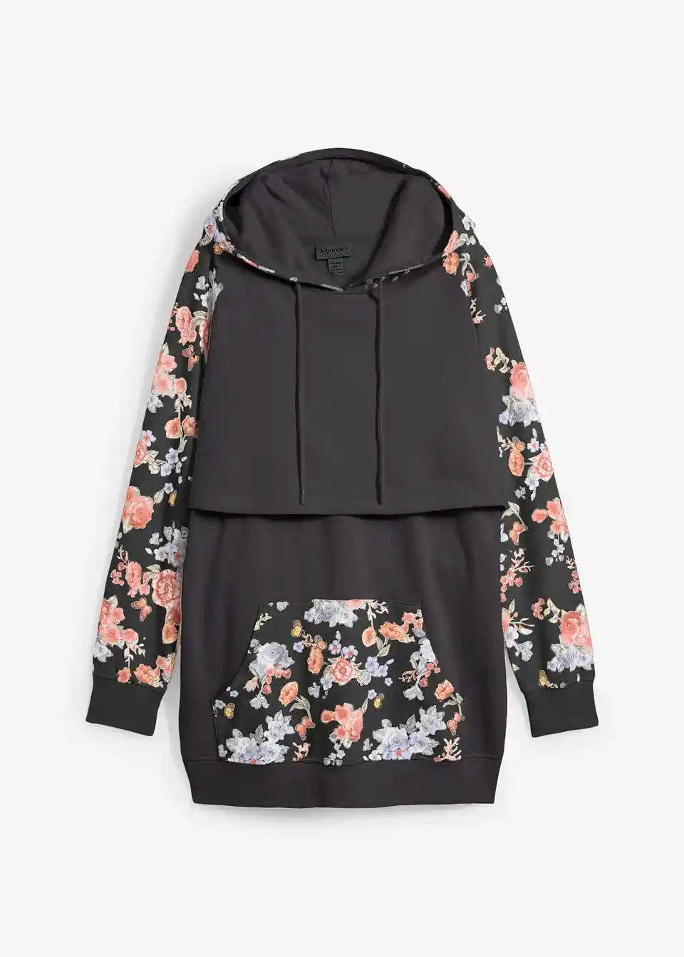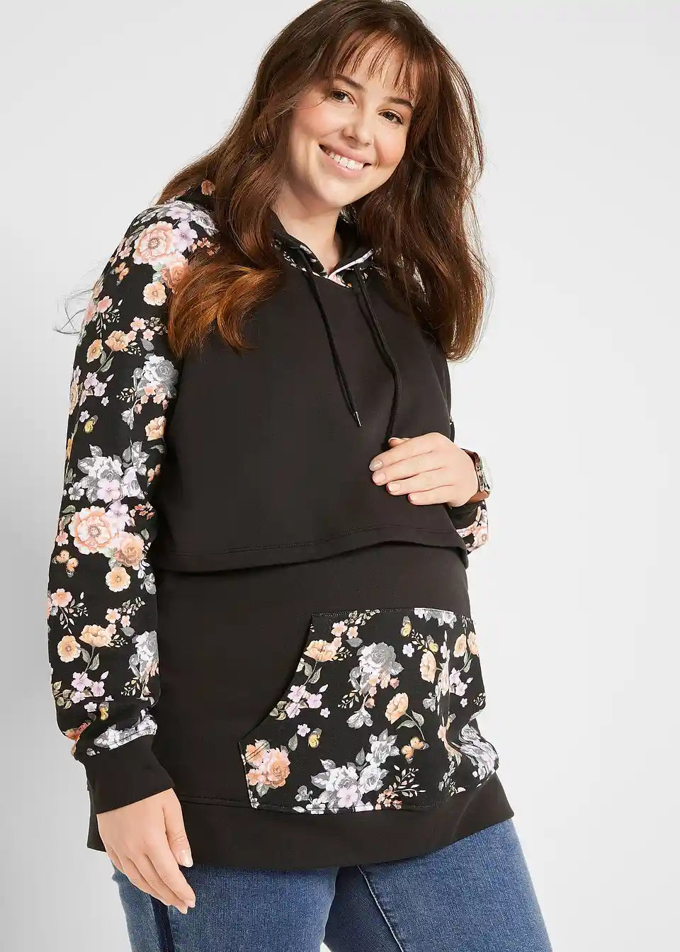 Doječi hoodie v mehki, znotraj prijetno podloženi športni tkanini z kenguru žepom in kapuco z vrvicami. Dolgi rokavi in rob so zaključeni z udobnim rebrastim patentom. Dizajn z dvojnimi sloji preprečuje izgubo toplote in omogoča prijetno dojenje za mamo in otroka.