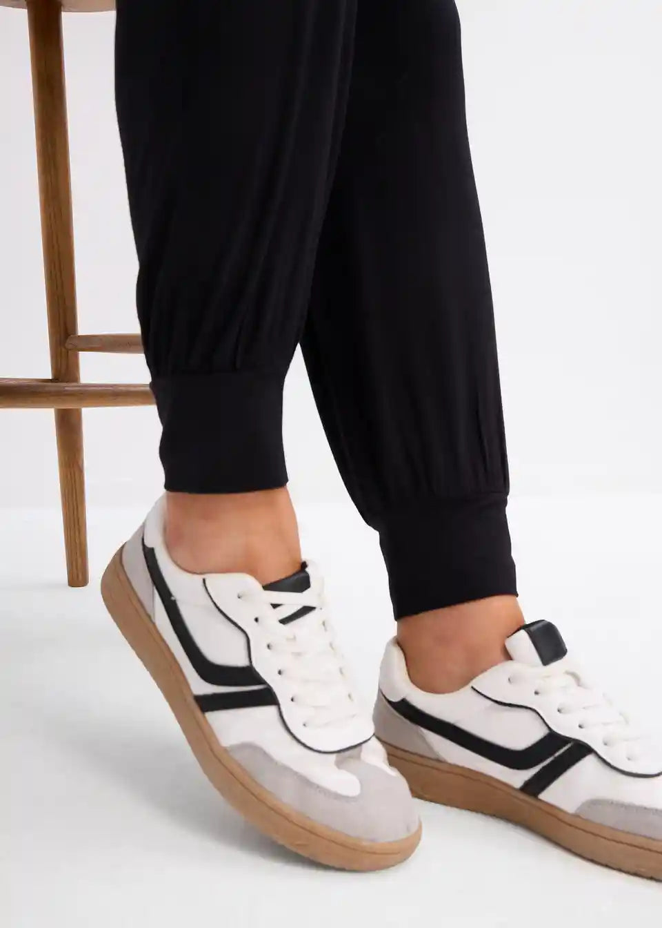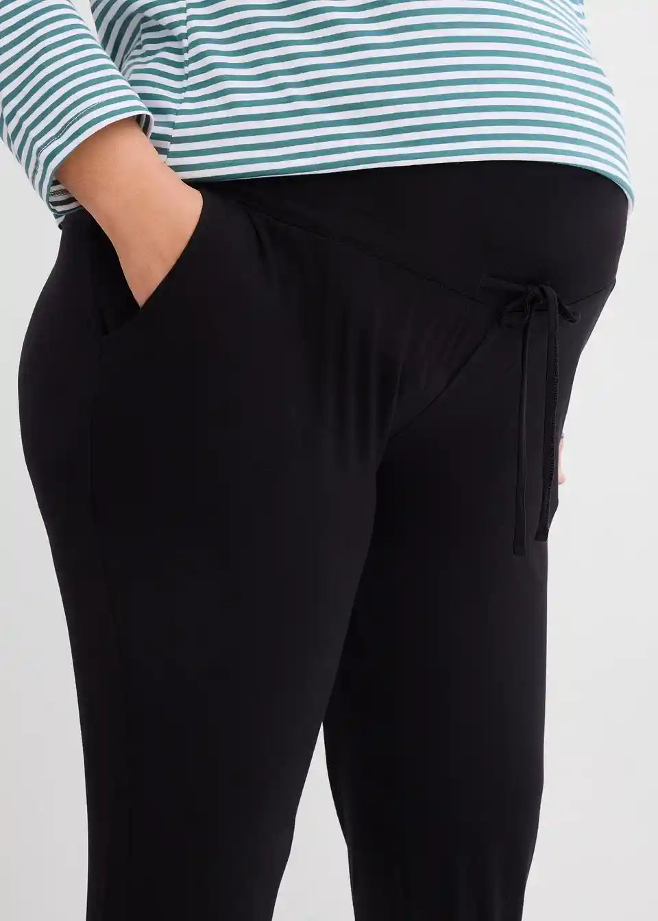 Hlače iz certificirane viskoze z ravnimi hlačnicami in elastičnim robom. Širok zavihani pas zagotavlja udobno prileganje med nosečnostjo in po njej.