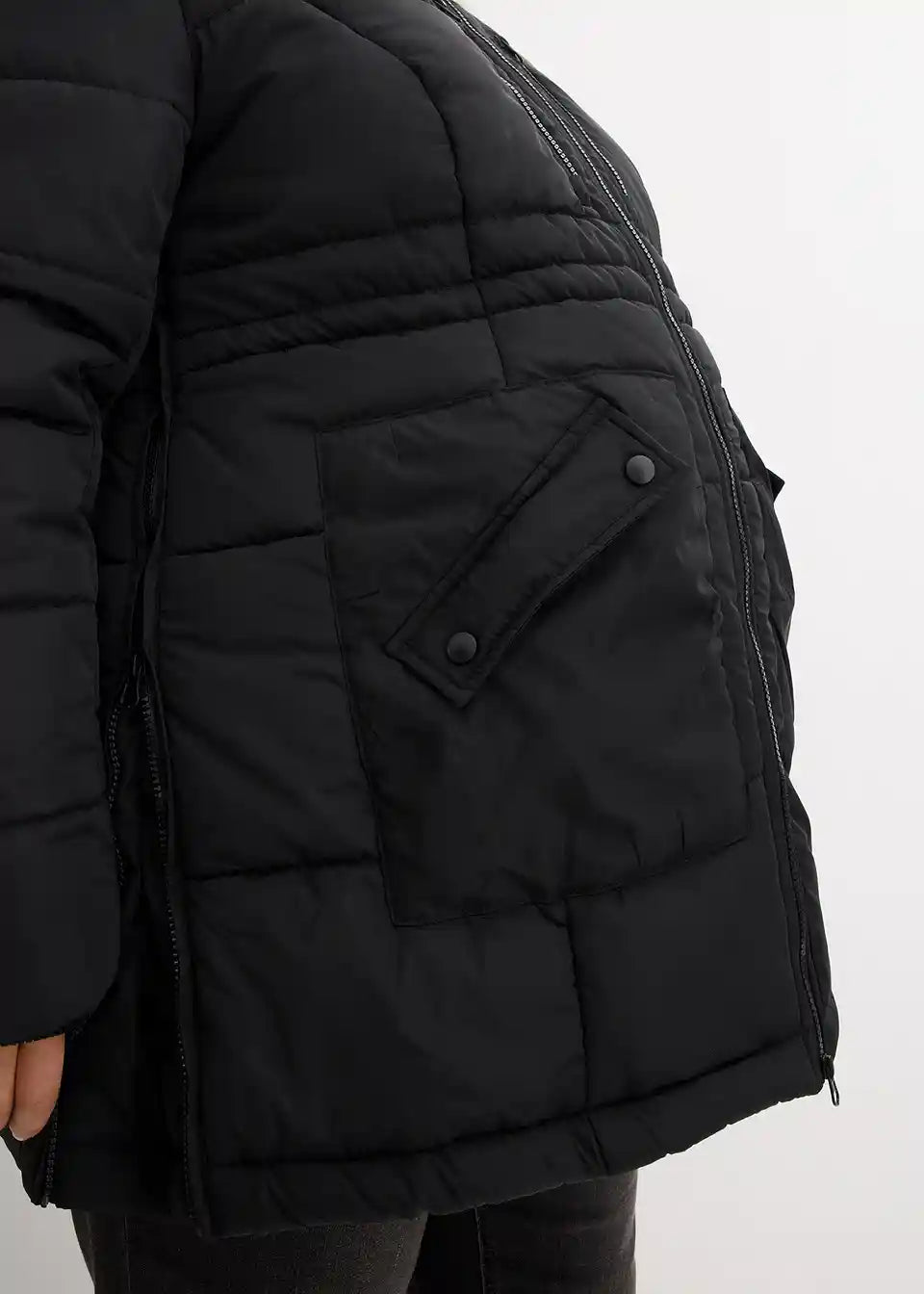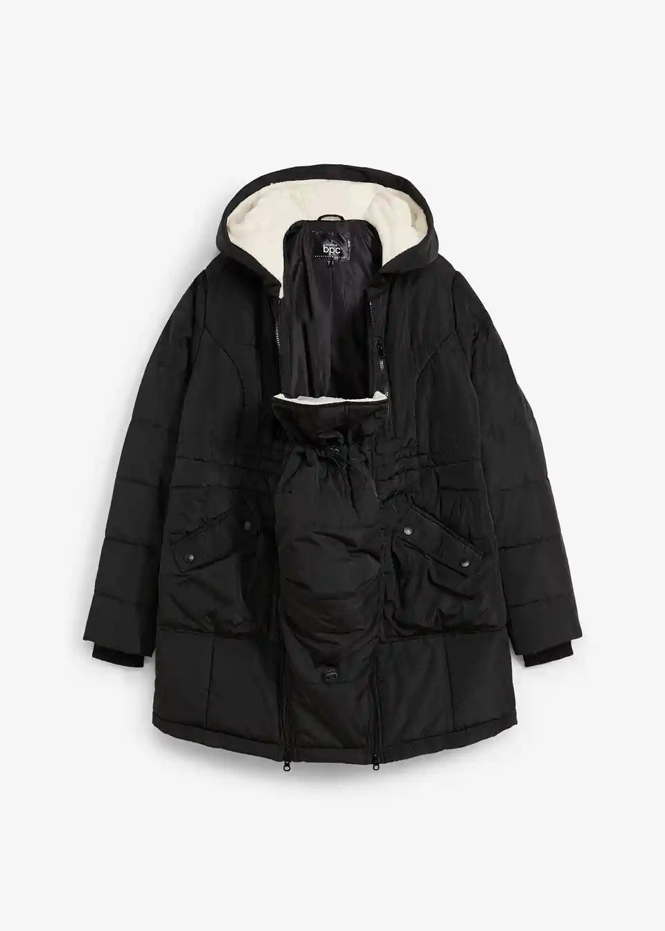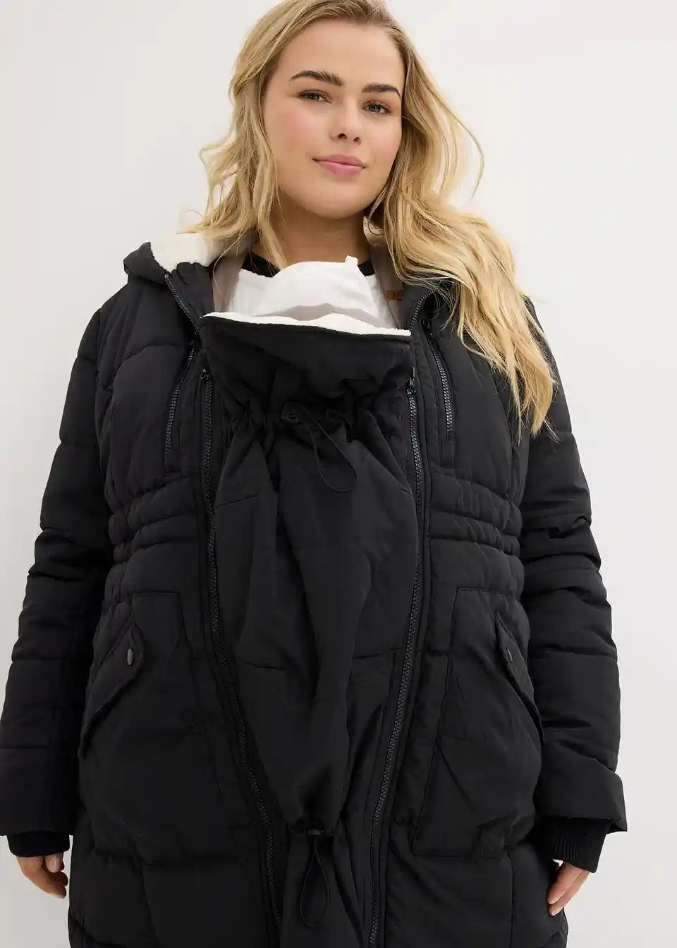Ta podložena nosečniška jakna z vložkom za otroka ohranja mamo in otroka prijetno topla v hladnih dneh. Med nosečnostjo stranske zadrge omogočajo dovolj prostora za rastoči trebuh. Po porodu se model lahko razširi z vložkom za otroka, podloženim s tkanino iz pliša. Ta je le za zaščito in ne omogoča funkcije nošenja. Jakna z oblogo prepriča z raztegljivimi rebrastimi zaključki na rokavih in mehko podlogo iz pliša.