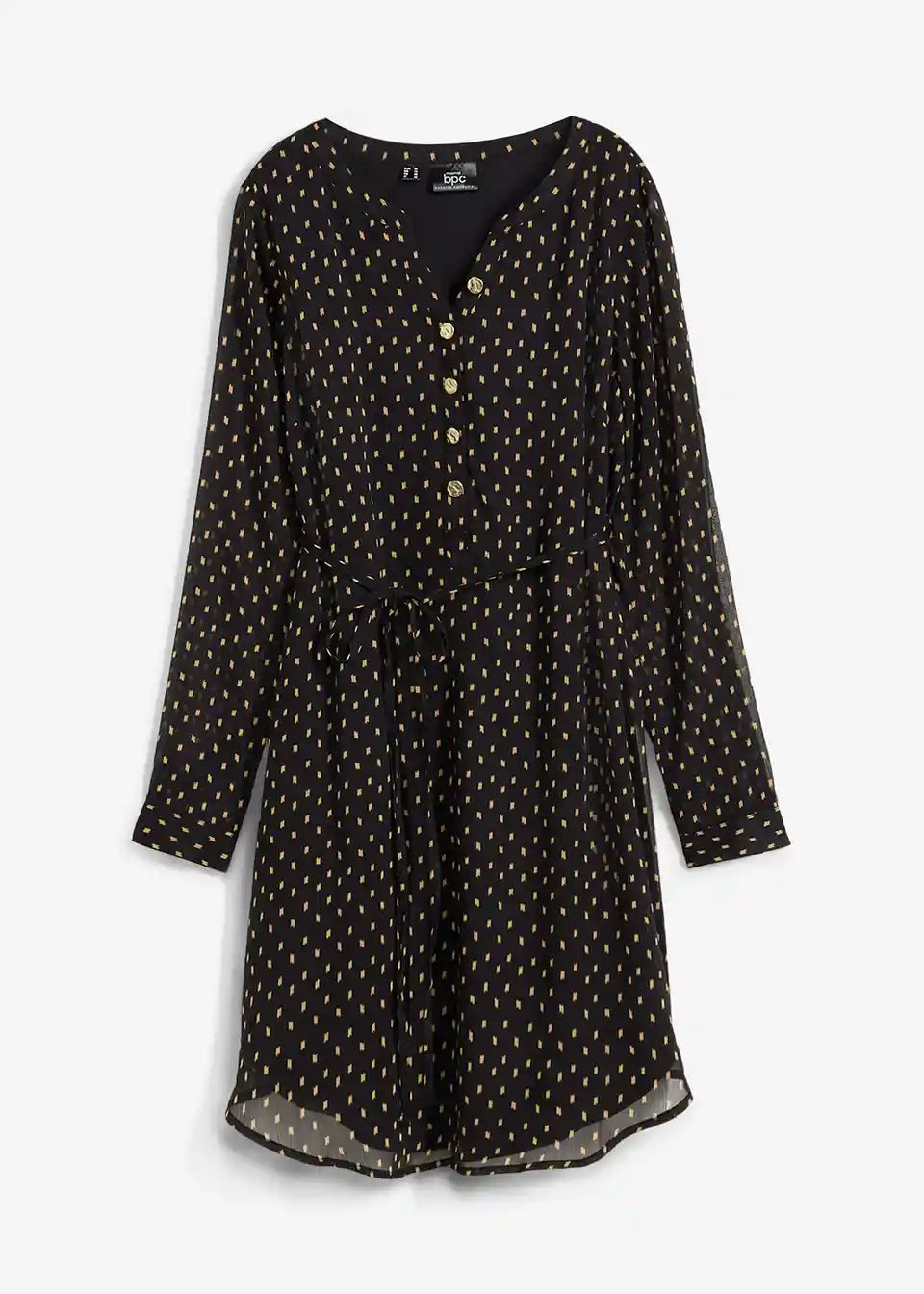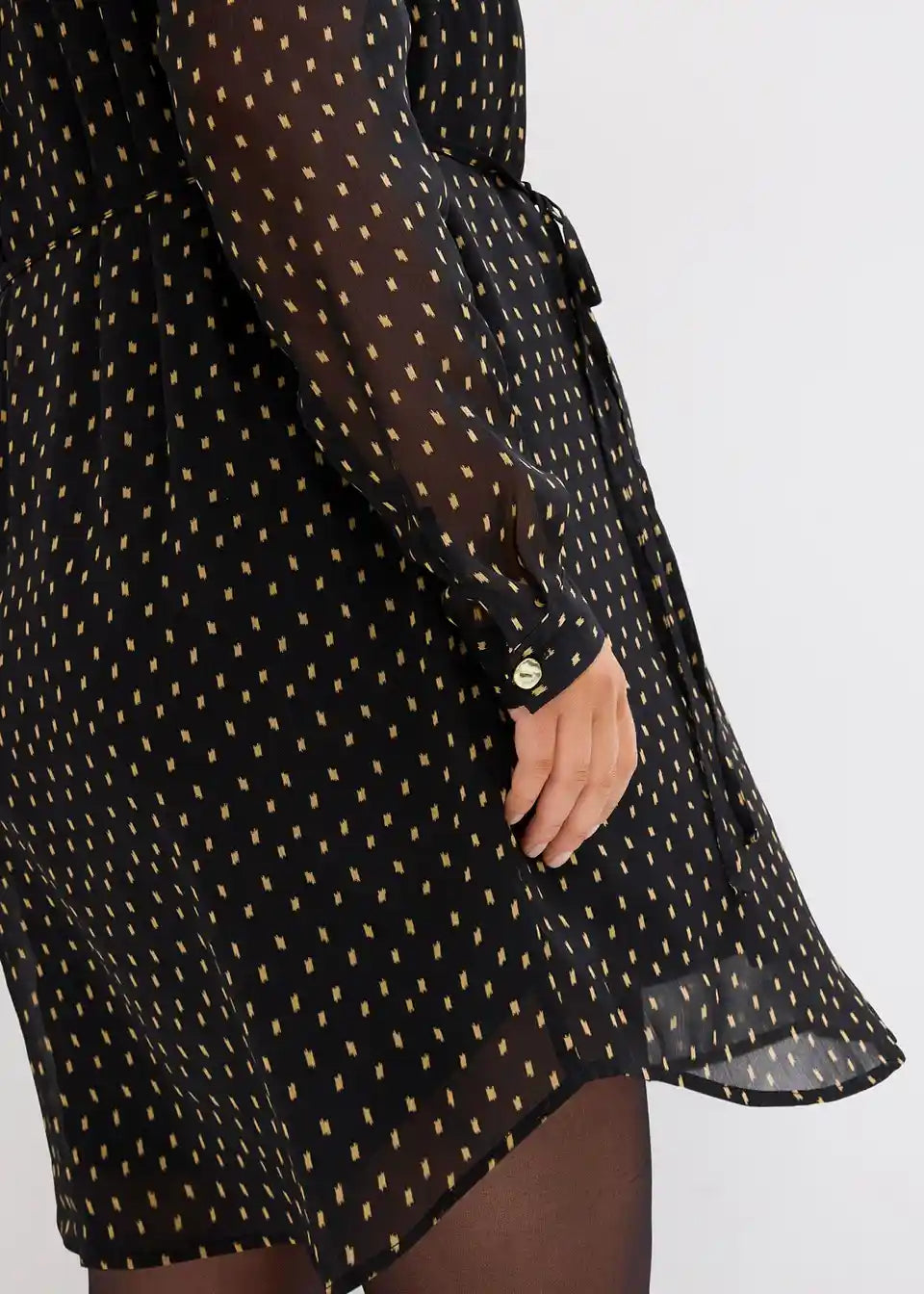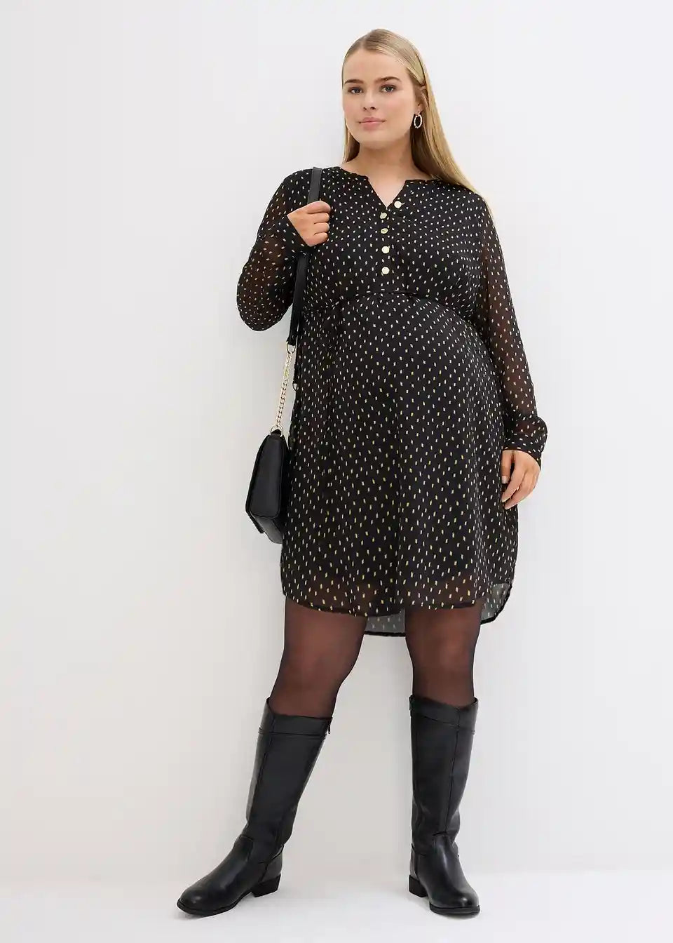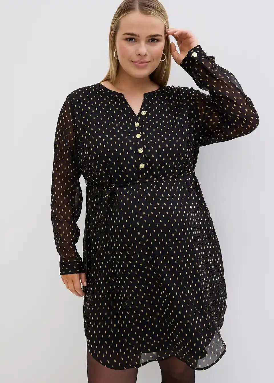 Podložena šifonska obleka z dolgimi, delno prosojnimi rokavi in okroglim izrezom z majhnim stoječim ovratnikom. Odstranljiv pas poudarja rastoči nosečniški trebušček. Po nosečnosti omogoča preprosto dojenje s pomočjo okrasne vrstne zlatih gumbov. Rahlo zaobljen rob. Rokavi z manšetami in zlatim gumbom.