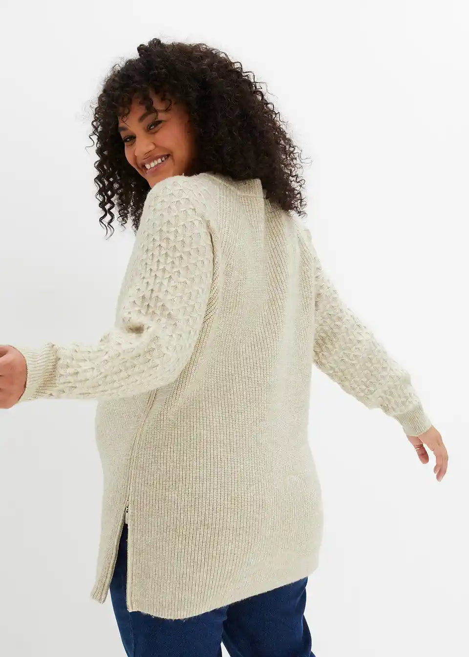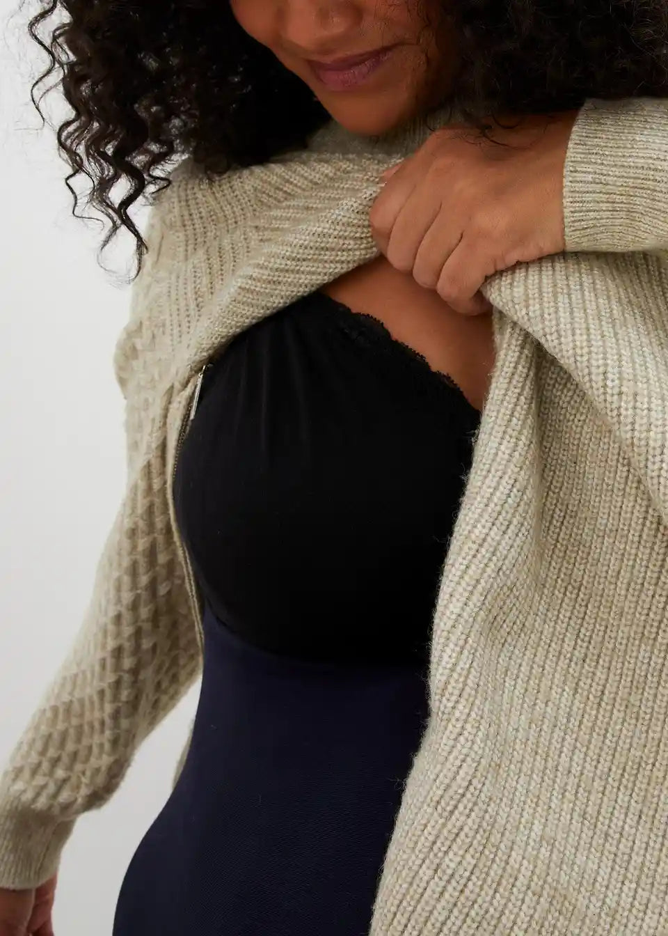 Mehek pleten pulover za nosečniški in doječi čas. Na straneh so reži z zadrgami, ki omogočajo udobno dojenje za mamo in otroka.