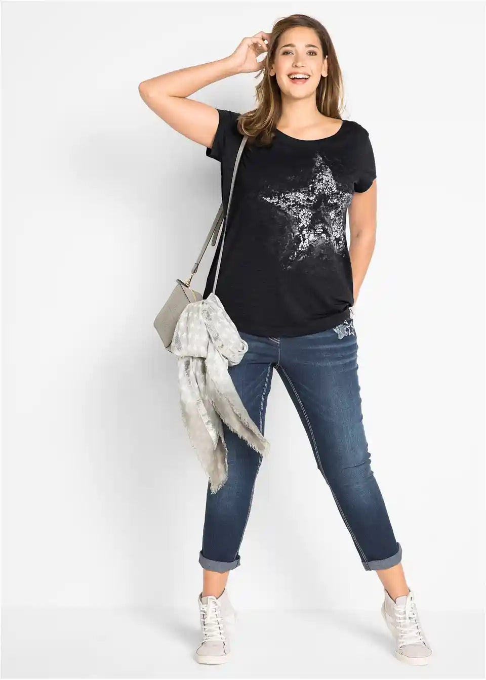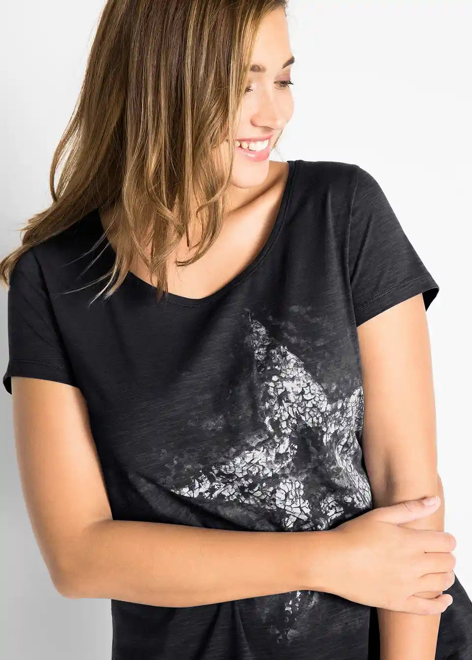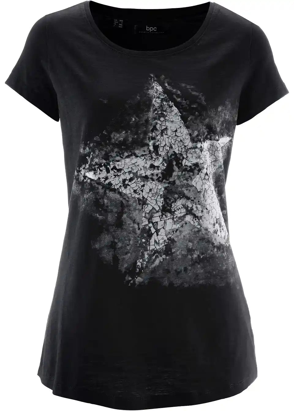 Ta modna majica iz mehko padajočega Flammgarn materiala ima vse, da postane vaš najljubši kos. Vizualno navdušuje z velikim potiskom na sprednji strani. Ponaša se z enostavnim okroglim izrezom, kratkimi rokavi in rahlo zaobljenim robom. Sproščena majica znamke bpc se odlično poda tako k kratkim kot dolgim kavbojkam.