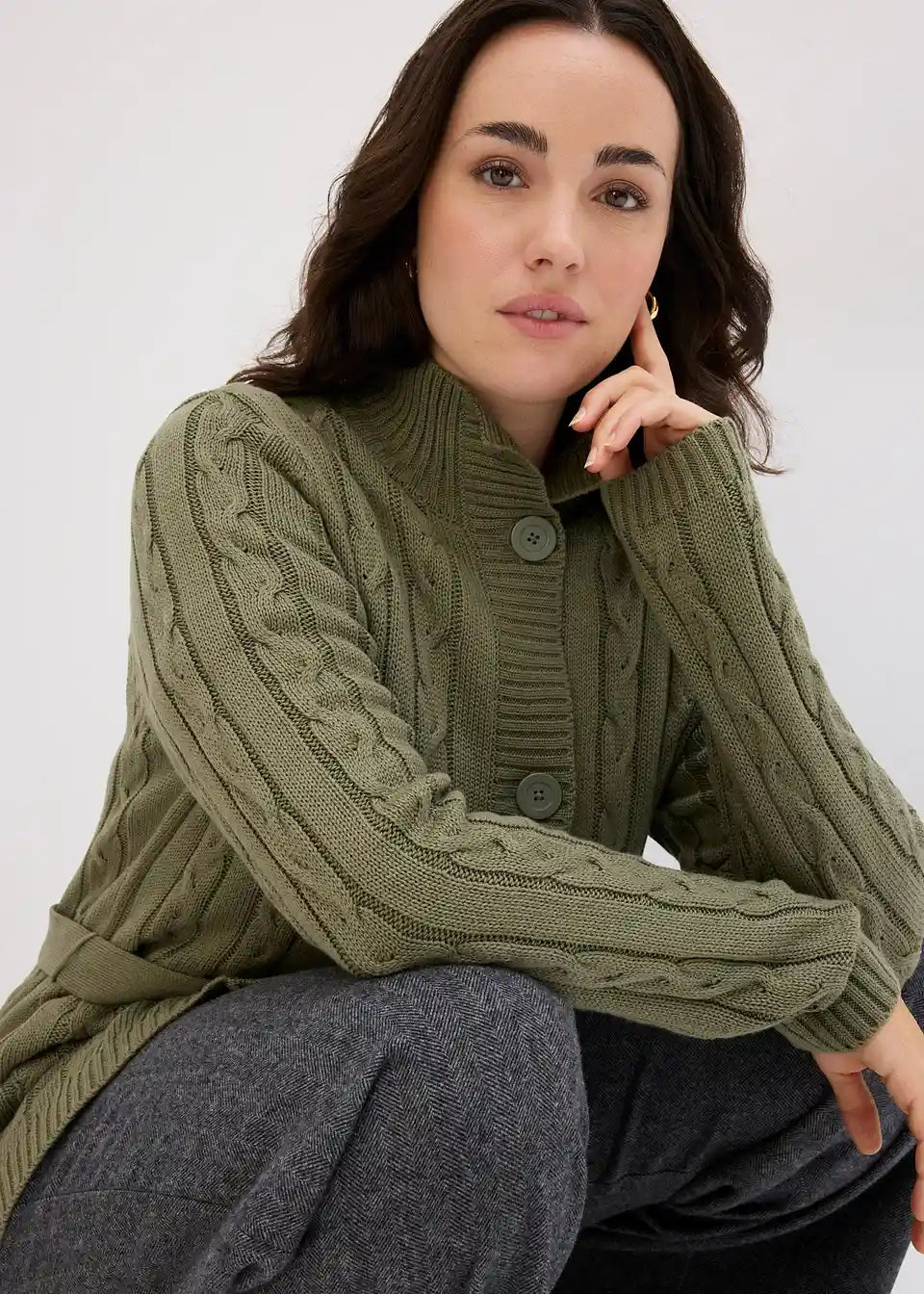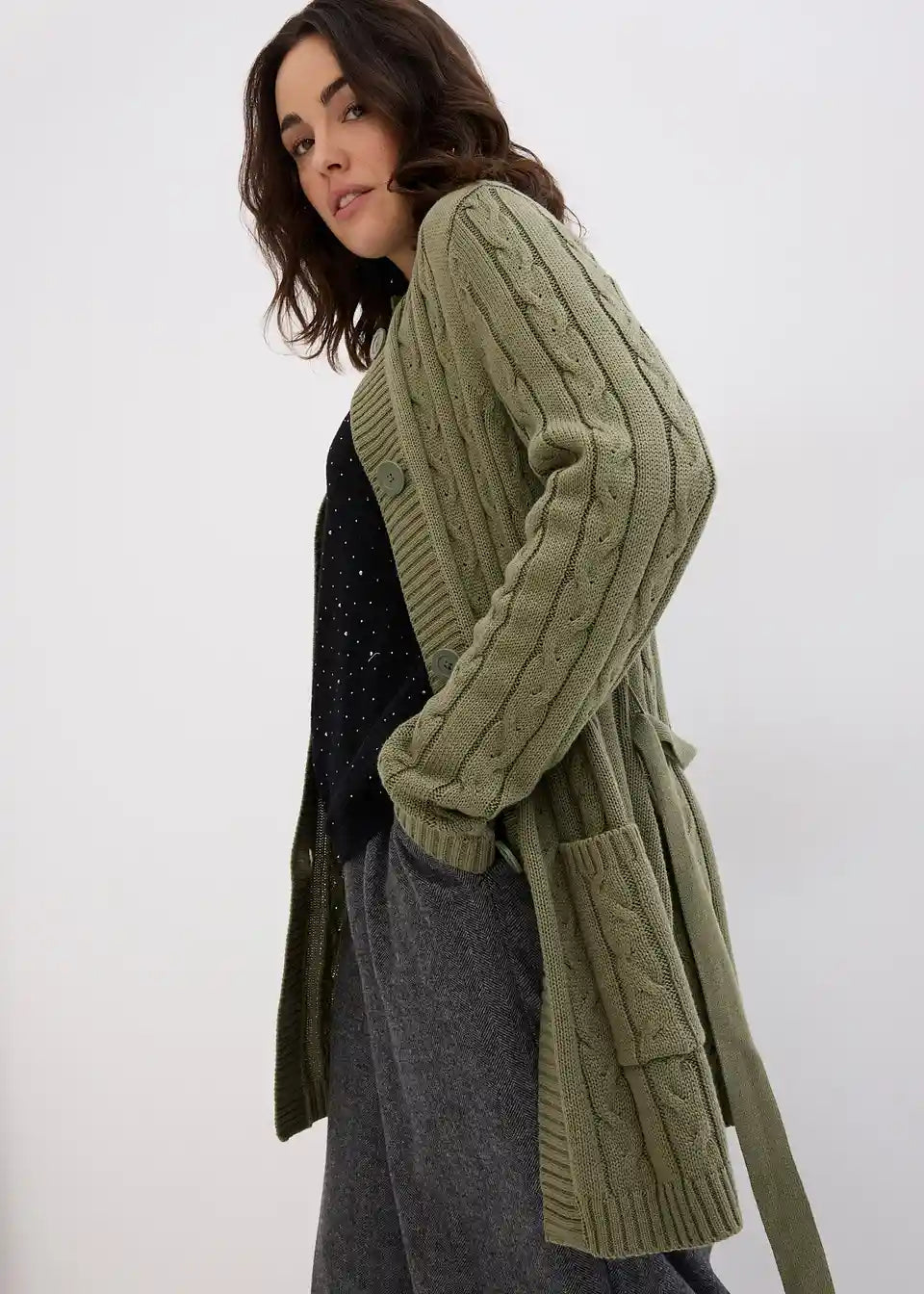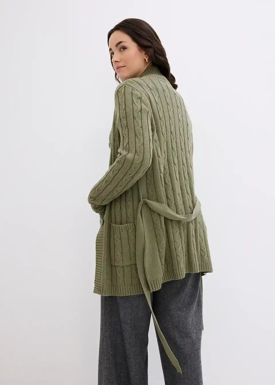 Udobna dolga pletena jopica z vzorcem pletenic in vezalnim trakom