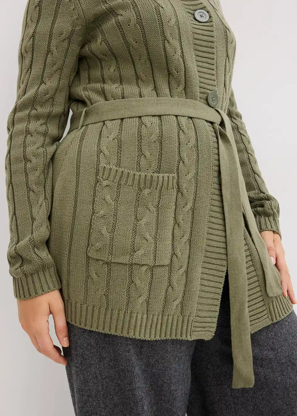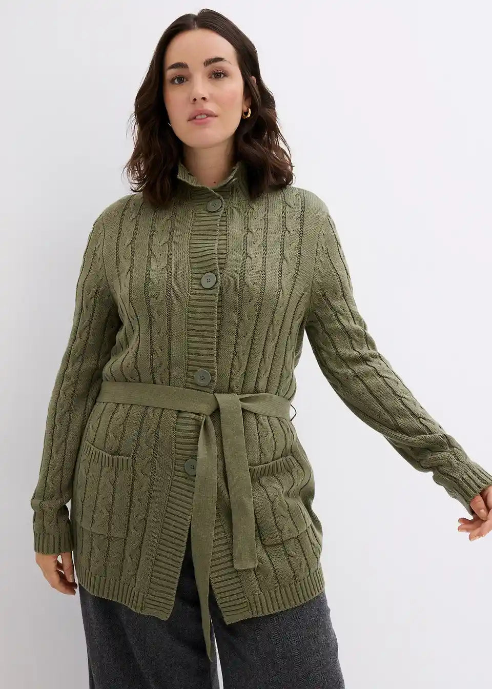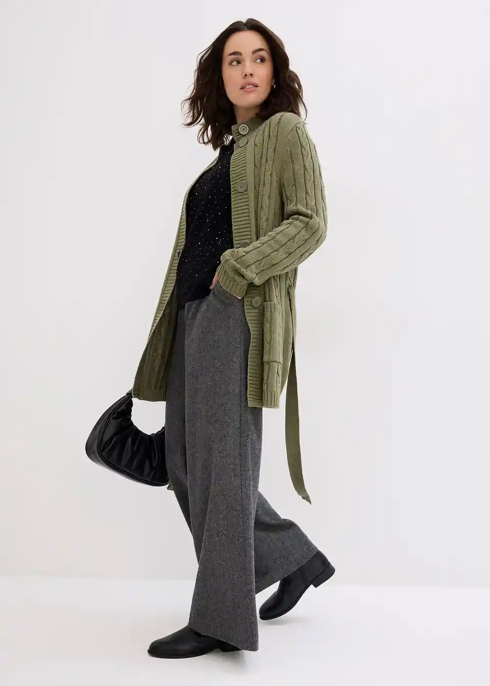 Udobna dolga pletena jopica z vzorcem pletenic in vezalnim trakom