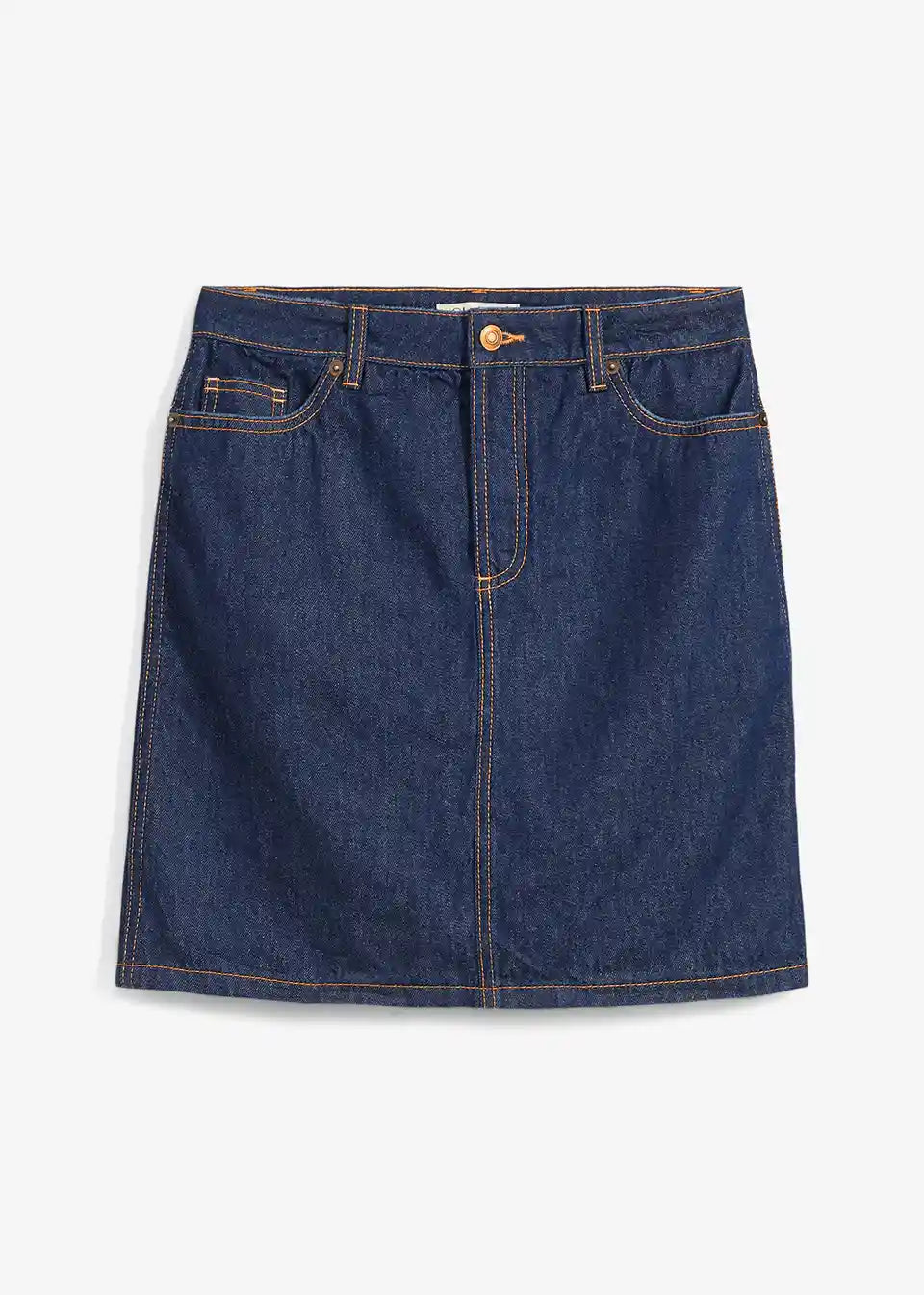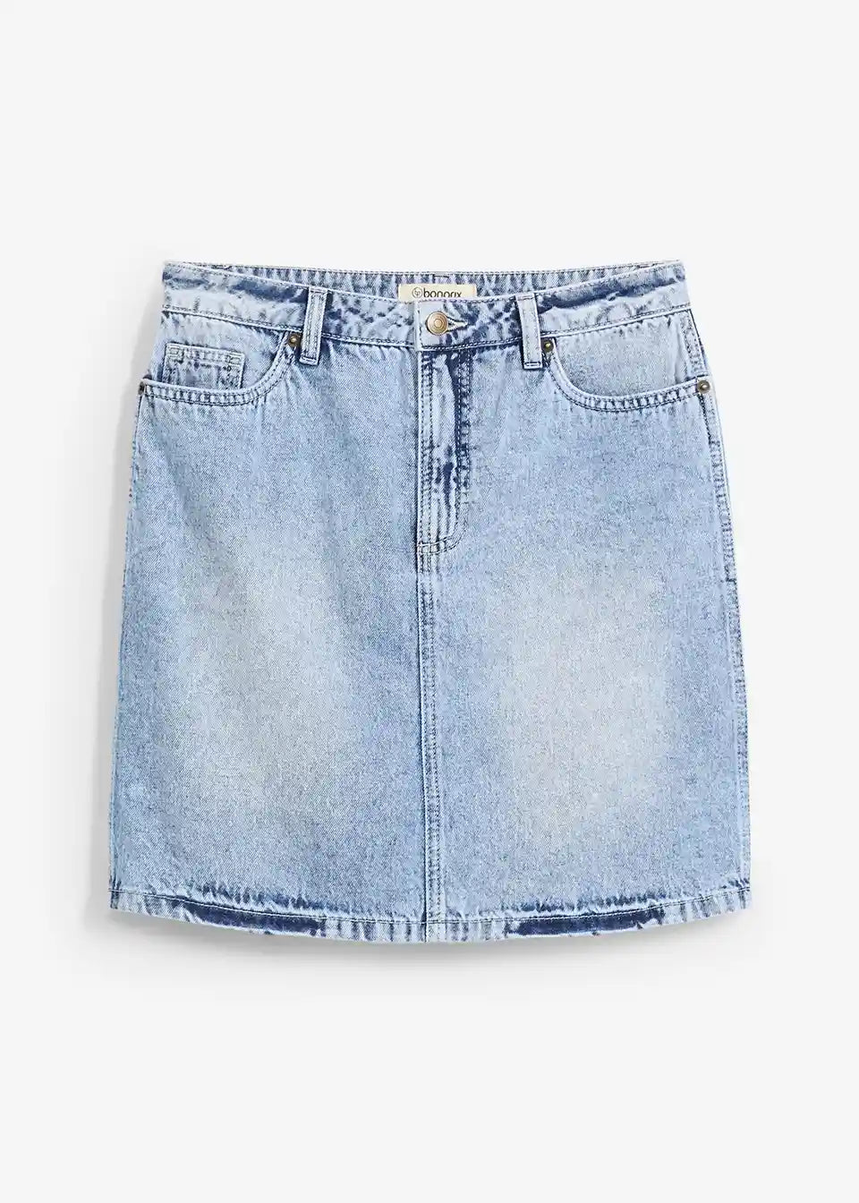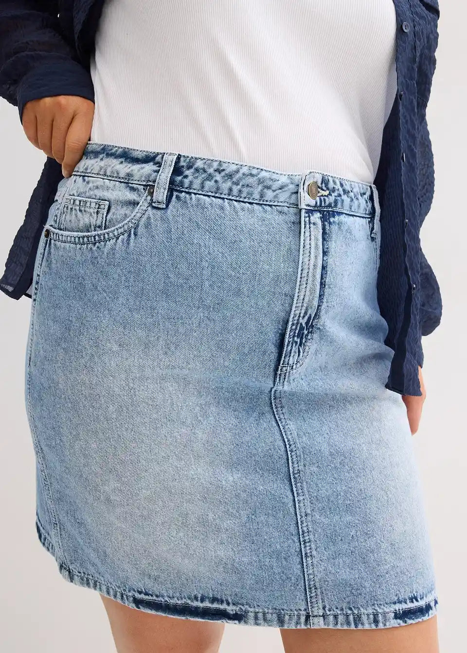 Kratko jeans krilo iz trdnega bombažnega jeansa, ki je sprva nekoliko togo, z nošenjem pa postane mehkejše in bolj prilagodljivo. Dolžina v velikosti 42 pribl. 50 cm, primerno za pranje v pralnem stroju.