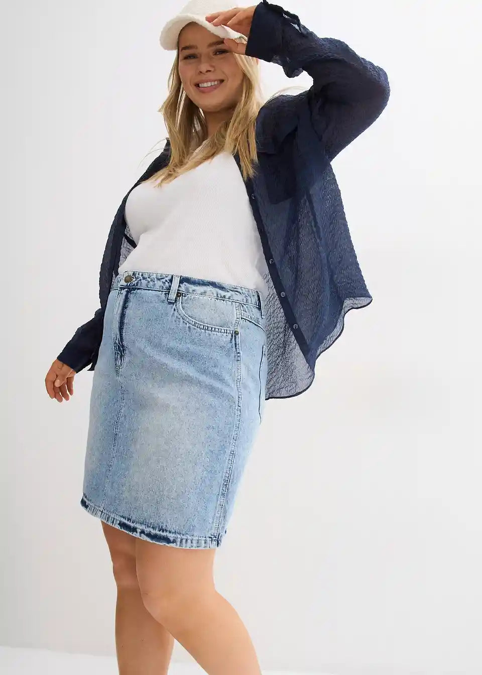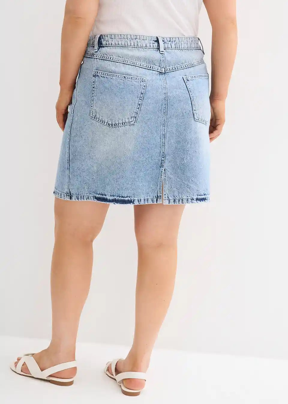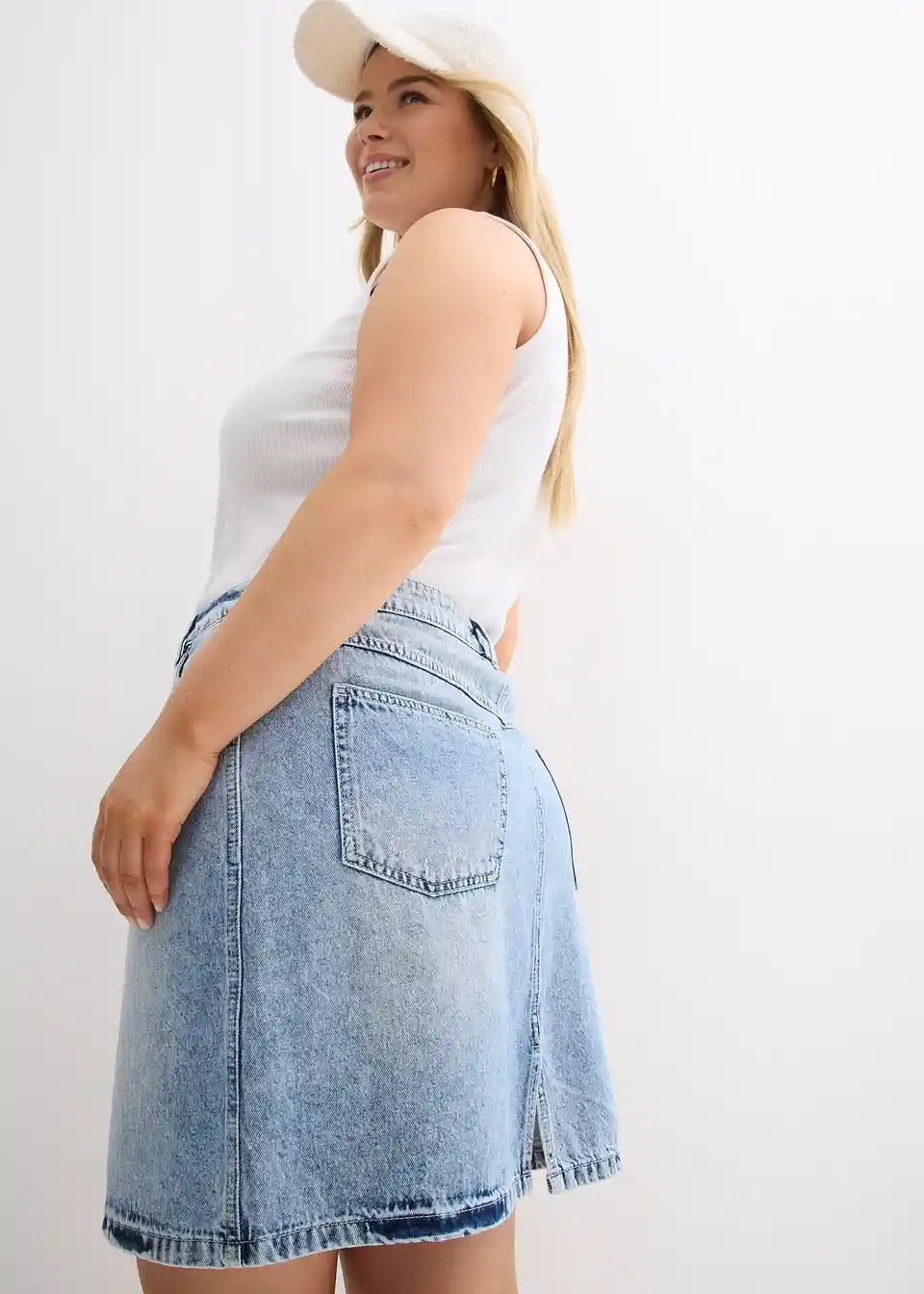 Kratko jeans krilo iz trdnega bombažnega jeansa, ki je sprva nekoliko togo, z nošenjem pa postane mehkejše in bolj prilagodljivo. Dolžina v velikosti 42 pribl. 50 cm, primerno za pranje v pralnem stroju.