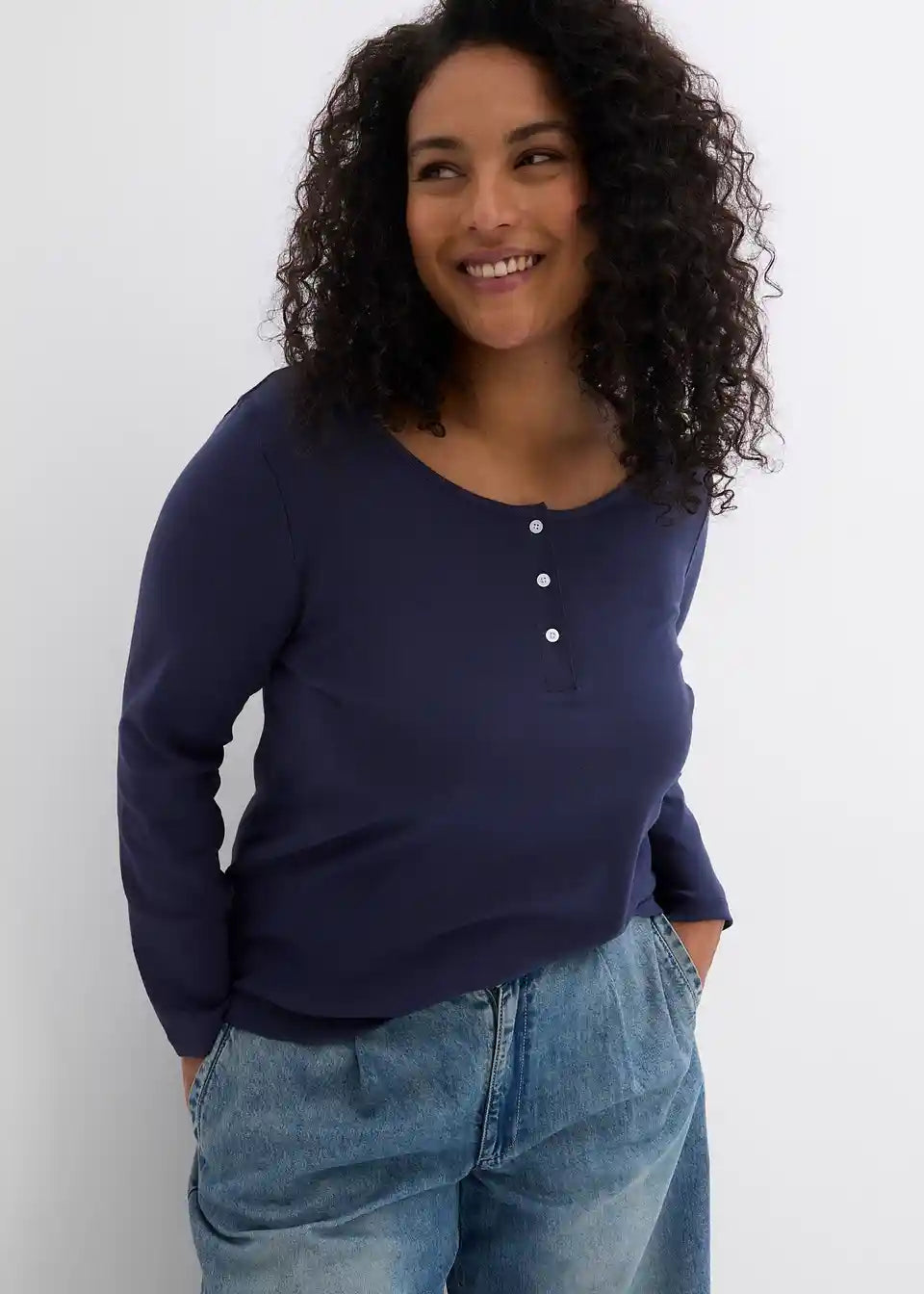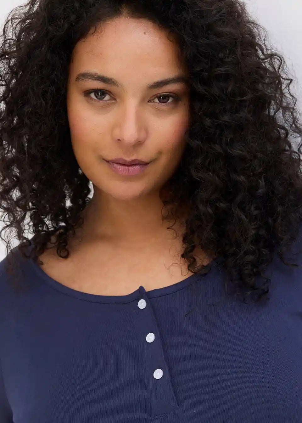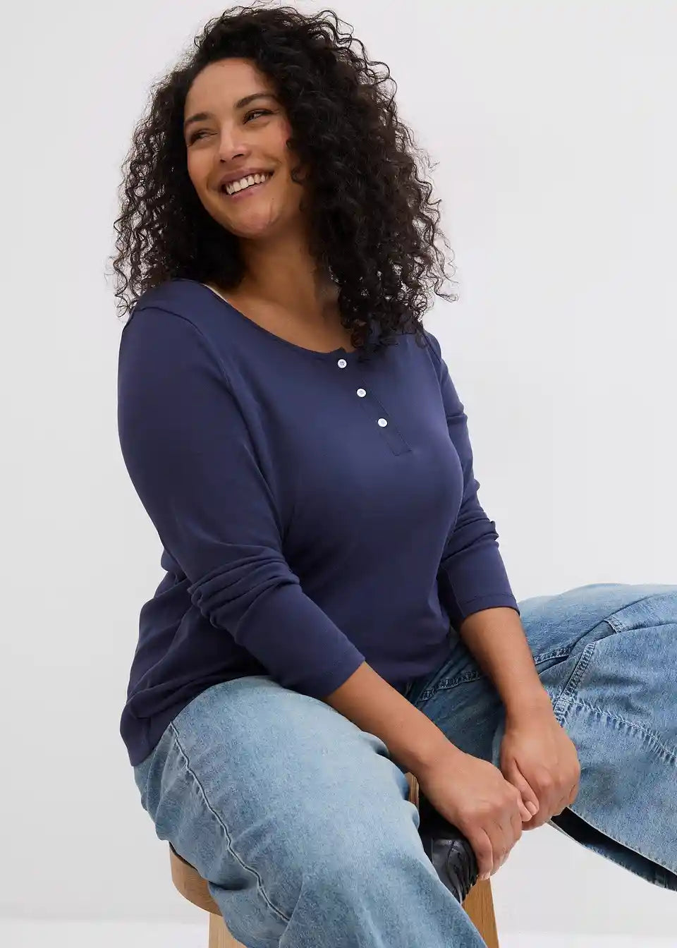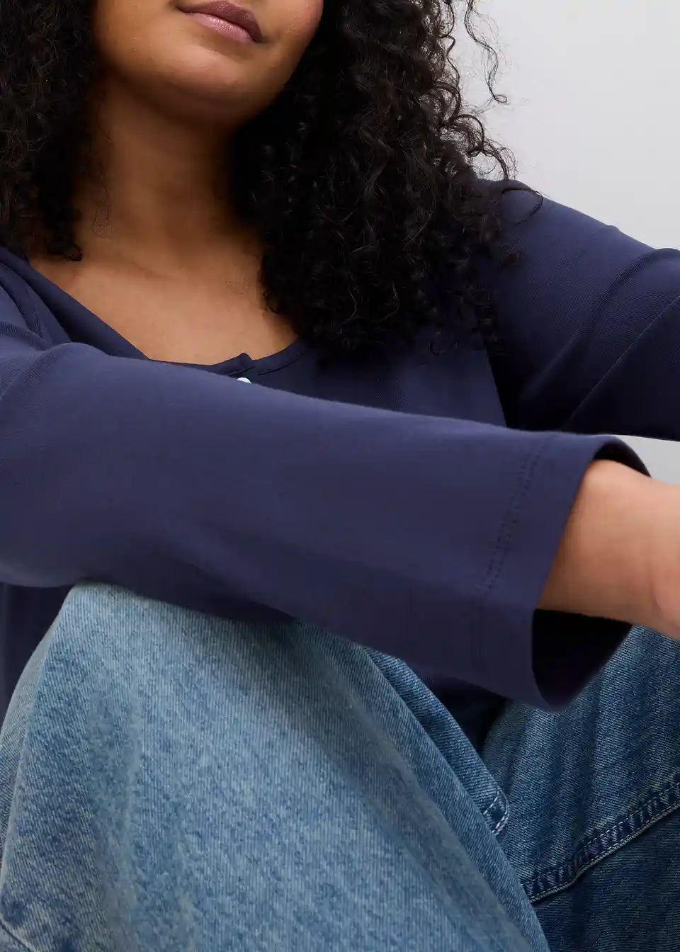 Udobna majica z dolgimi rokavi iz organskega bombaža z zapenjanjem na gumbe. Dolžina pri št. 40/42 pribl. 66 cm, pralna v pralnem stroju.