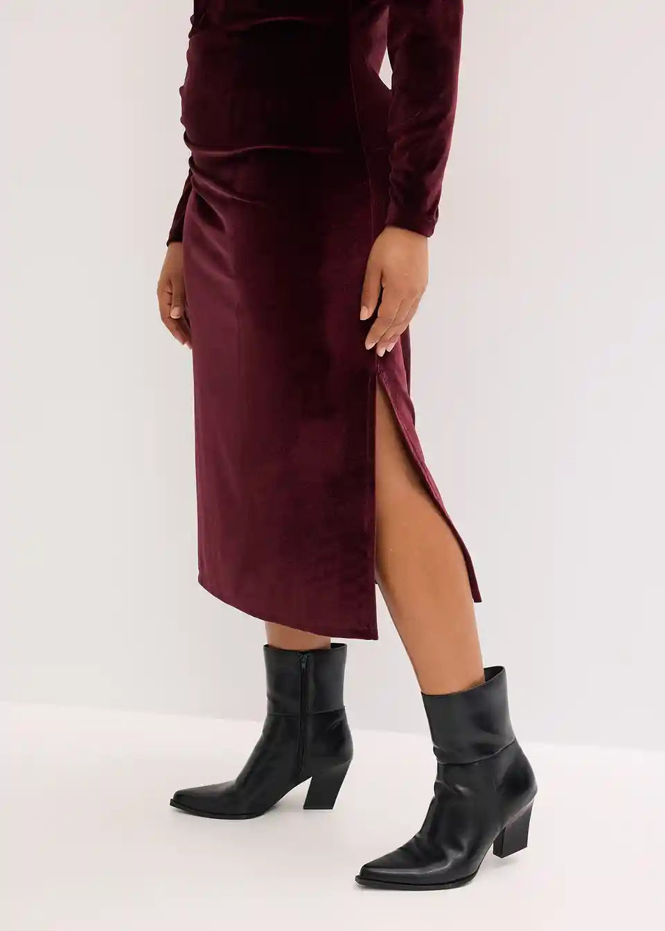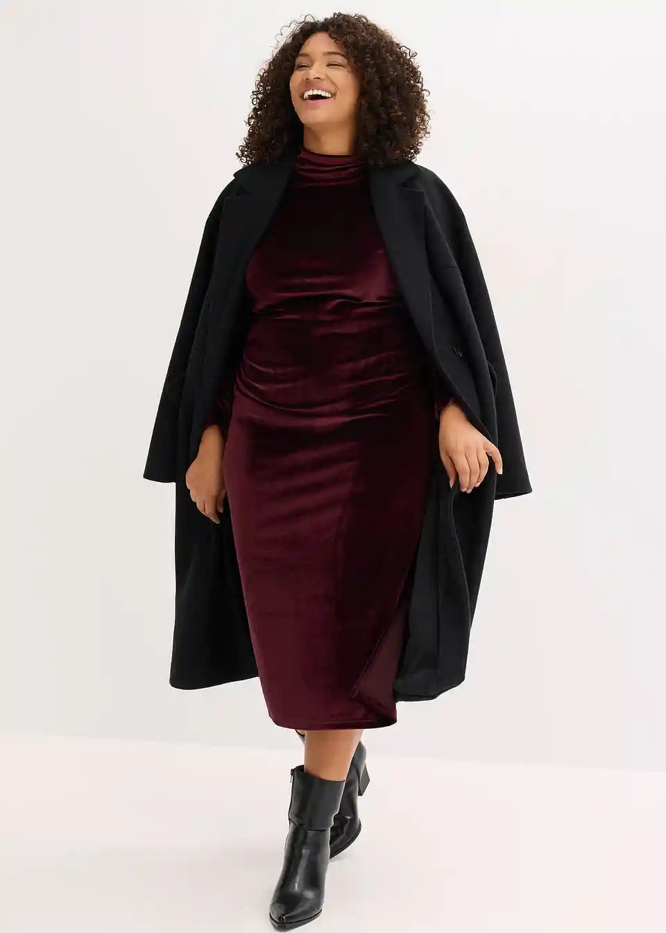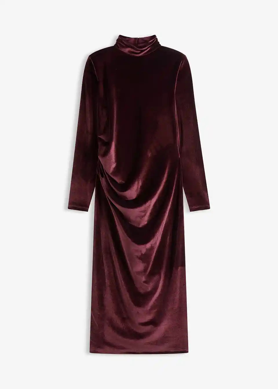 Modna midi obleka iz jerseyja iz mehkega žameta z majhnimi blazinicami na ramah in naborki v pasu