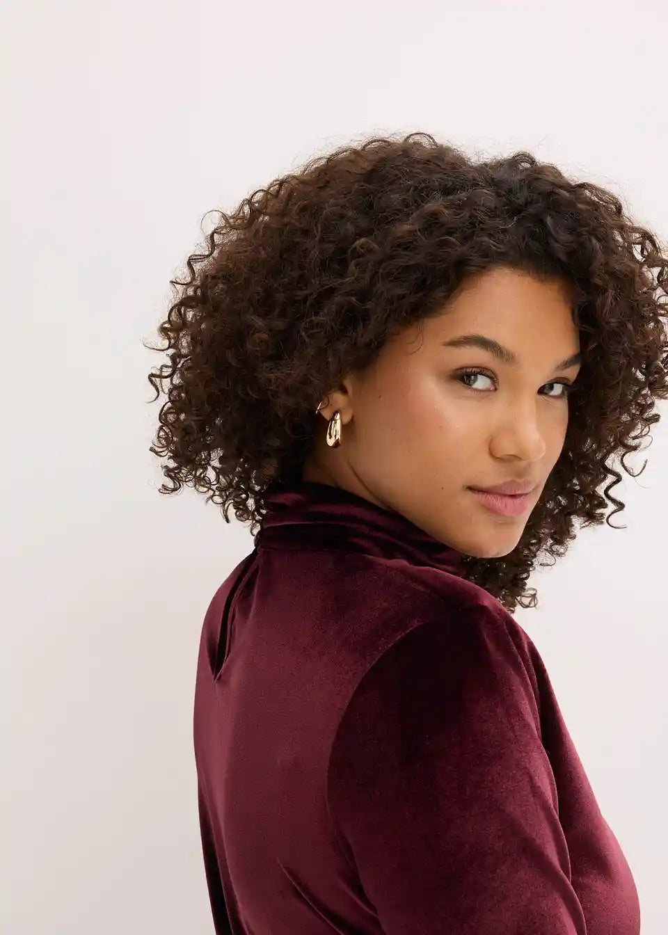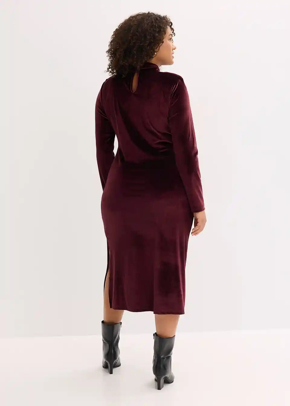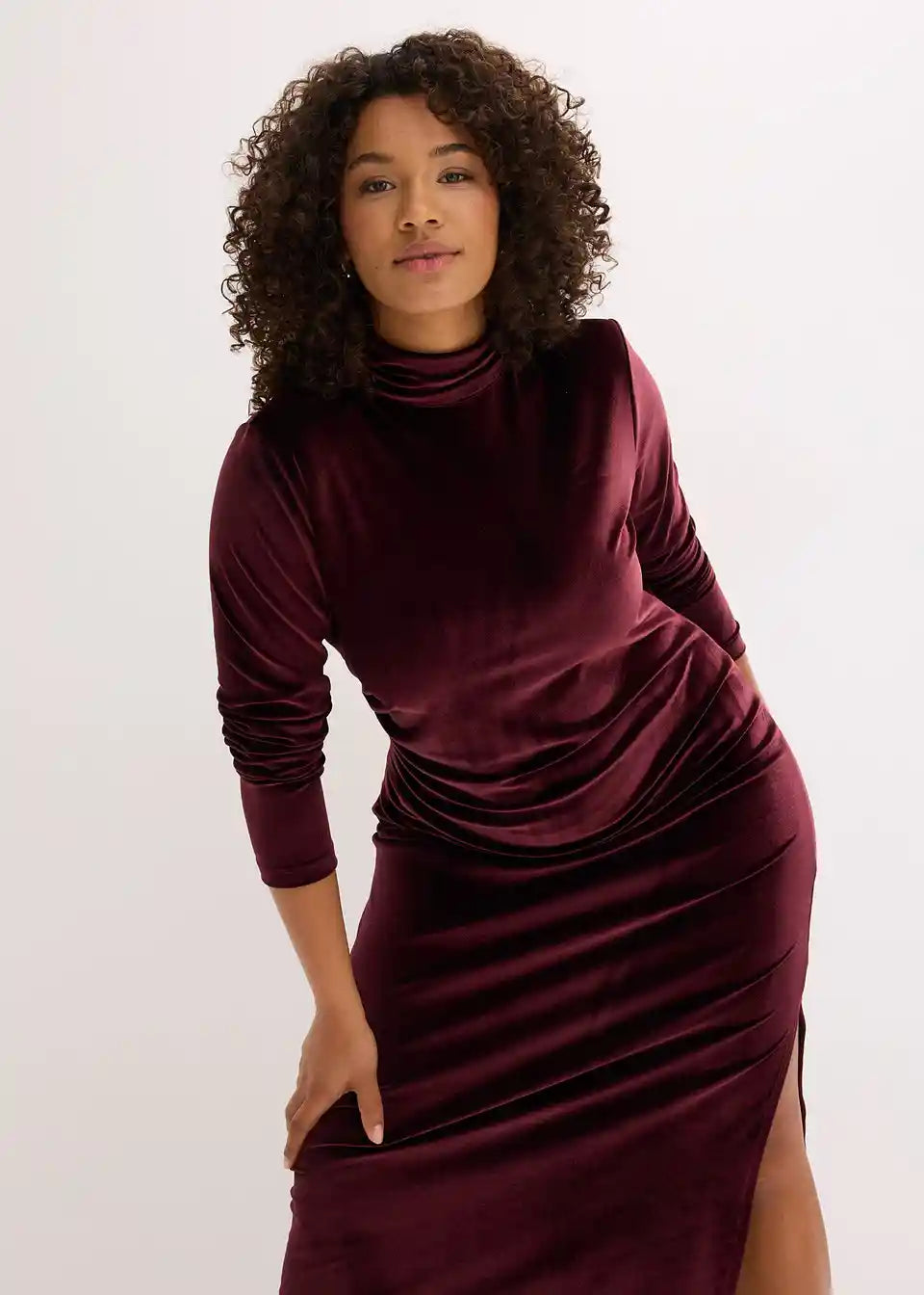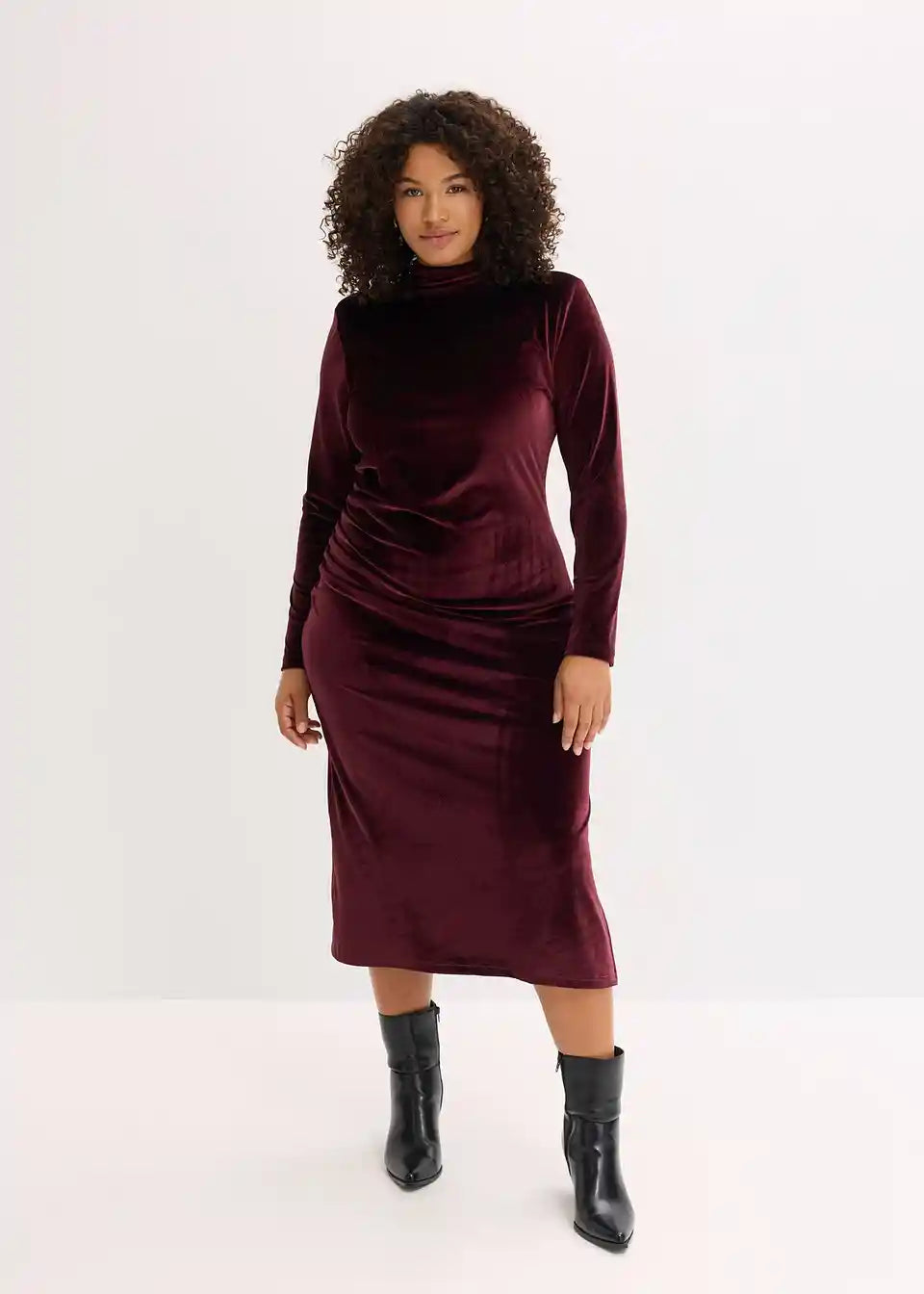 Modna midi obleka iz jerseyja iz mehkega žameta z majhnimi blazinicami na ramah in naborki v pasu