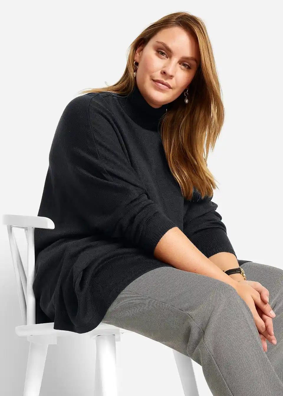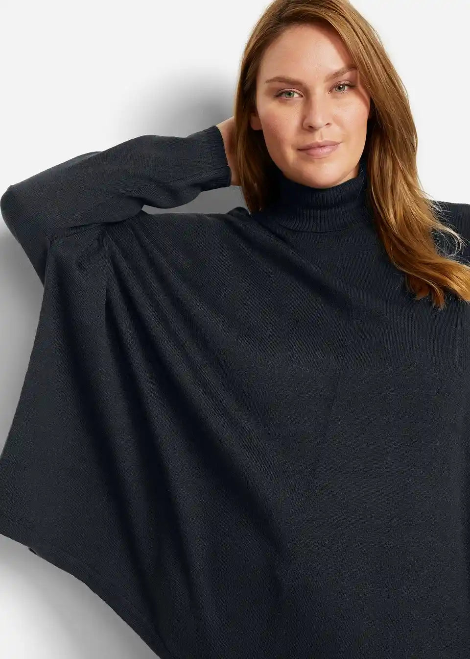Ohlapen pončo-pulover s puli ovratnikom v asimetričnem kroju
