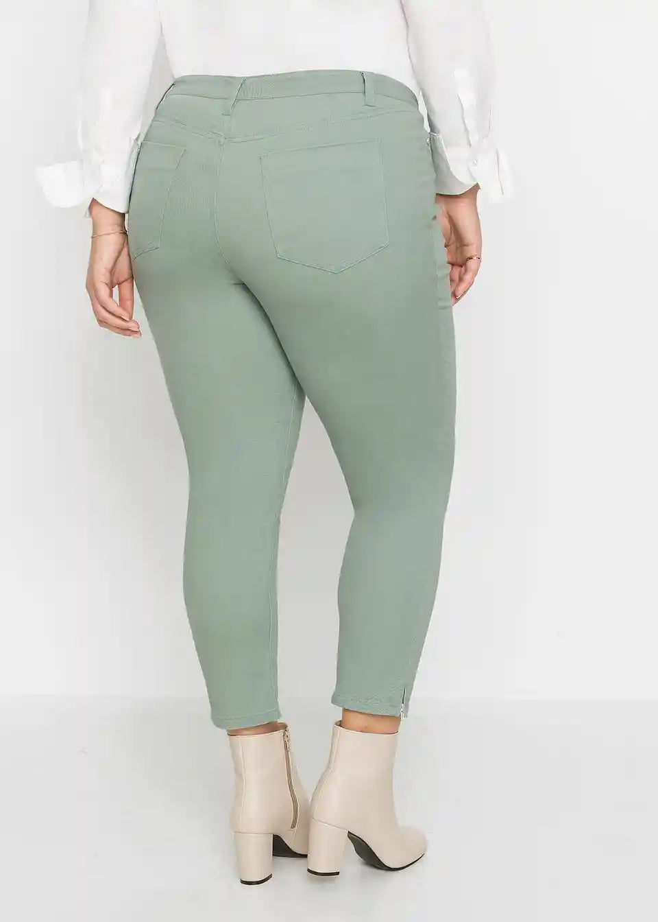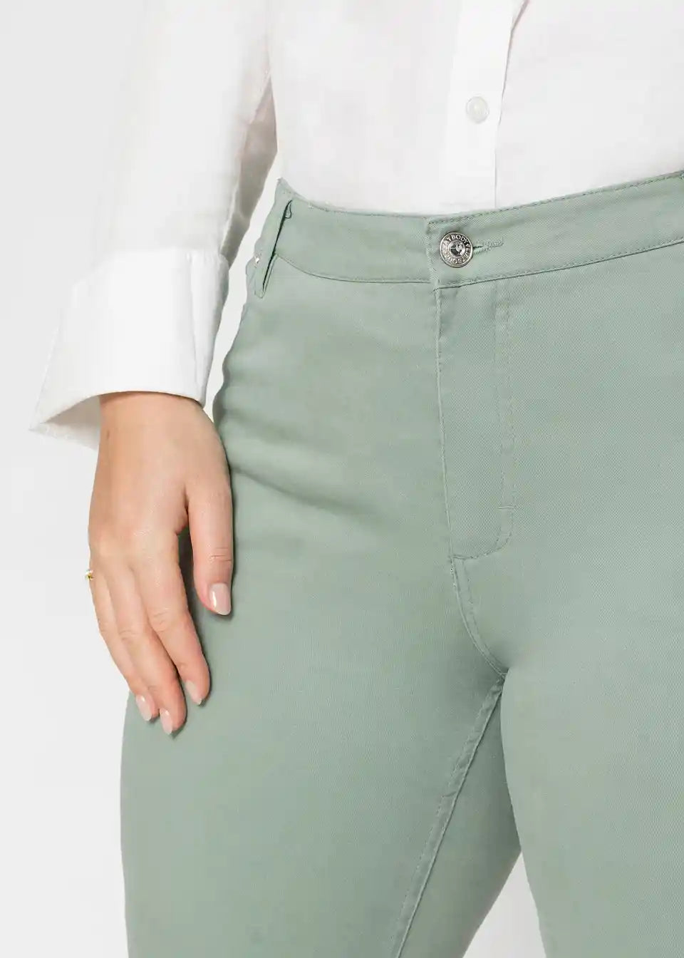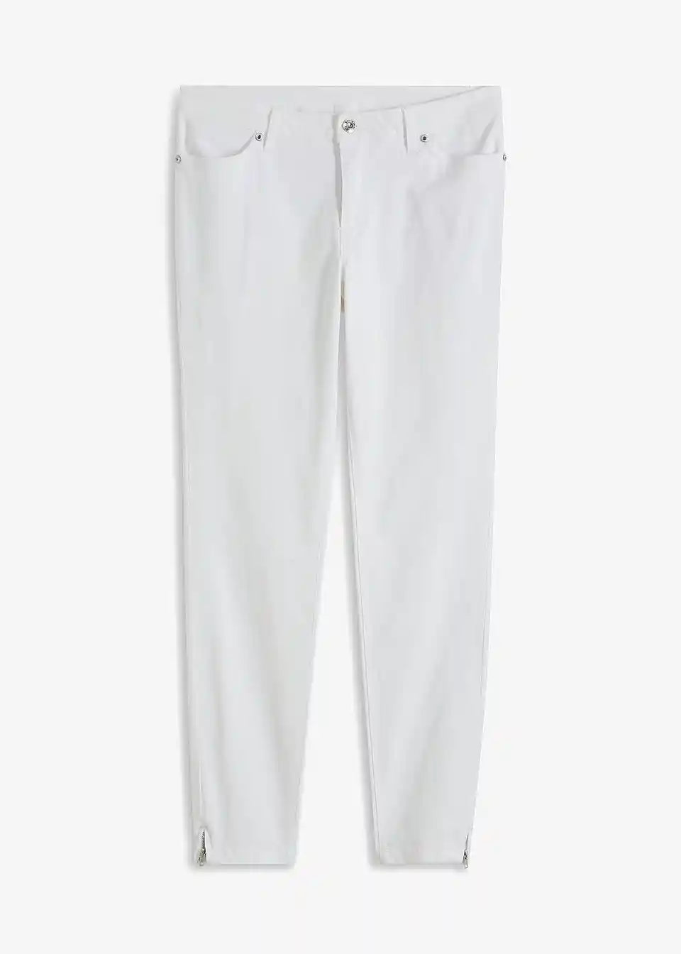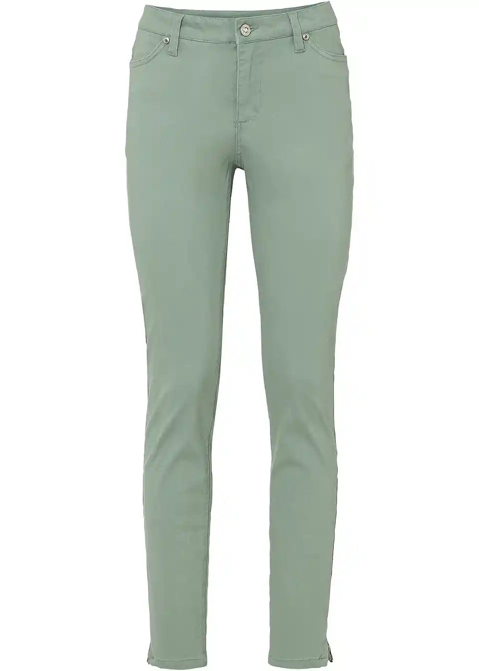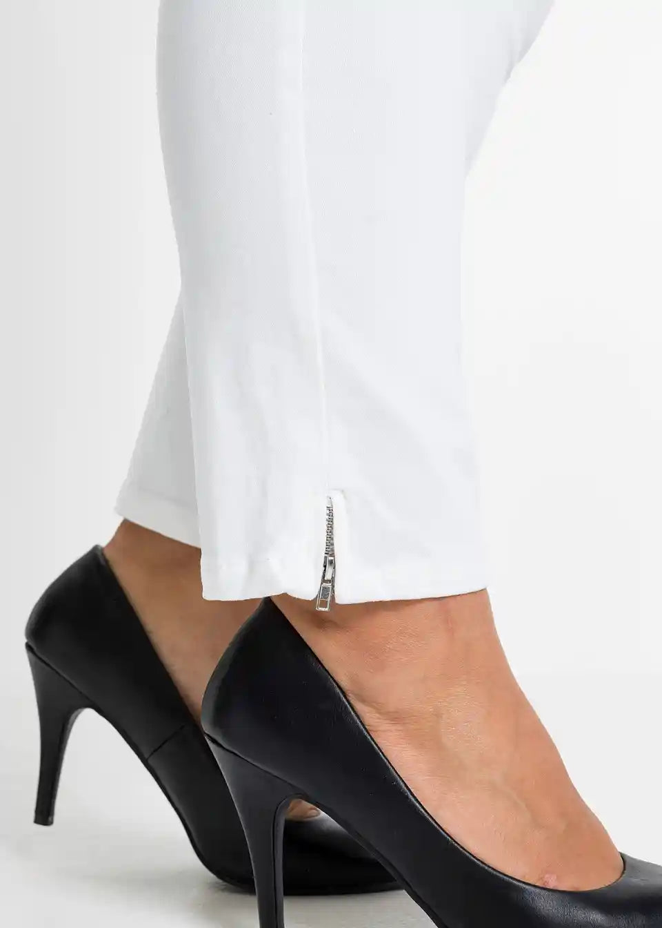Ozko krojene raztegljive hlače s štirimi žepi navdušijo s svojo vsestranskostjo v kombiniranju. Majhne zadrge na zaključku hlačnic poskrbijo za modni poudarek. Privlačen model znamke BODYFLIRT predstavlja osnovo za raznolike stajlinge. Elegantni videz je mogoče doseči s srajco, suknjičem in čevlji s peto. Sproščen pridih pa hlače pridobijo s prostorno pleteno jopico v oversize kroju in kovinskimi škornji. Za igriv čar poskrbi tunika s pisanimi vzorci.