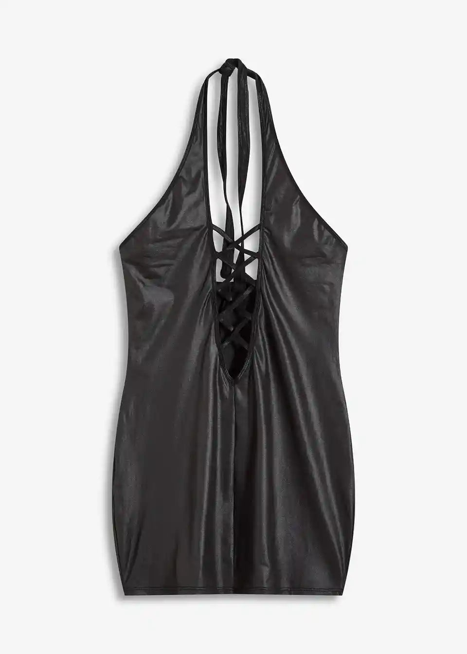 Obleka z naramnicami na zatilju v mokrem videzu z okrasnimi trakovi.