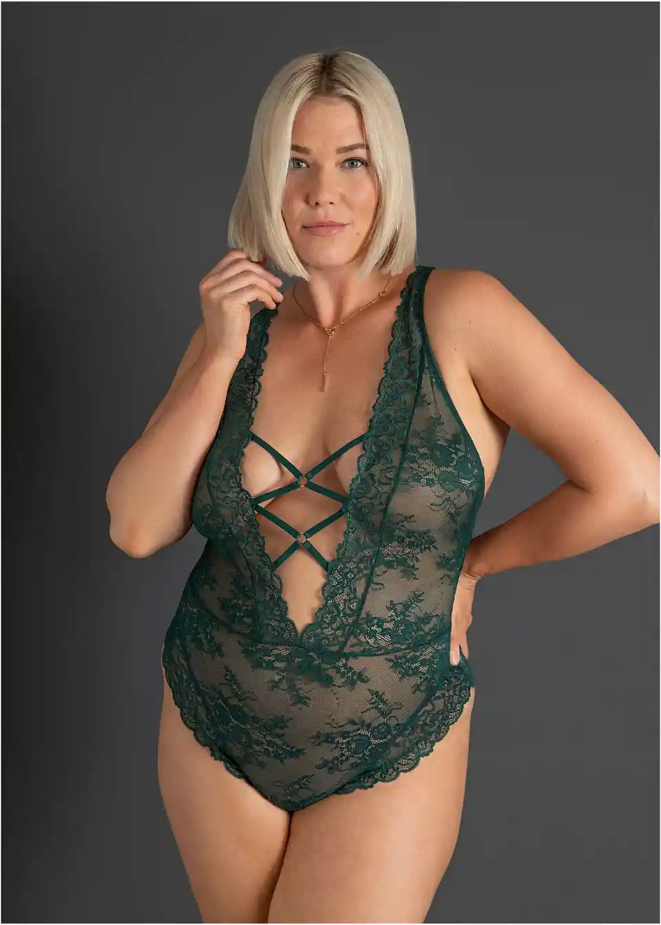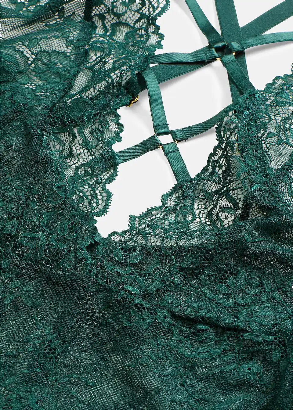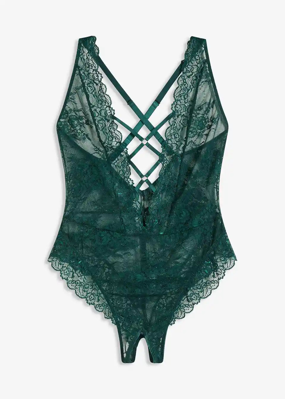 Bodi z odprtino iz fine čipke z okrasnimi obročki.