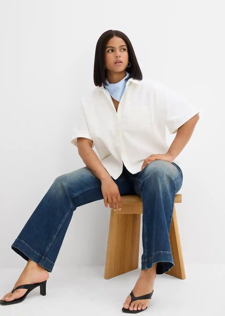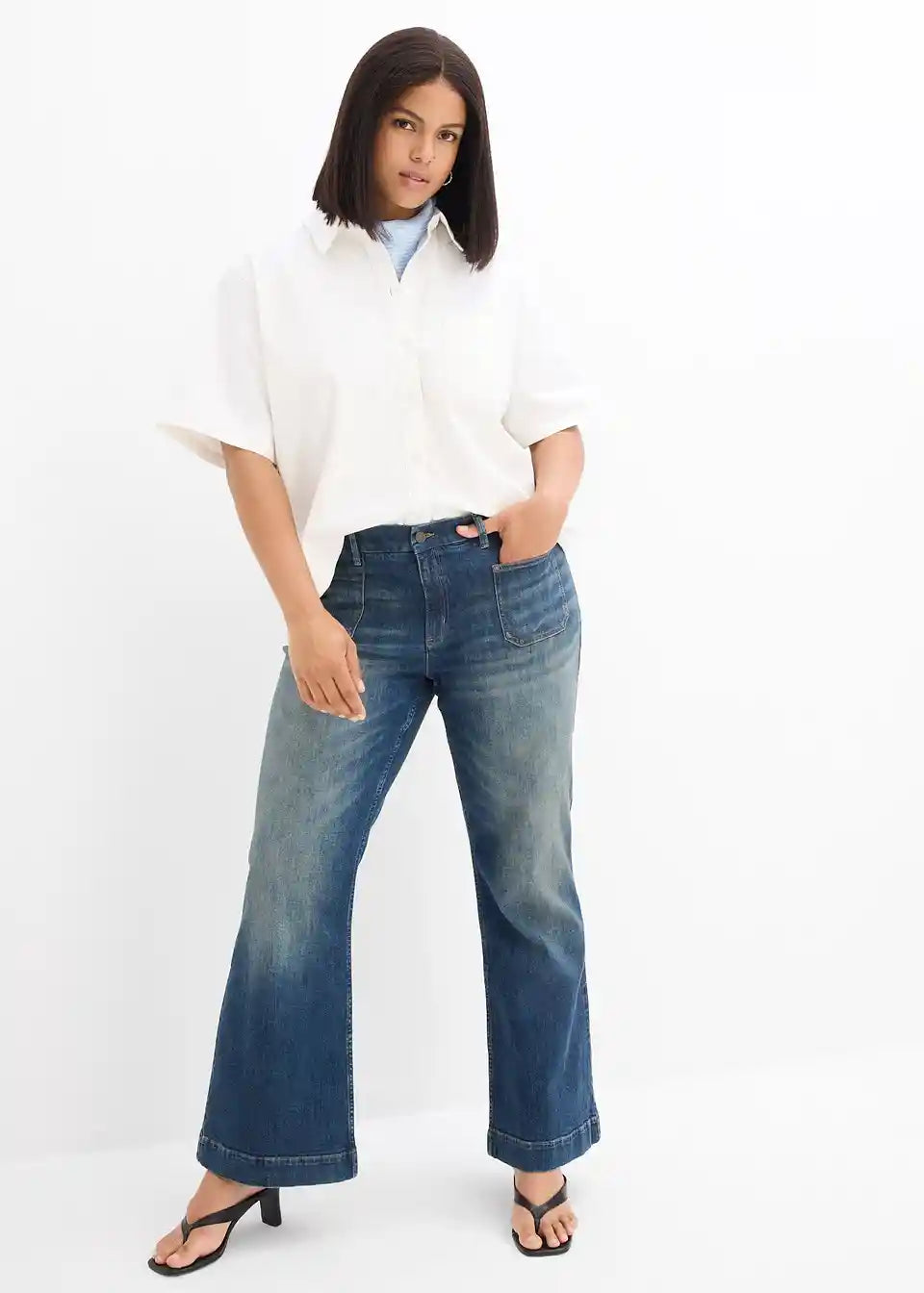 Kavbojke na zvonec s 5 žepi iz čvrstega bombažnega denima, ki je na začetku nekoliko tog, z nošenjem pa postane mehkejši in bolj sproščen. Visok pas z zadrgo in gumbom. Dolga dolžina, ki na stopalu ustvari rahel nabran učinek. Te jeans hlače imajo zaradi spranega videza moderen ponošen učinek. Rahlo razbarvanje med nošenjem in pranjem je značilno za te kavbojke. Dolžina v koraku pri velikosti 42 ca. 80,5 cm. Strojno pranje.