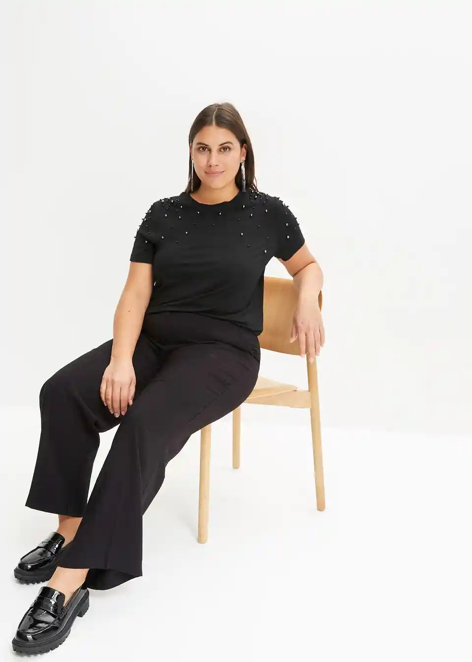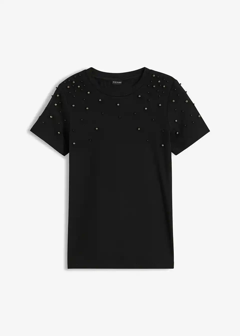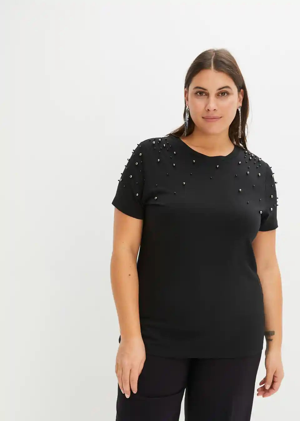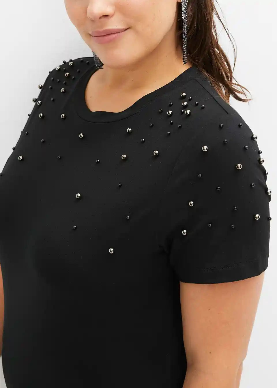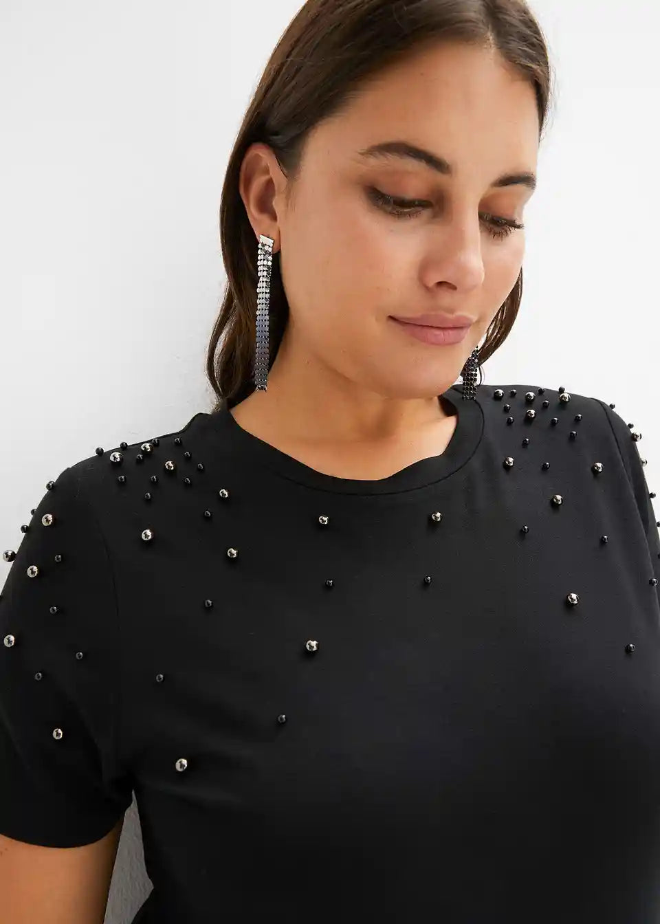 Elegantna majica z aplikacijo iz biserov na sprednji strani