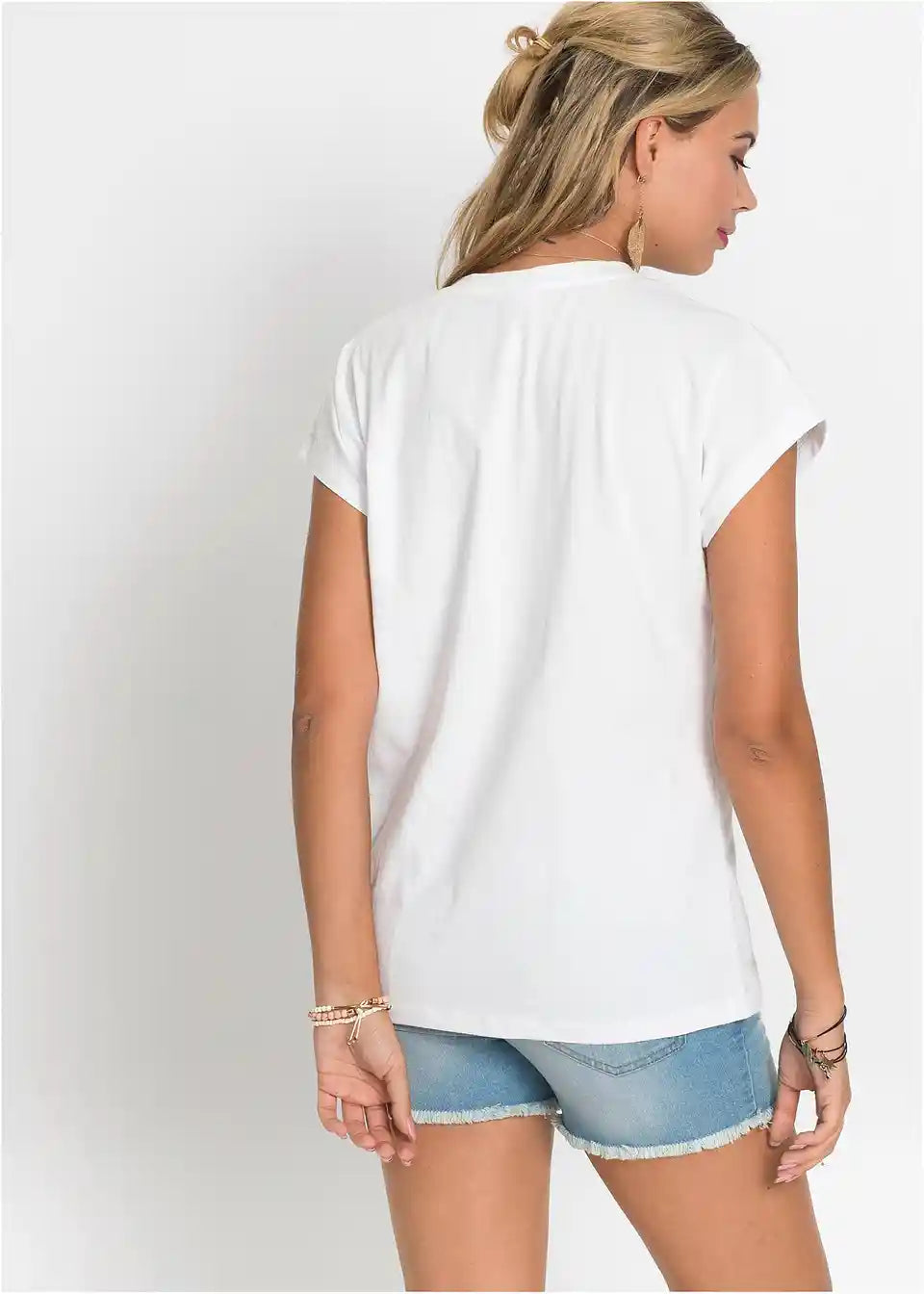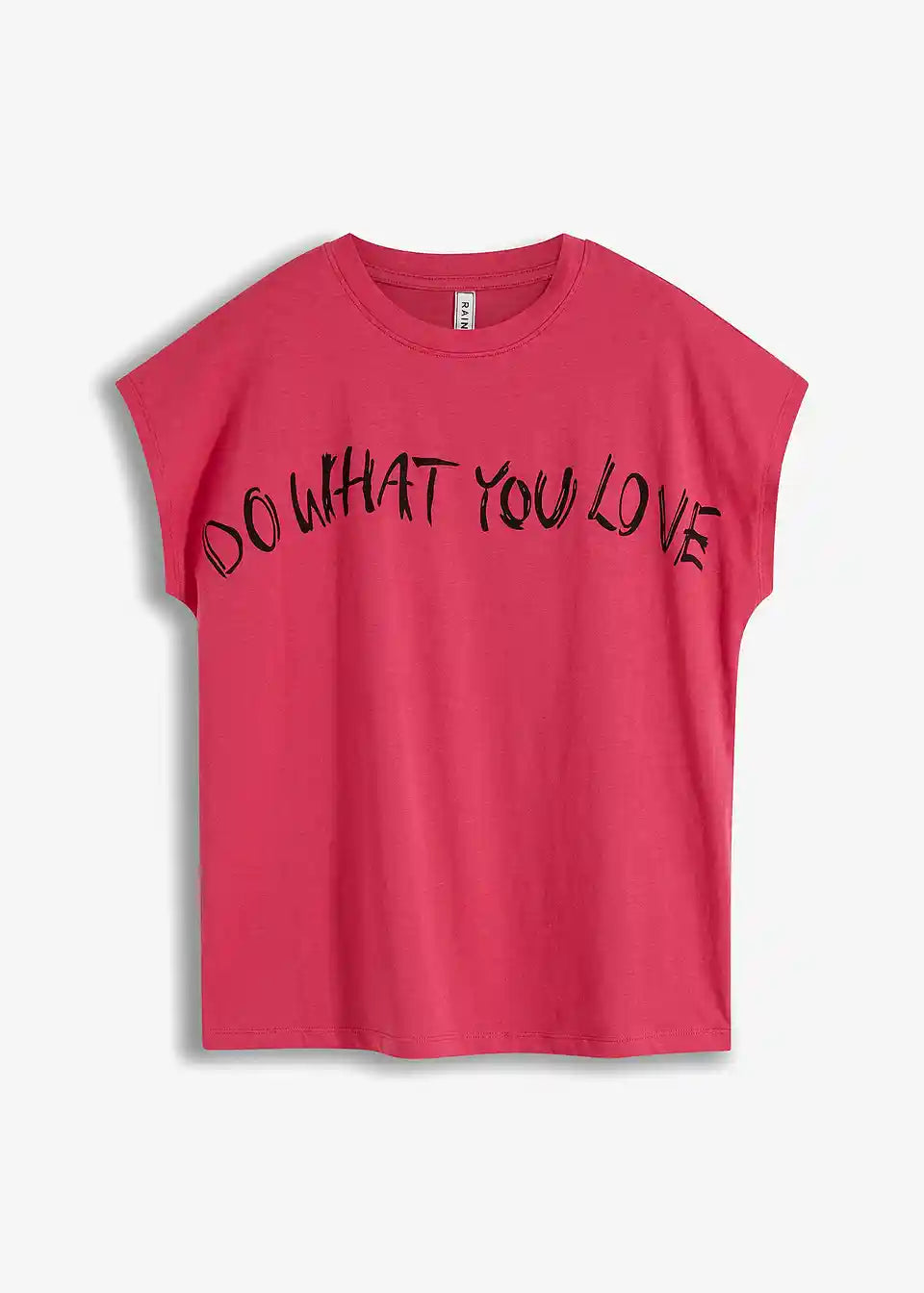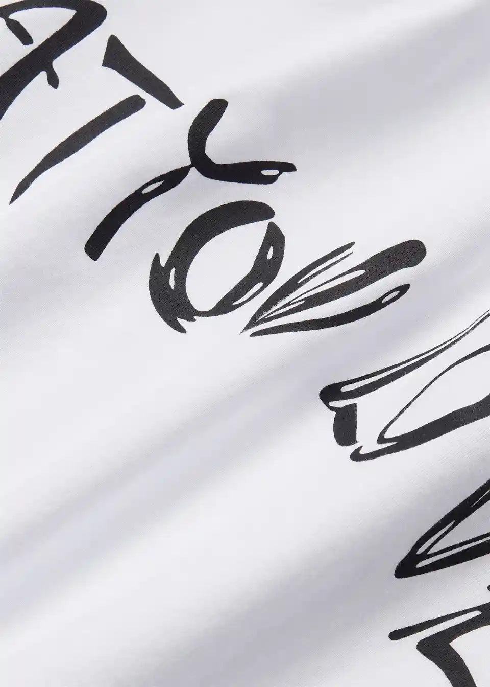 Spuščena ramena in ohlapen kroj poskrbita za videz oversize pri tej majici. Kul napis na višini prsi se odlično poda k tej zasnovi. Trendovske kratke hlače z resastim robom ali ozke kavbojke z uničenimi učinki poudarijo sproščenost modnega modela. Stilni kontrast doseže prevelika majica s kombinacijo minikrila in sandalov z lesenim podplatom.