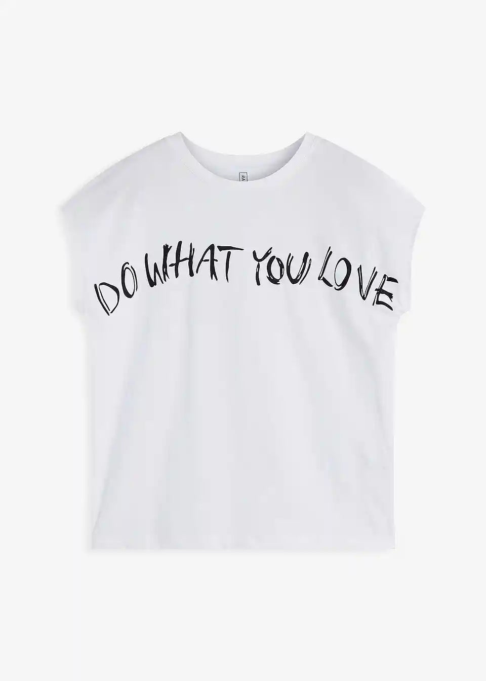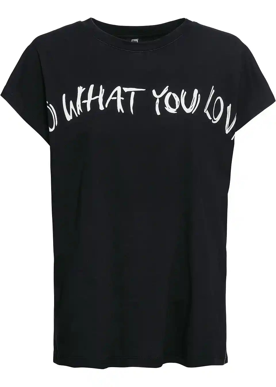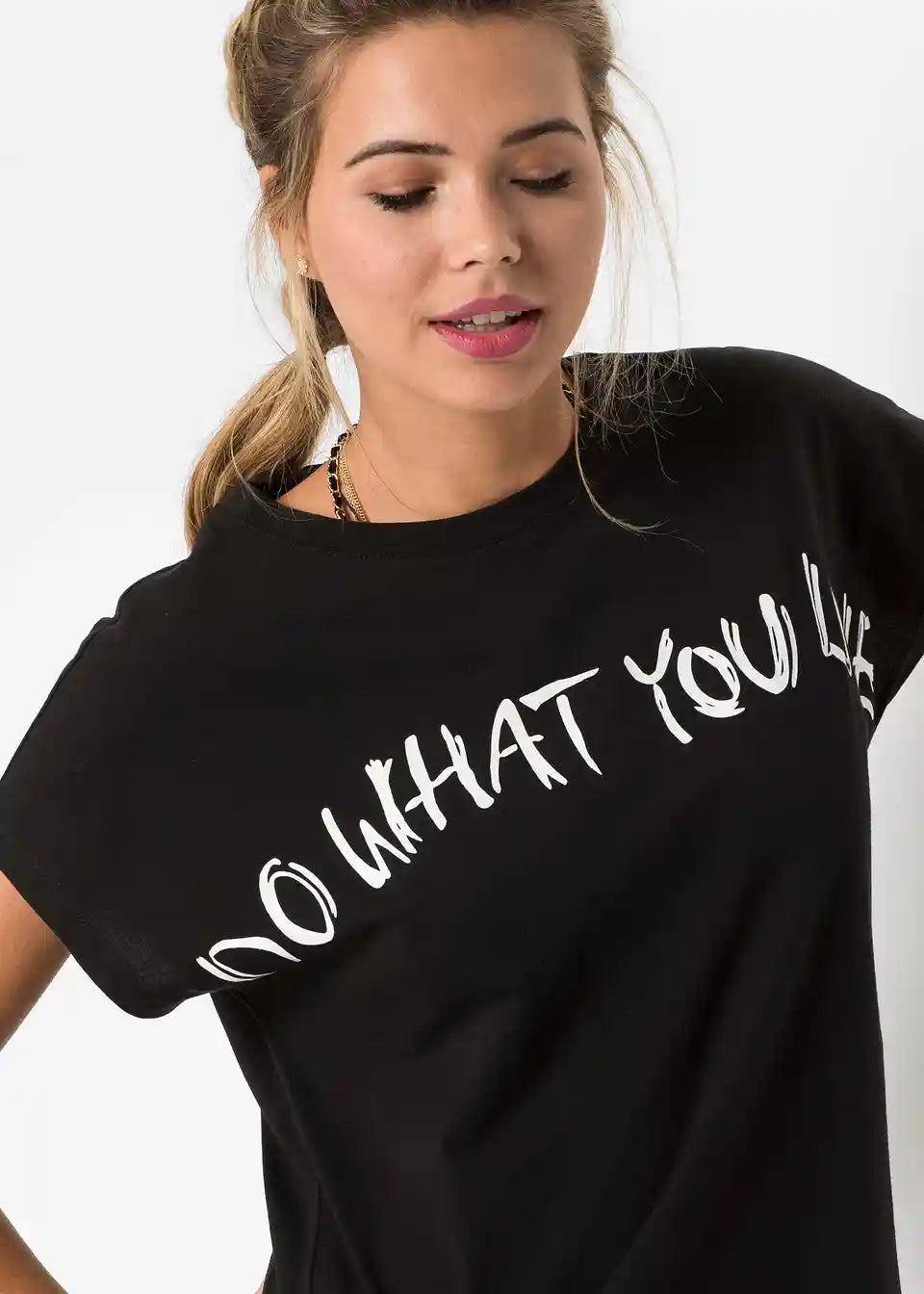 Spuščena ramena in ohlapen kroj poskrbita za videz oversize pri tej majici. Kul napis na višini prsi se odlično poda k tej zasnovi. Trendovske kratke hlače z resastim robom ali ozke kavbojke z uničenimi učinki poudarijo sproščenost modnega modela. Stilni kontrast doseže prevelika majica s kombinacijo minikrila in sandalov z lesenim podplatom.