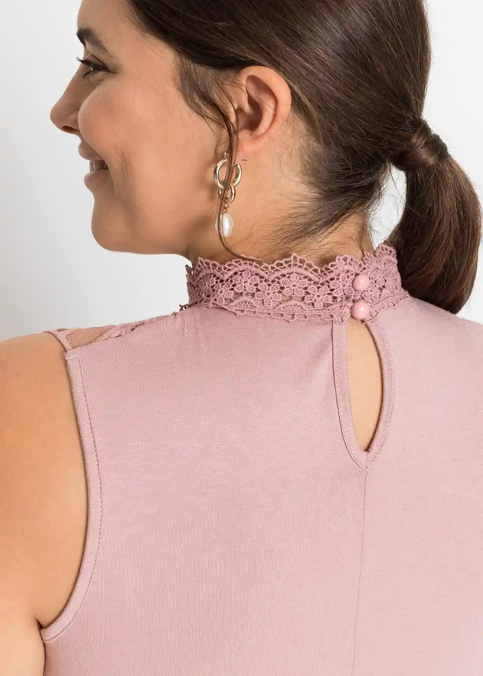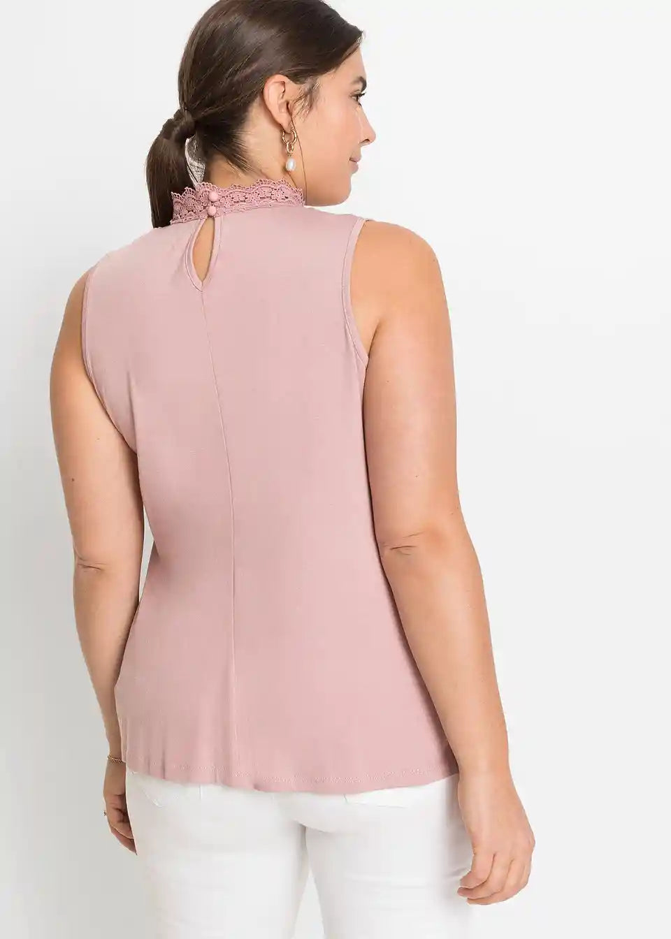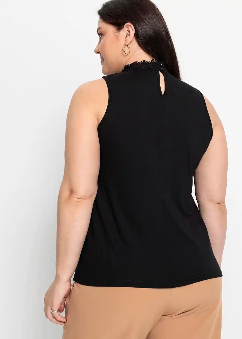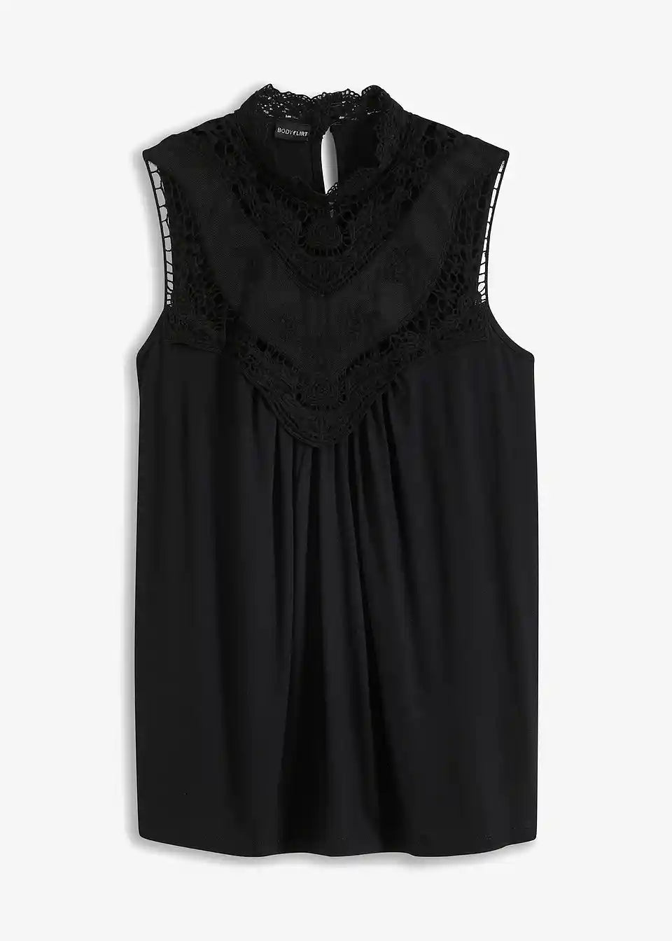 Ta brezrokavna srajčna bluza znamke BODYFLIRT očara z elegantnim dizajnom. Odlikuje jo mehko padajoč material z lahkotnim krojem. Izrez je okrašen z elegantnim čipkastim vložkom, ki bluzo dopolnjuje z romantičnim pridihom. Poseben poudarek je majhen stoječ ovratnik, ki se na hrbtnem delu zapenja s paščkom na gumb.