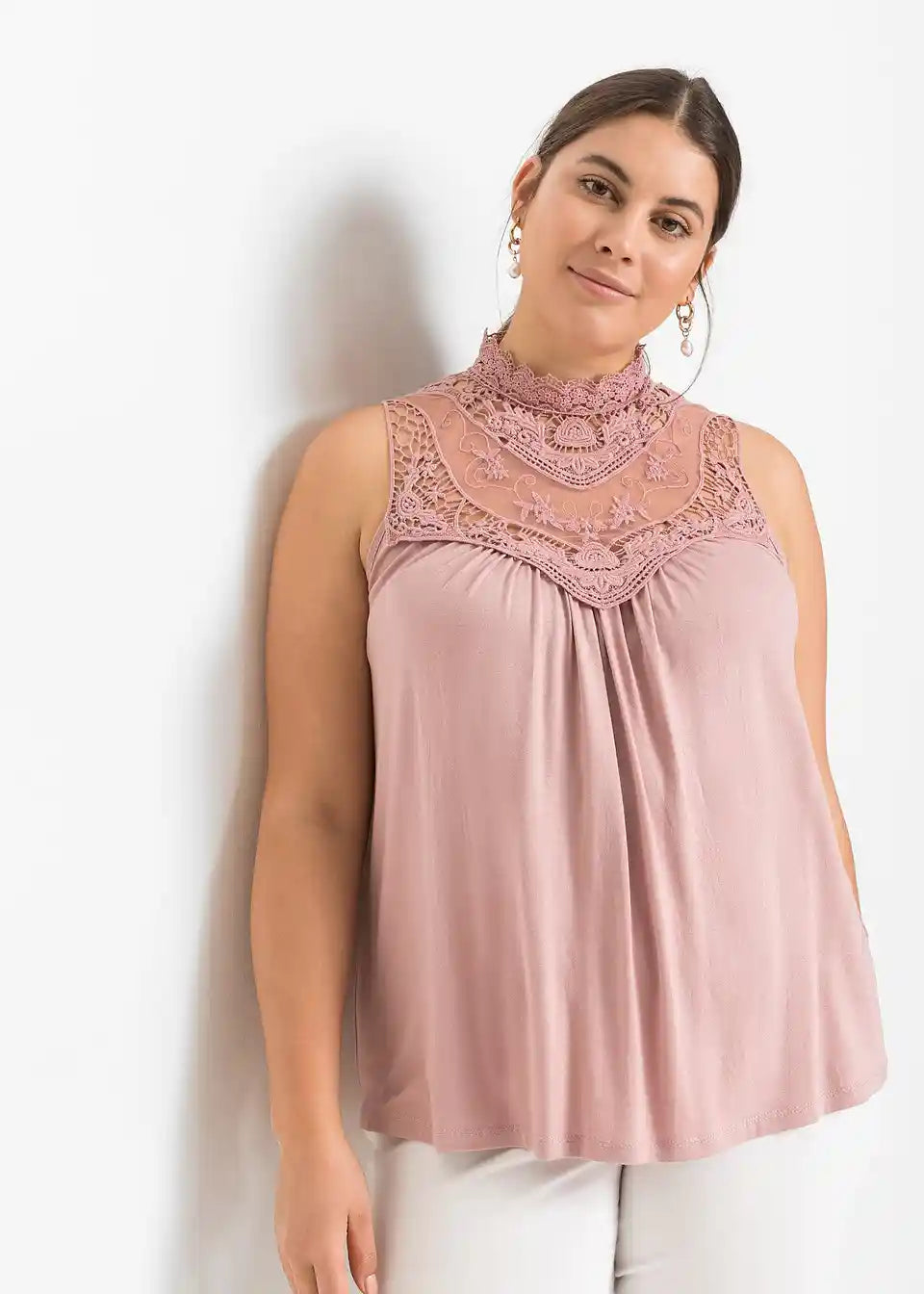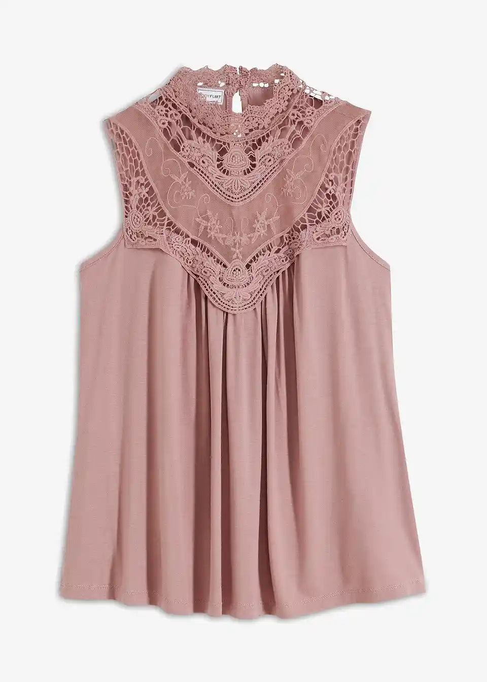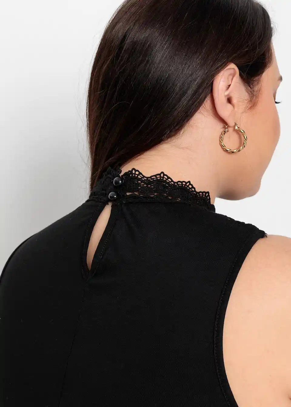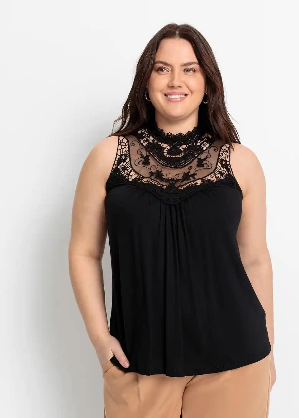 Ta brezrokavna srajčna bluza znamke BODYFLIRT očara z elegantnim dizajnom. Odlikuje jo mehko padajoč material z lahkotnim krojem. Izrez je okrašen z elegantnim čipkastim vložkom, ki bluzo dopolnjuje z romantičnim pridihom. Poseben poudarek je majhen stoječ ovratnik, ki se na hrbtnem delu zapenja s paščkom na gumb.