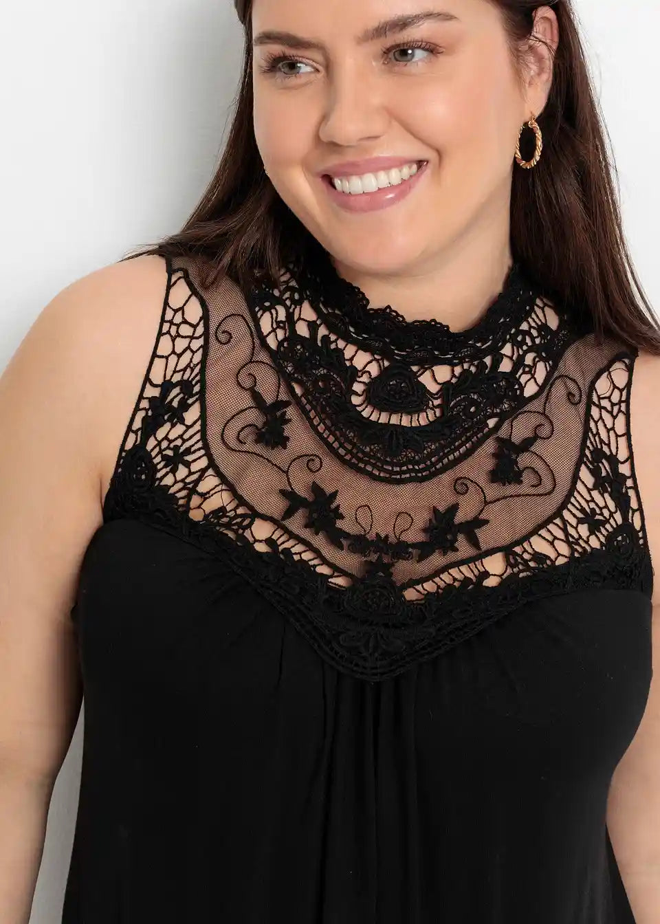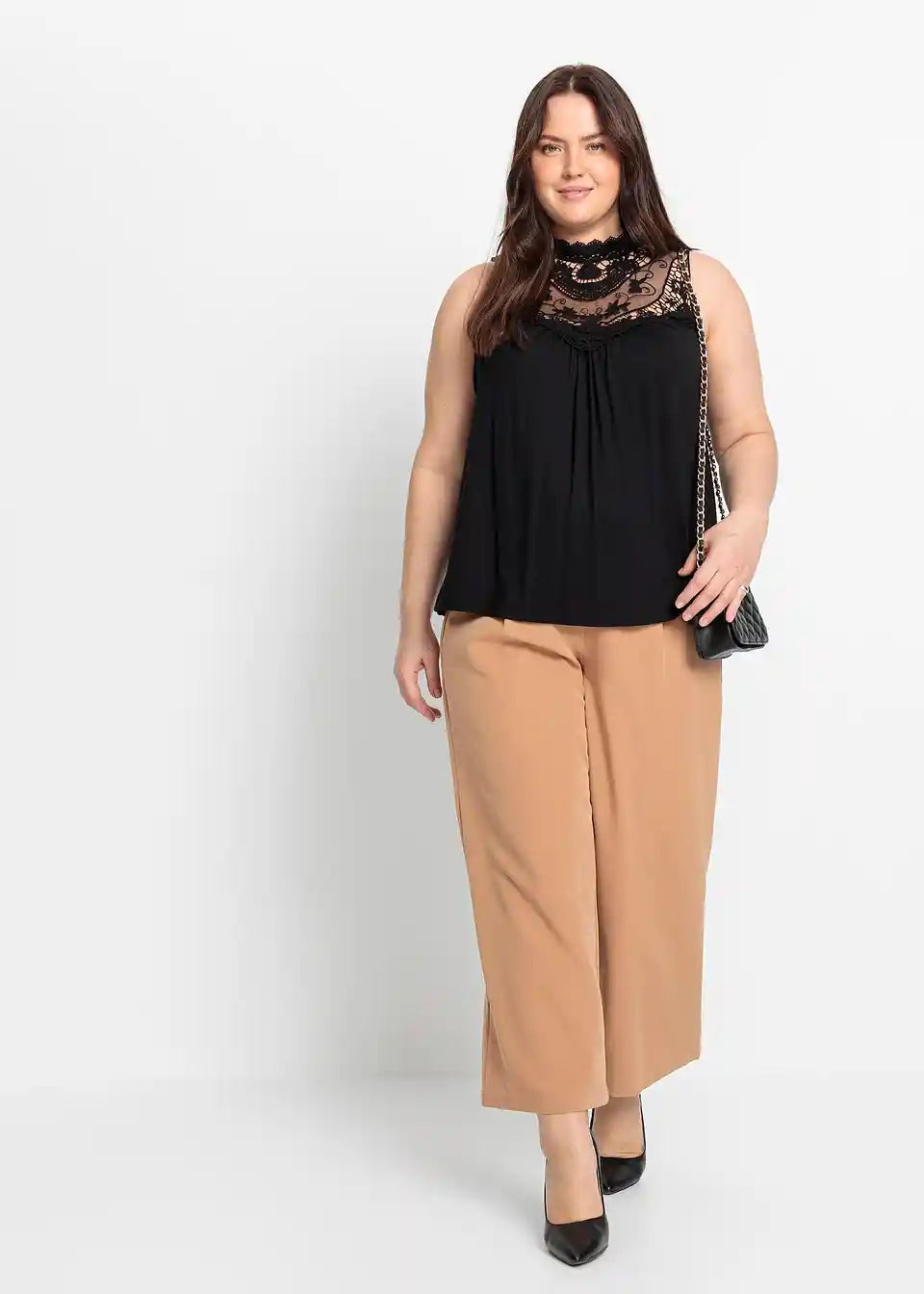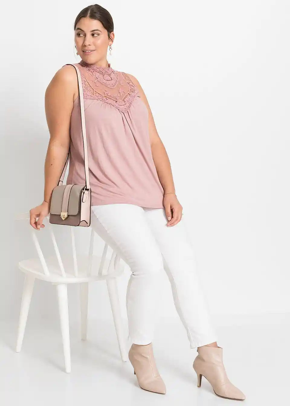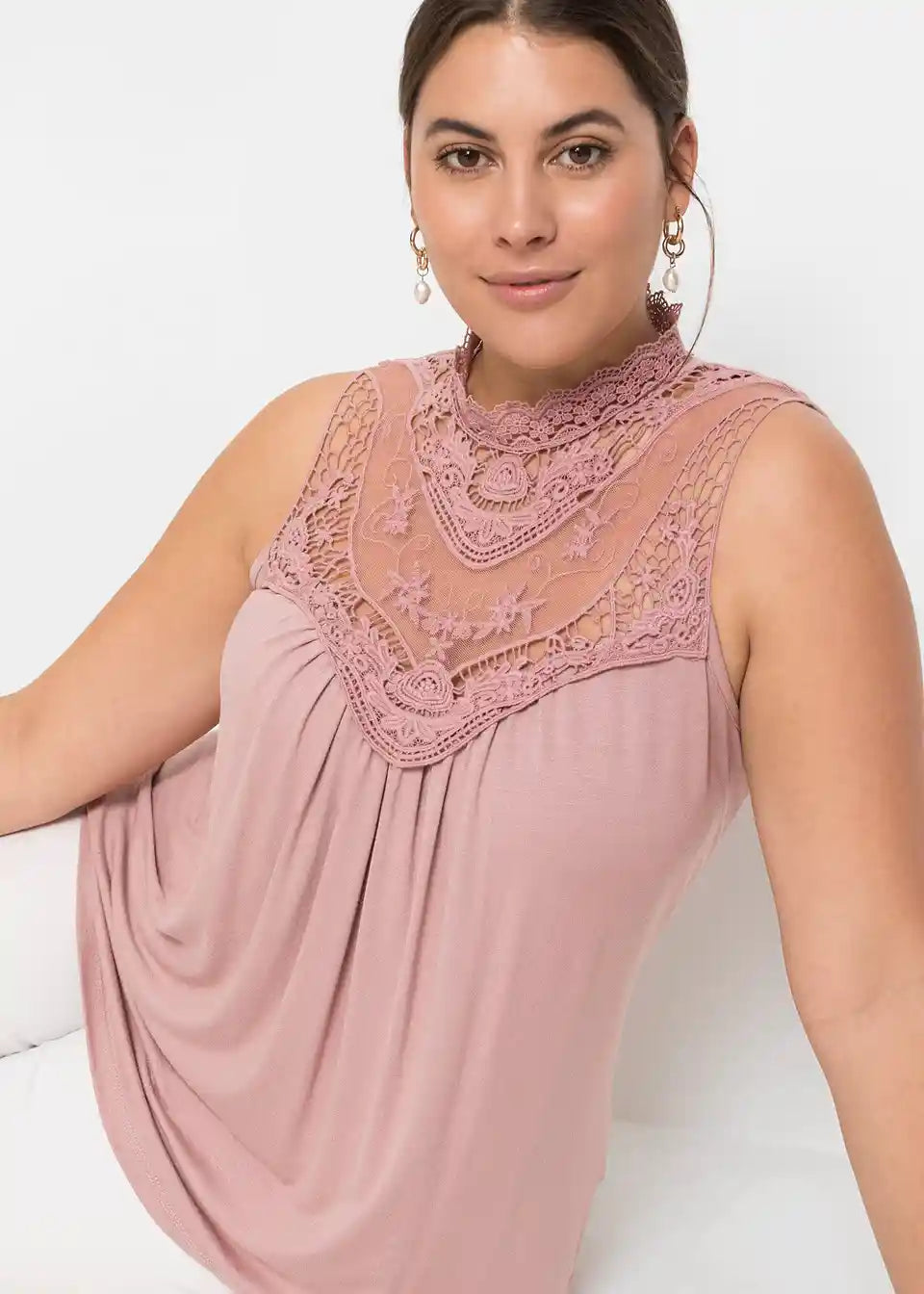 Ta brezrokavna srajčna bluza znamke BODYFLIRT očara z elegantnim dizajnom. Odlikuje jo mehko padajoč material z lahkotnim krojem. Izrez je okrašen z elegantnim čipkastim vložkom, ki bluzo dopolnjuje z romantičnim pridihom. Poseben poudarek je majhen stoječ ovratnik, ki se na hrbtnem delu zapenja s paščkom na gumb.